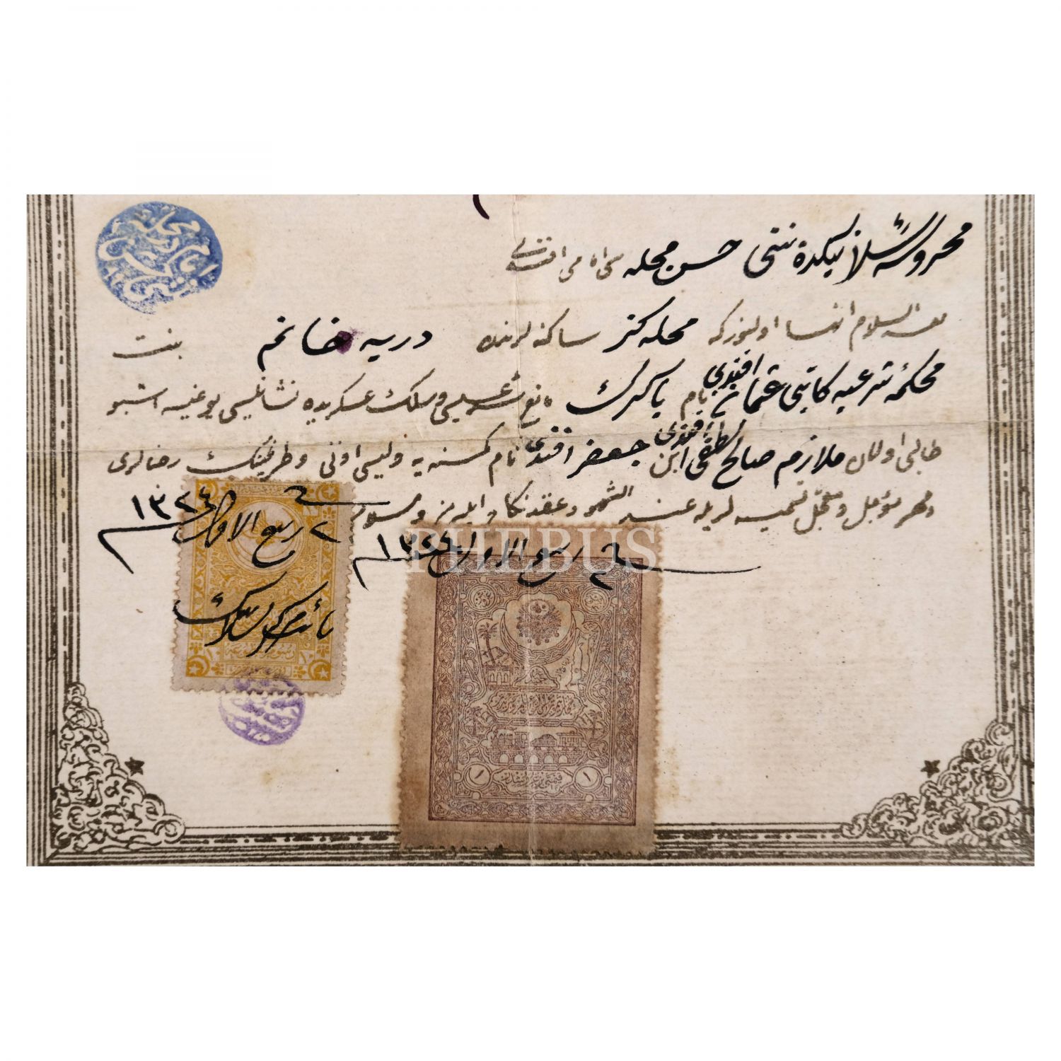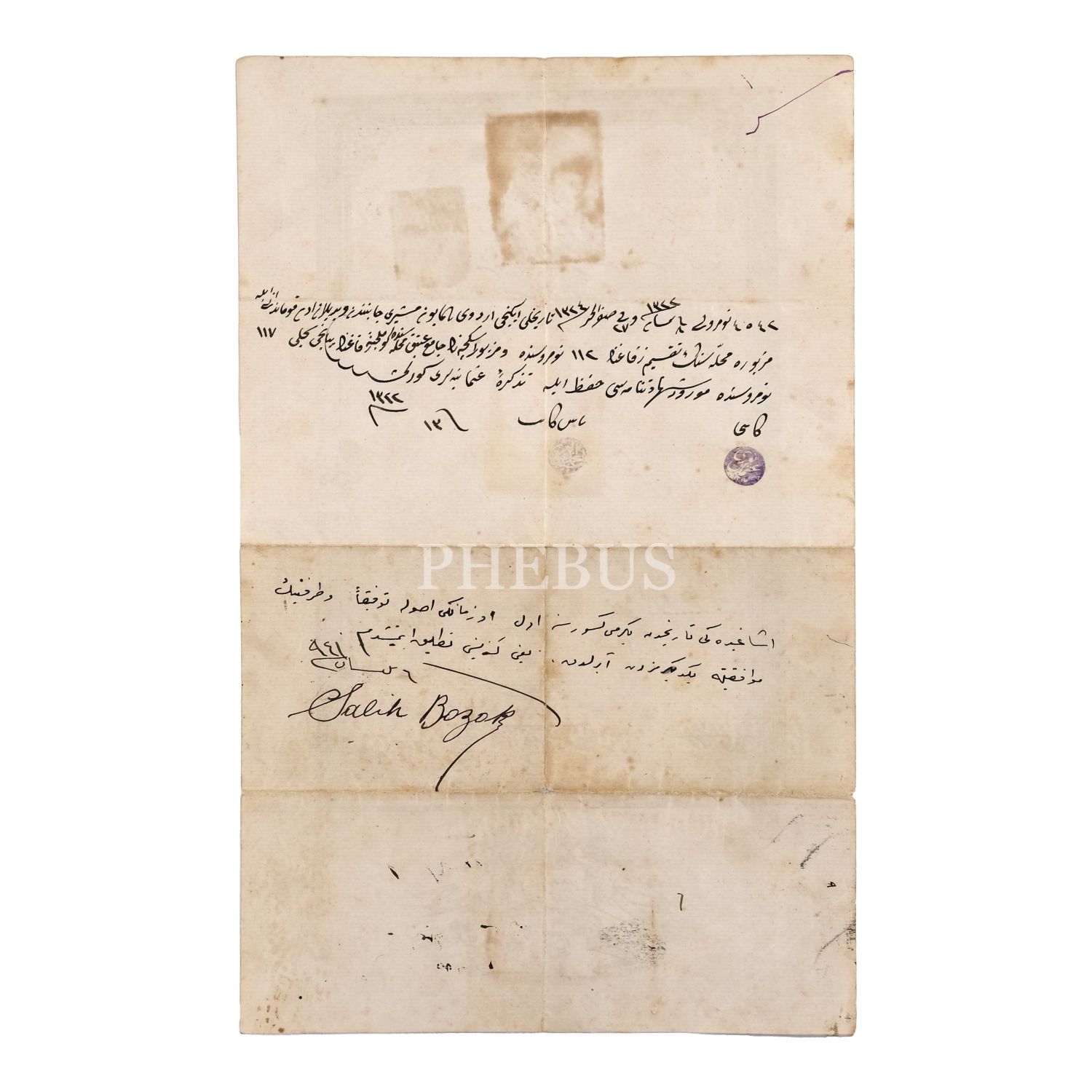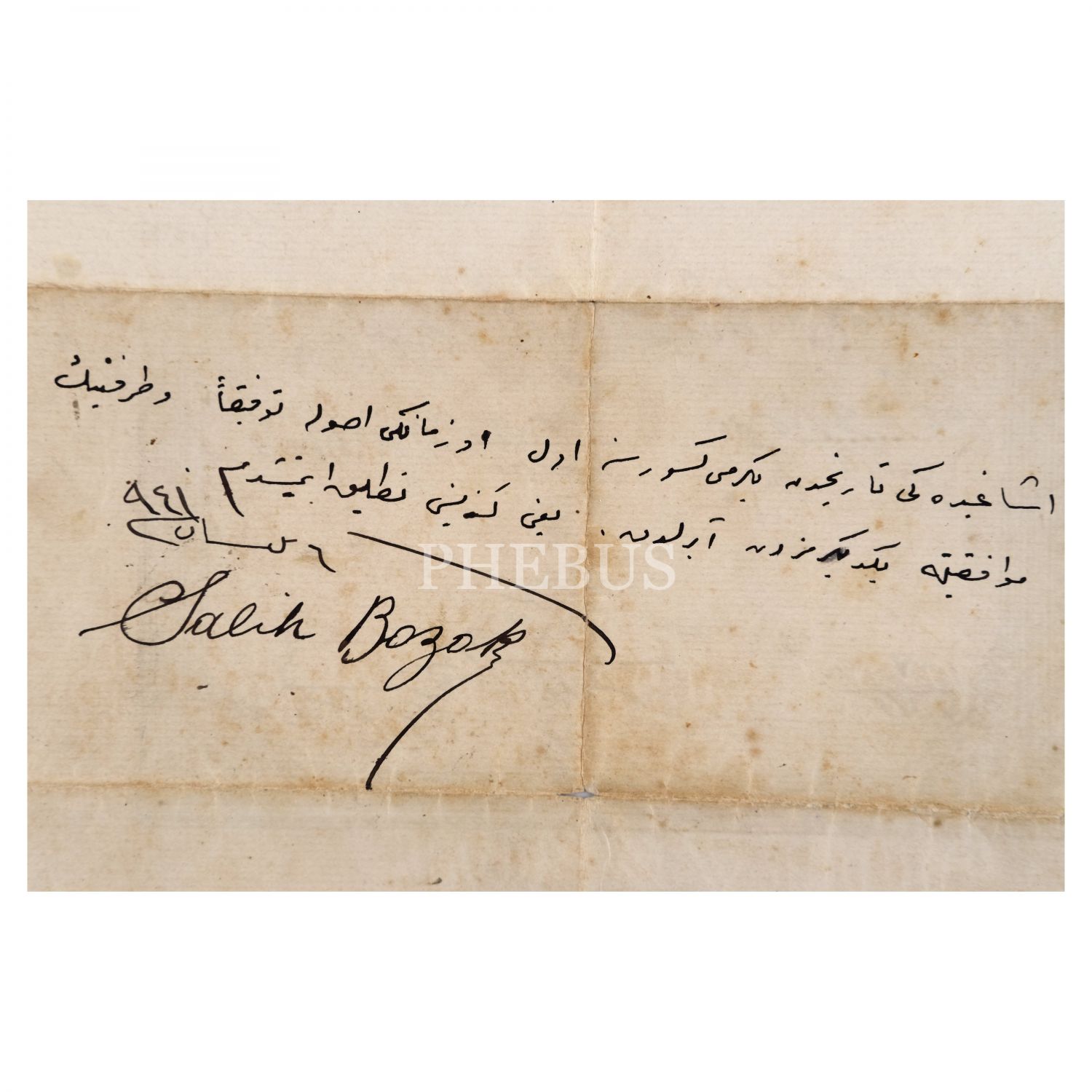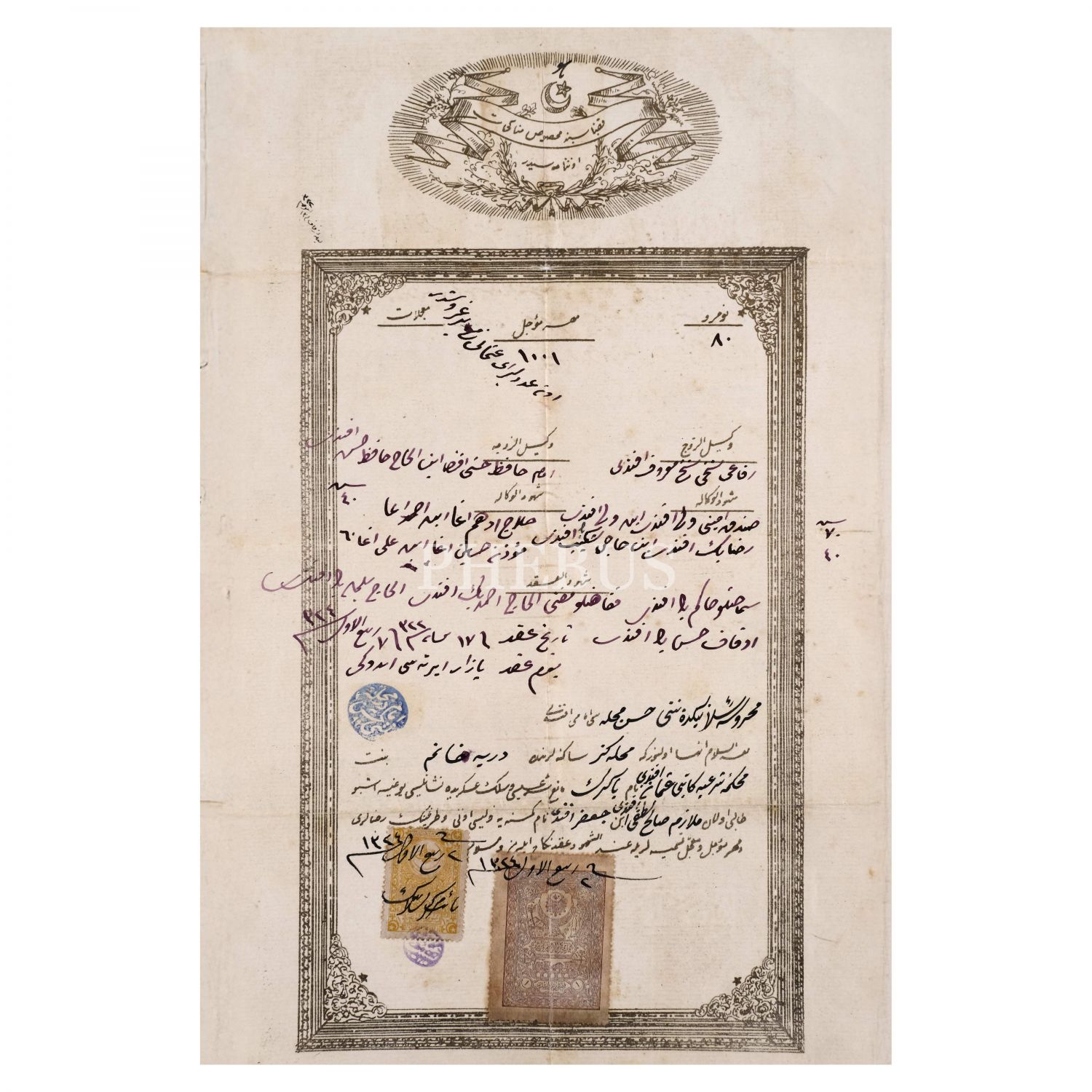 Salih Bozok´un, Nuri Conker’in kızkardeşi Dürriye Hanım ile gerçekleştirdiği ilk evliliğinin resmi evrakı ile Salih Bozok´un sonraki yıllarda el yazısıyla kaleme aldığı talak (boşanma) kaydı, 1324, 23x37 cm...