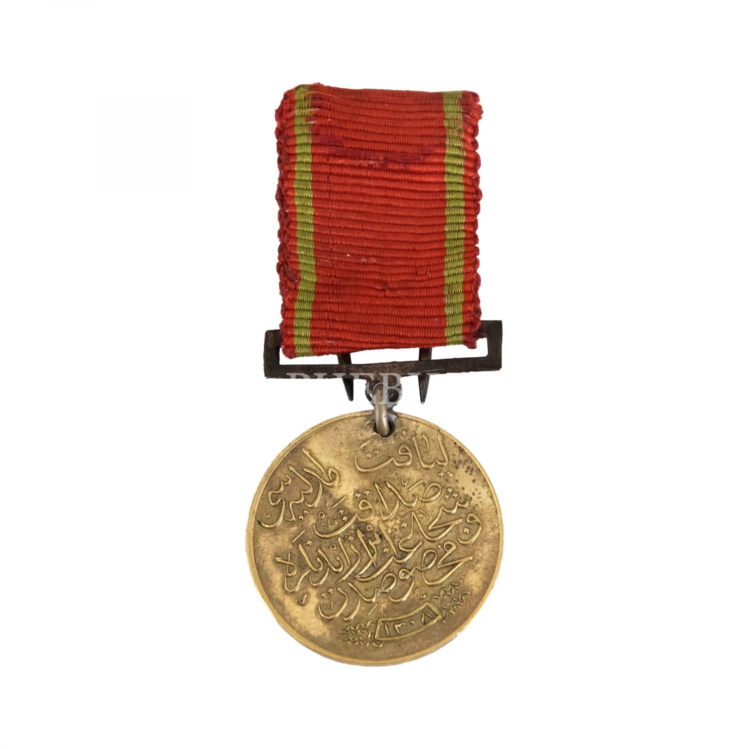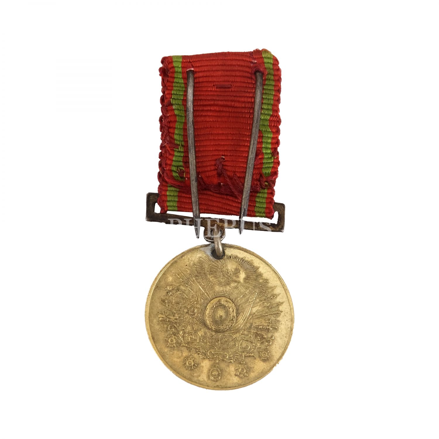 Ön yüzünde Sultan İkinci Abdülhamid tuğrası ve saltanat arması görseli, arka yüzünde "Liyakat Madalyası - Sadakat ve şecaat ibraz edenlere mahsustur." yazısı ve 1308 (1891) tarihi yer almaktadır. Yeşil şeritli kırmızı kurdelesiyle birlikte...