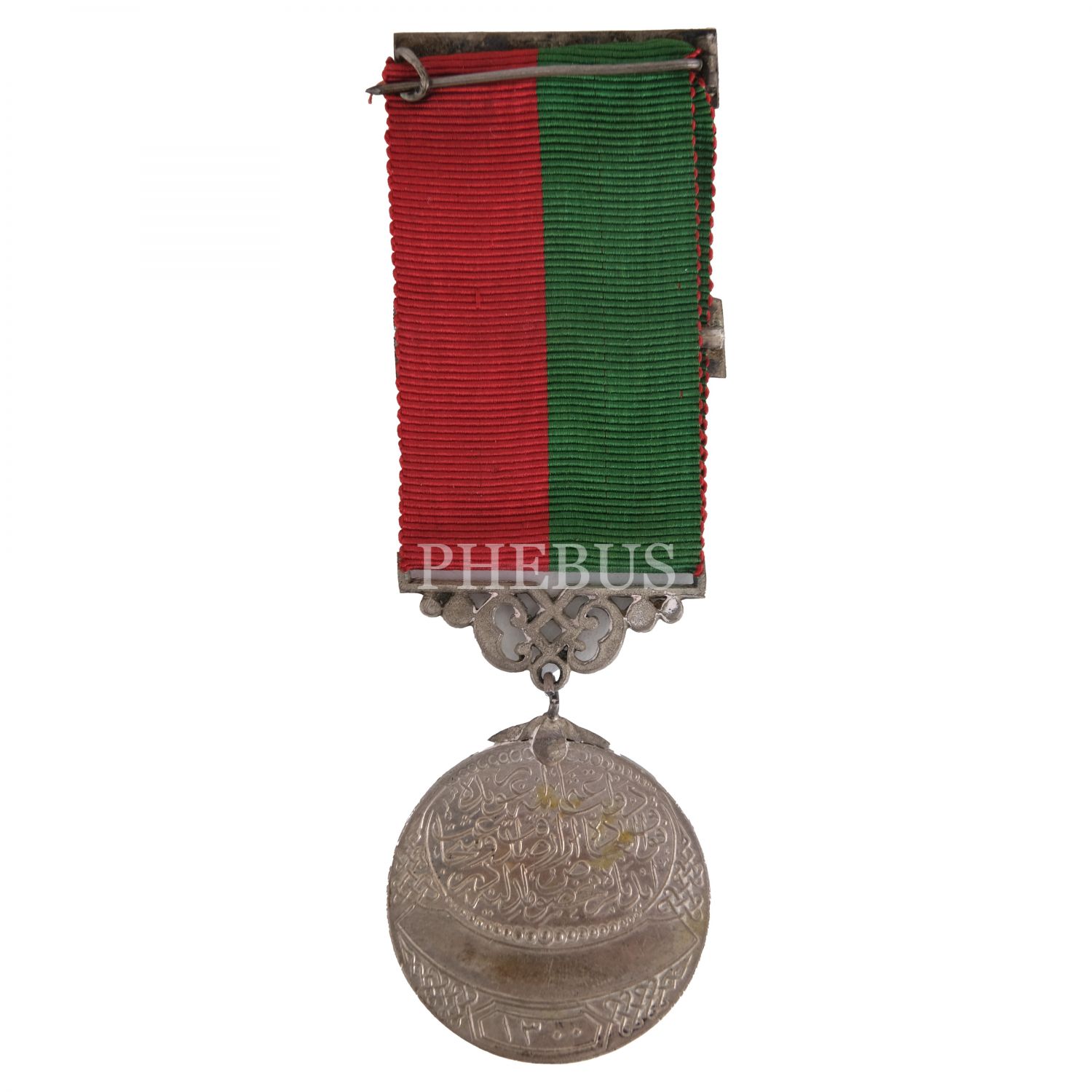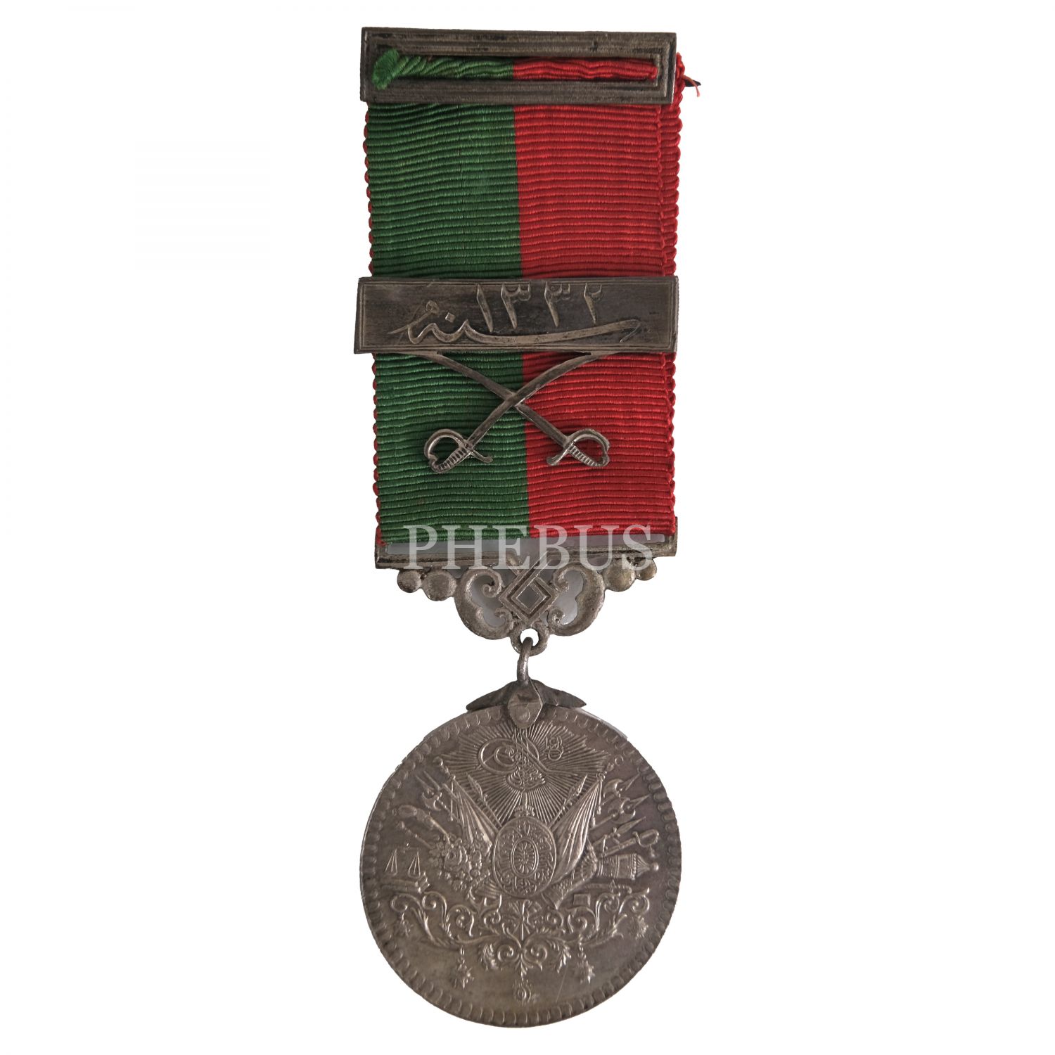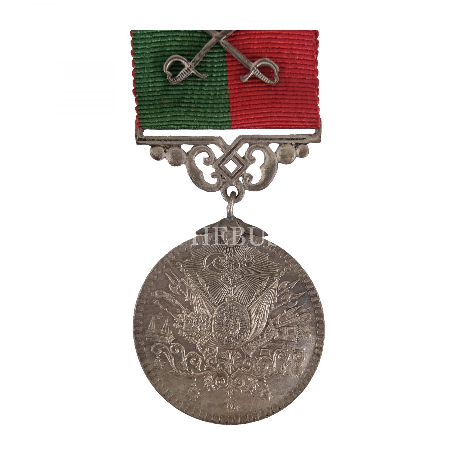 Ön yüzünde saltanat arması, diğer yüzünde, “Devlet-i Aliyye-i Osmâniyye uğrunda fevkalâde sadakat ve şecaat ibraz edenlere mahsus madalyadır” ibaresi ve altında iç kısmına verilen kişinin adının yazıldığı bir hilâl bulunmaktadır. Satışa sunduğumuz madalyanın isim barı boştur; kılıçlı, kırmızı ve yeşil şeritli kurdelesiyle birliktedir.