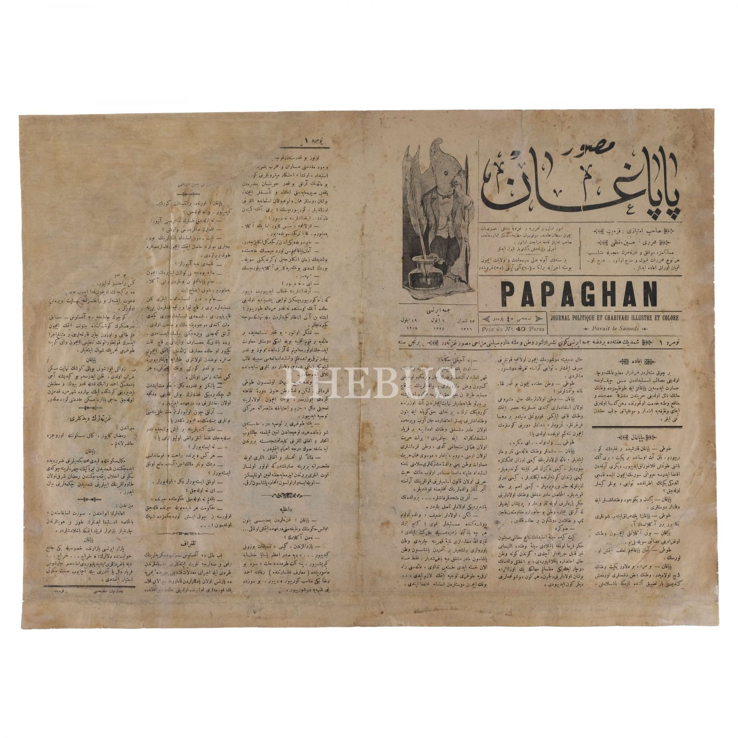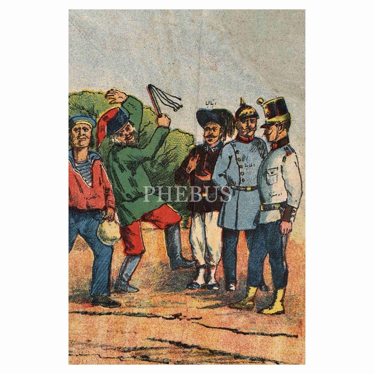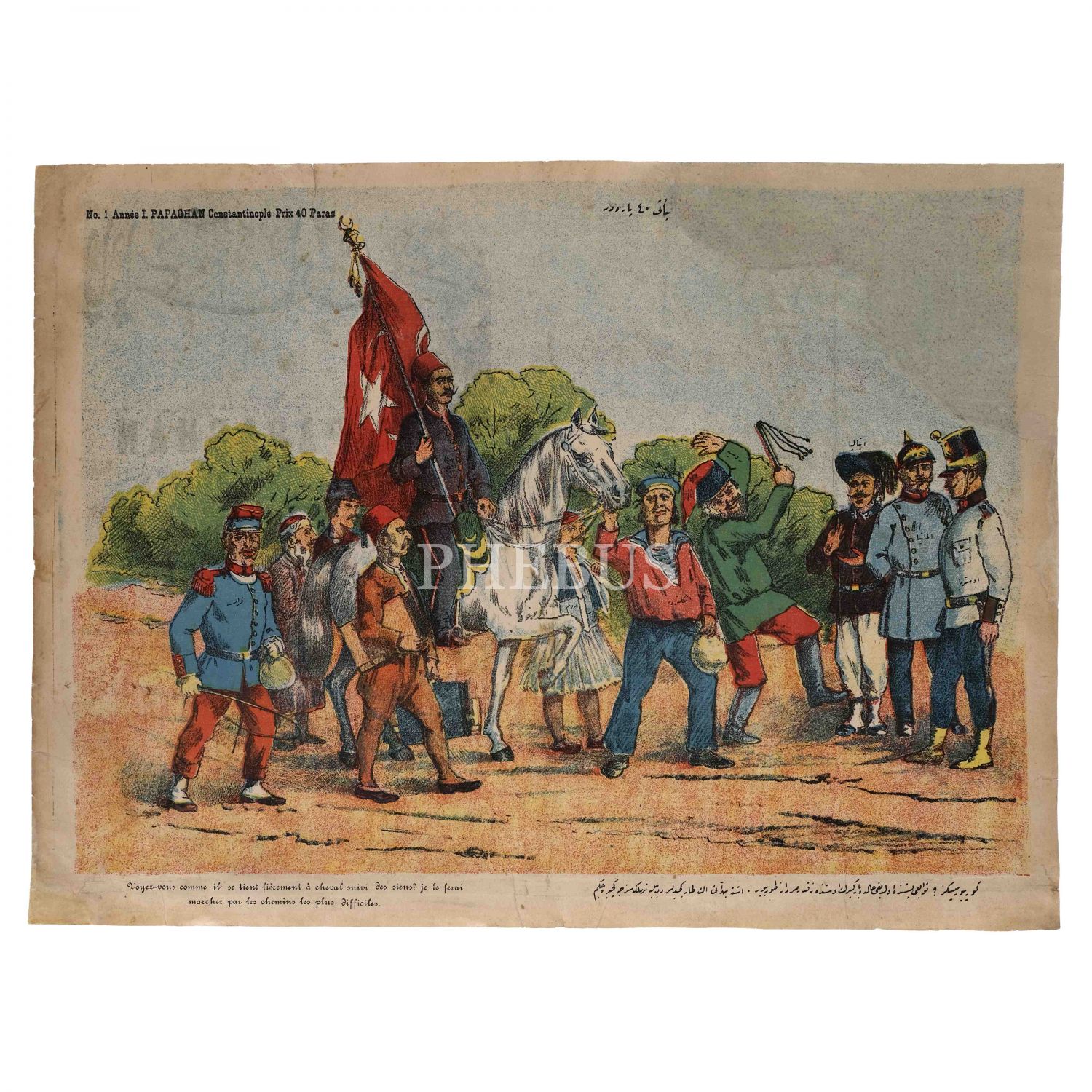 Papağan dergisinin ilk sayında yayımlanan, elinde Türk bayrağı taşıyan beyaz bir at sırtındaki "Jöntürk" ve etrafında Avrupa ve Balkan milletlerinden insanların tasvir edilidiği "Görüyorsunuz? Tevabi' peşinde olduğu halde beygirin üstünde ne kadar merdane duruyor. İşte ben onu en dar geçitlerden bile tehlikesizce geçireceğim." altbaşlıklı afiş,