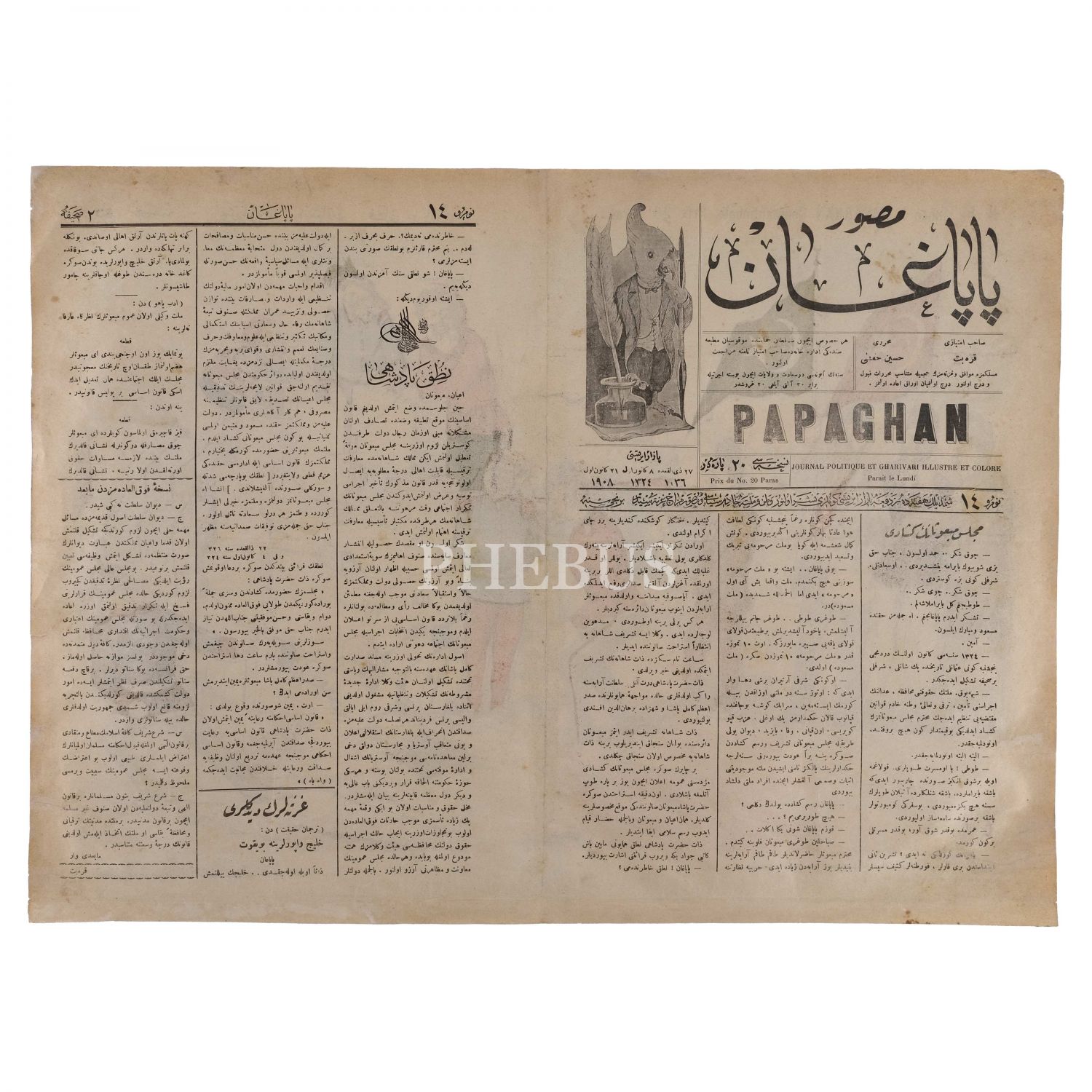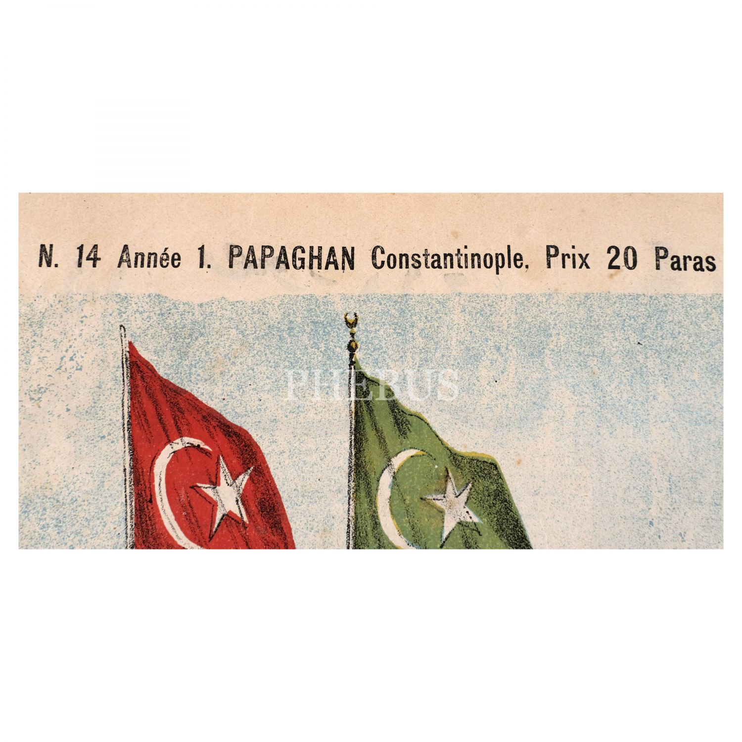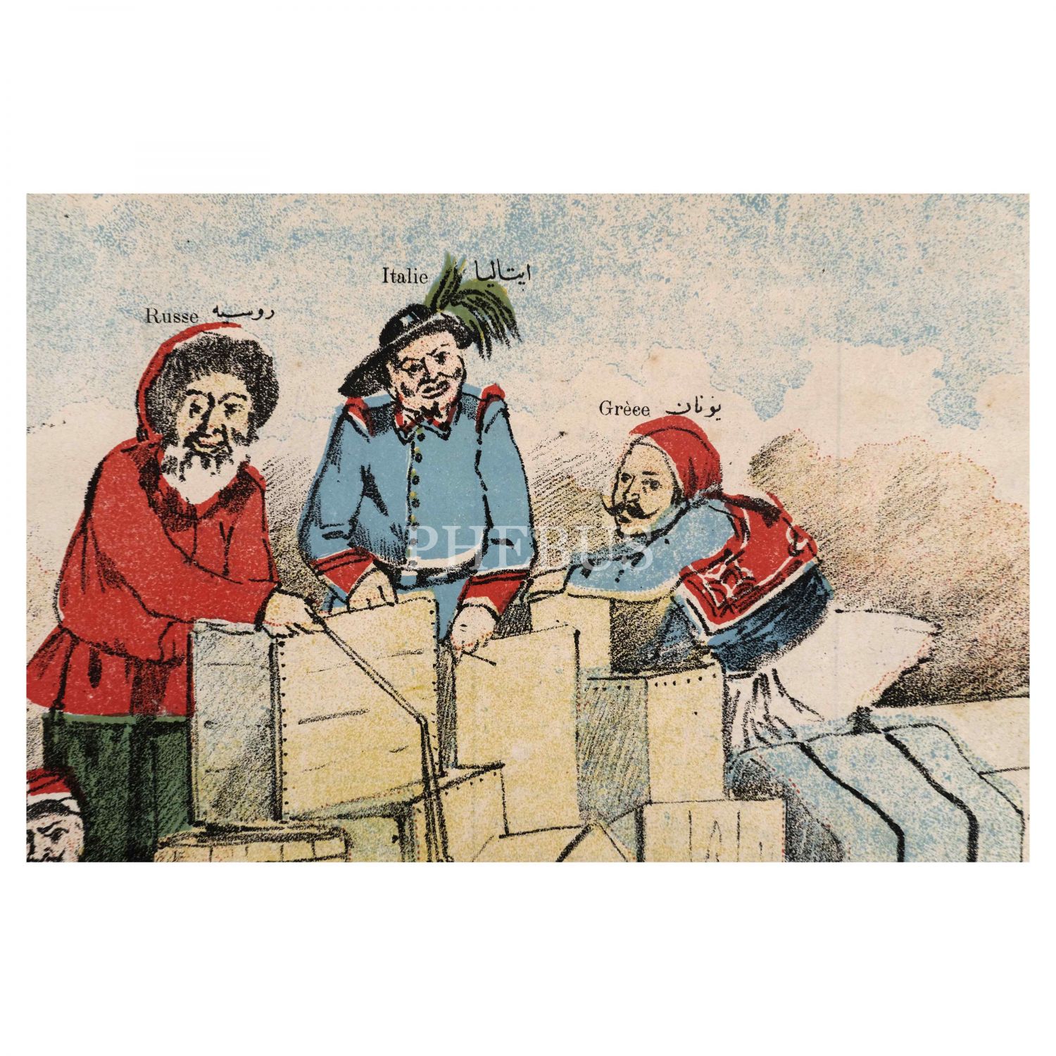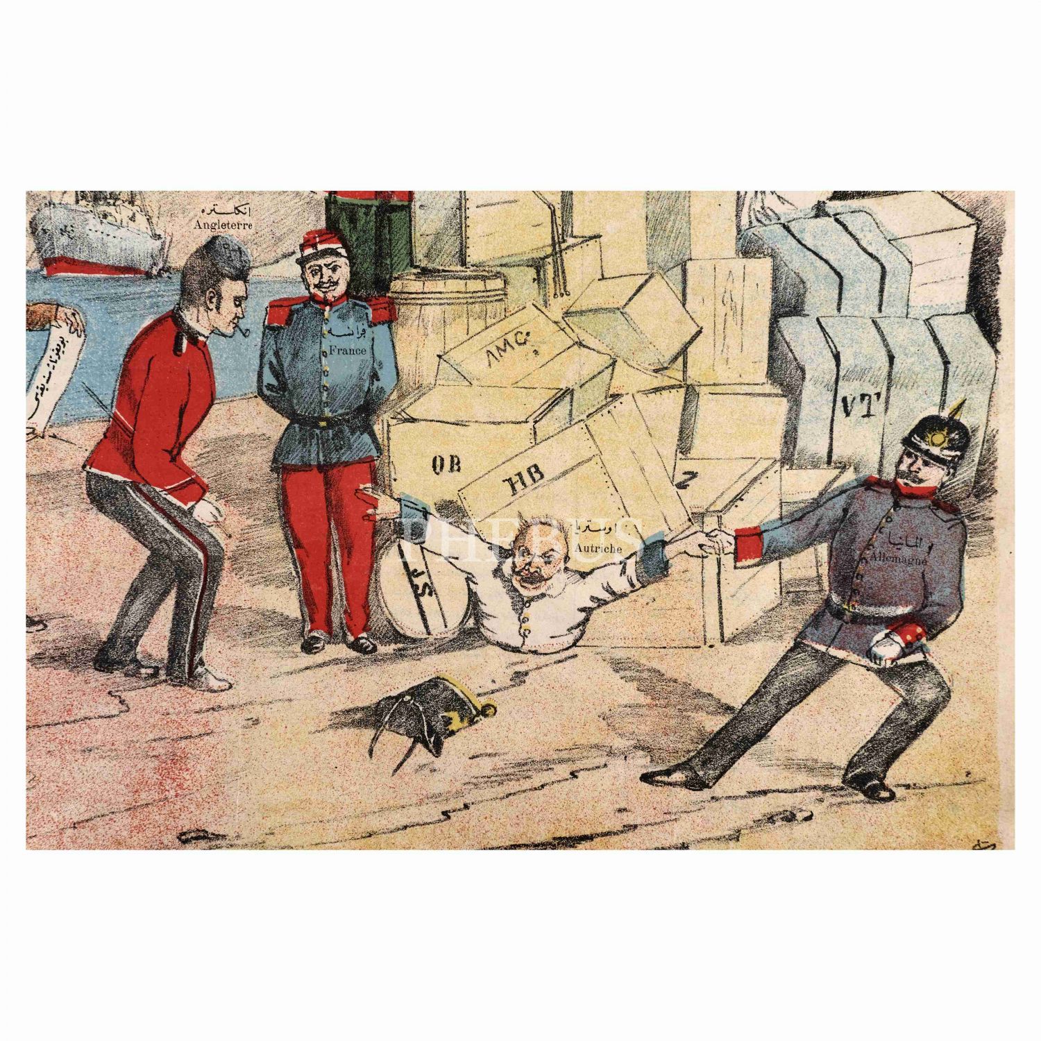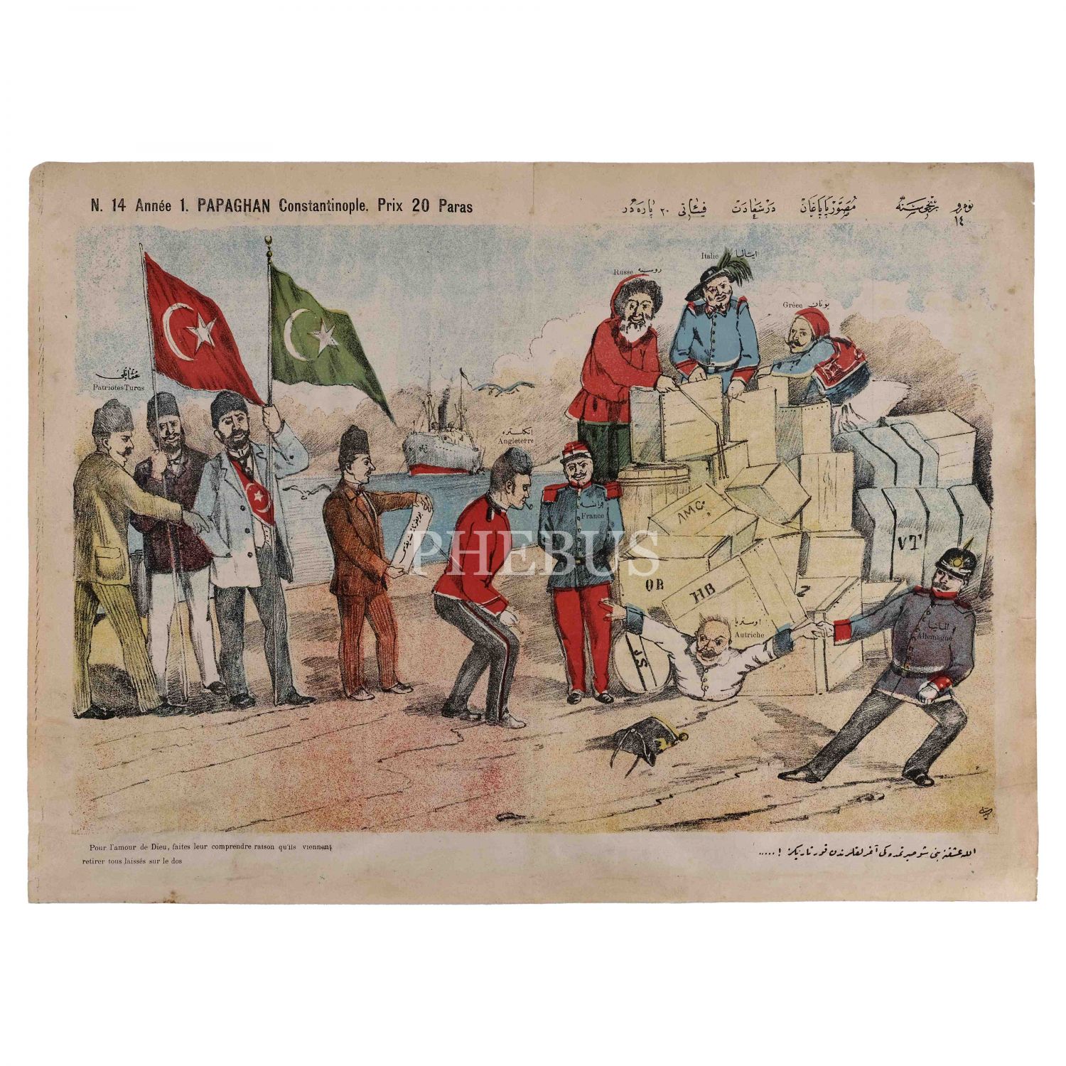 Musavver Papağan dergisinin 14. sayısında yayımlanan, bir tarafta sancak taşıyan Osmanlılar, bir yanda Yunan, İtalyan ve Rus altında ezilen Avusturya'nın tasvir edildiği "Allah aşkına beni şu sırtımdaki ağırlıklardan kurtarınız!..." altbaşlıklı afiş, 55x40 cm...