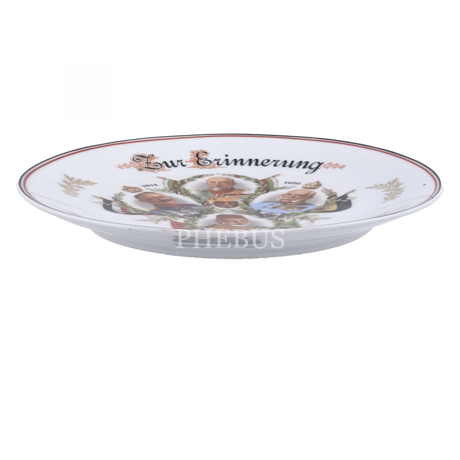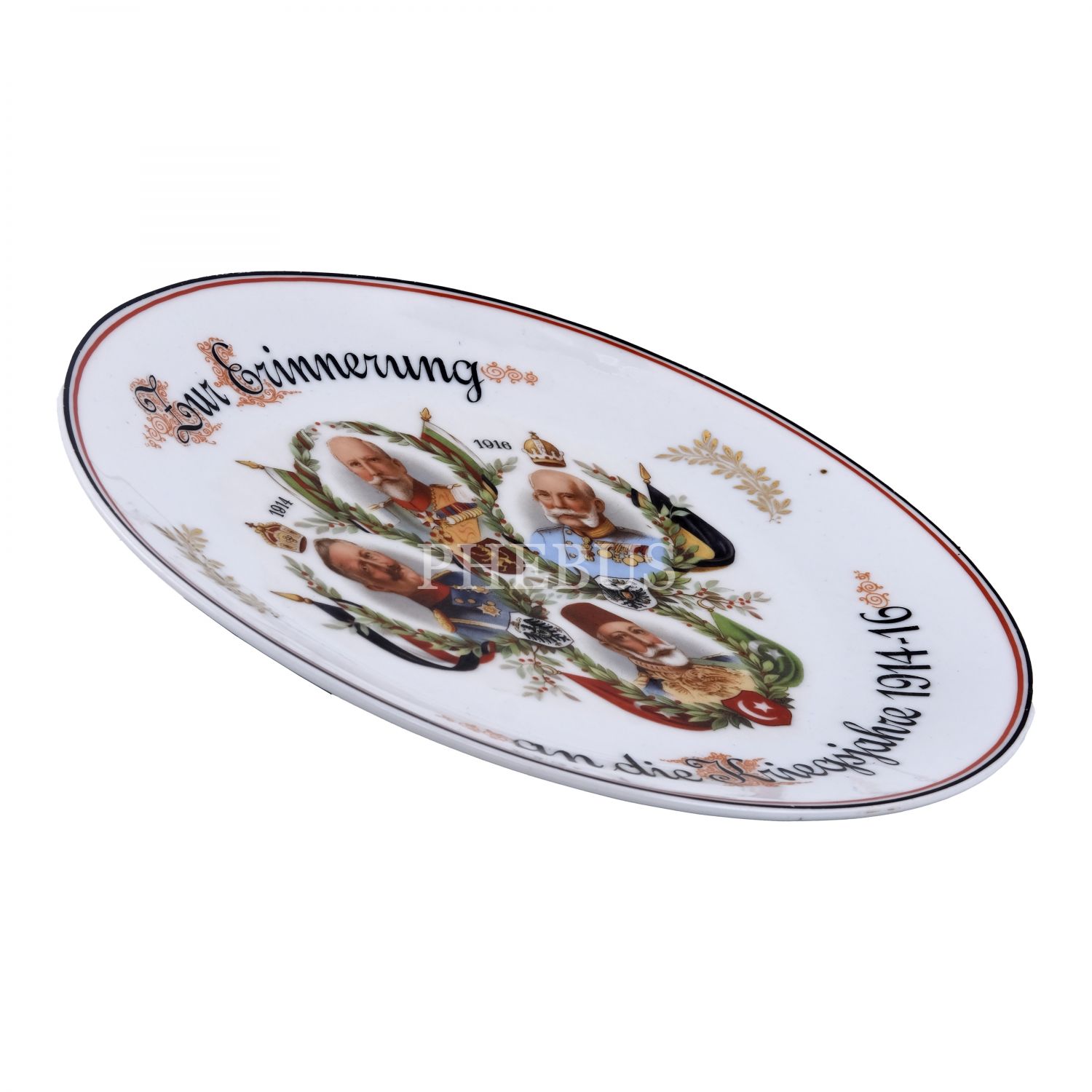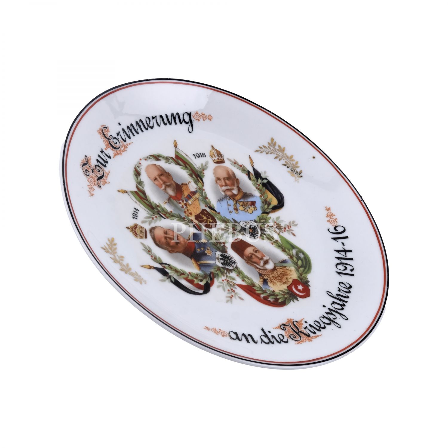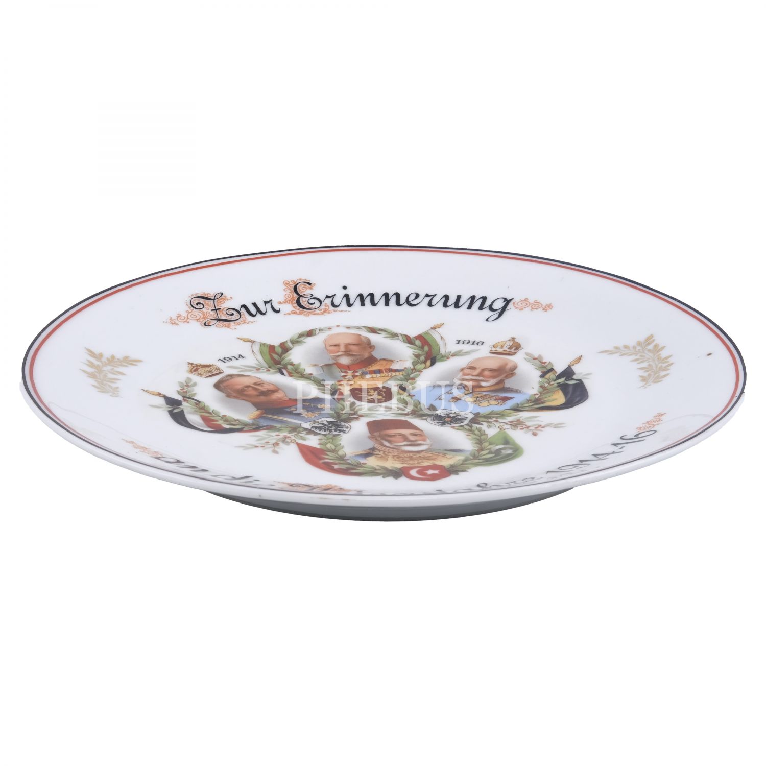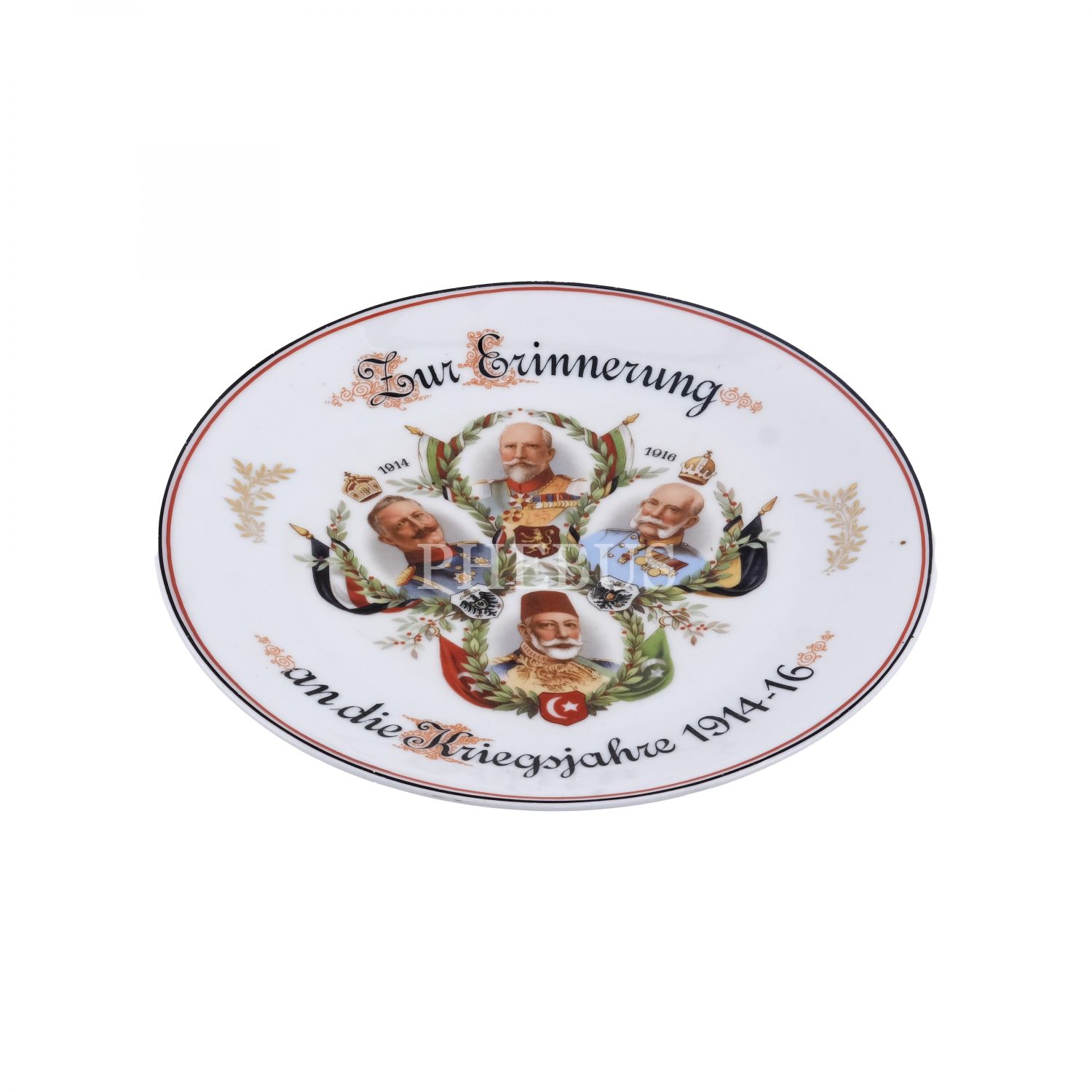 I. Dünya Savaşı yıllarından; Osmanlı İmparatoru Sultan Mehmed Reşad, Alman İmparatoru Kayzer II. Wilhelm, Bulgar Çarı I. Ferdinand ve Avusturya-Macaristan İmparatoru Franz Joseph´in portrelerinin yer aldığı, Almanca "1914-1916 Savaş Yıllarının Anısına" (Zur Erinnerung an die Kriegsjahre 1914-16) yazılı hatıra tabağı, çap 25 cm...
