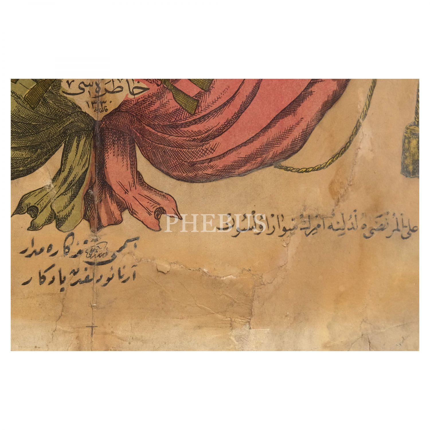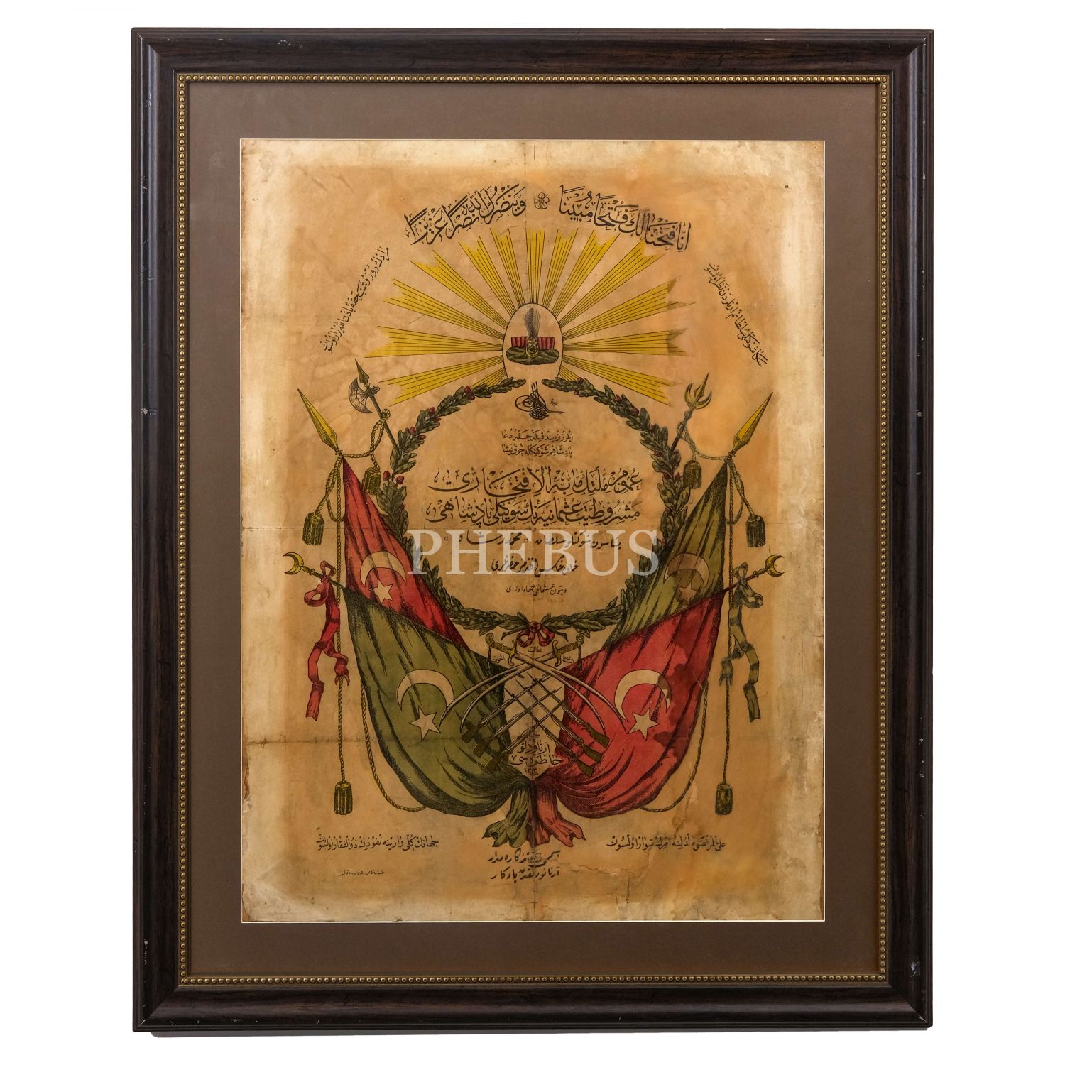 Sultan Mehmed Reşad´ın Arnavutluk´u ziyareti hatırasına hazırlanan, Osmanlı sancakları arasında "Umum Milletin mabihil iftiharı Meşrutiyet-i Osmaniye´nin sevgili padişahı Yaşasın Şevketli Sultan Mehmed Reşad" ve "Arnavutluk Hatırası - 1330" yazılı afiş, Matbaa-i Hafız Mehmed ve Burhaneddin (Çakmakçılar), 50x67 cm..