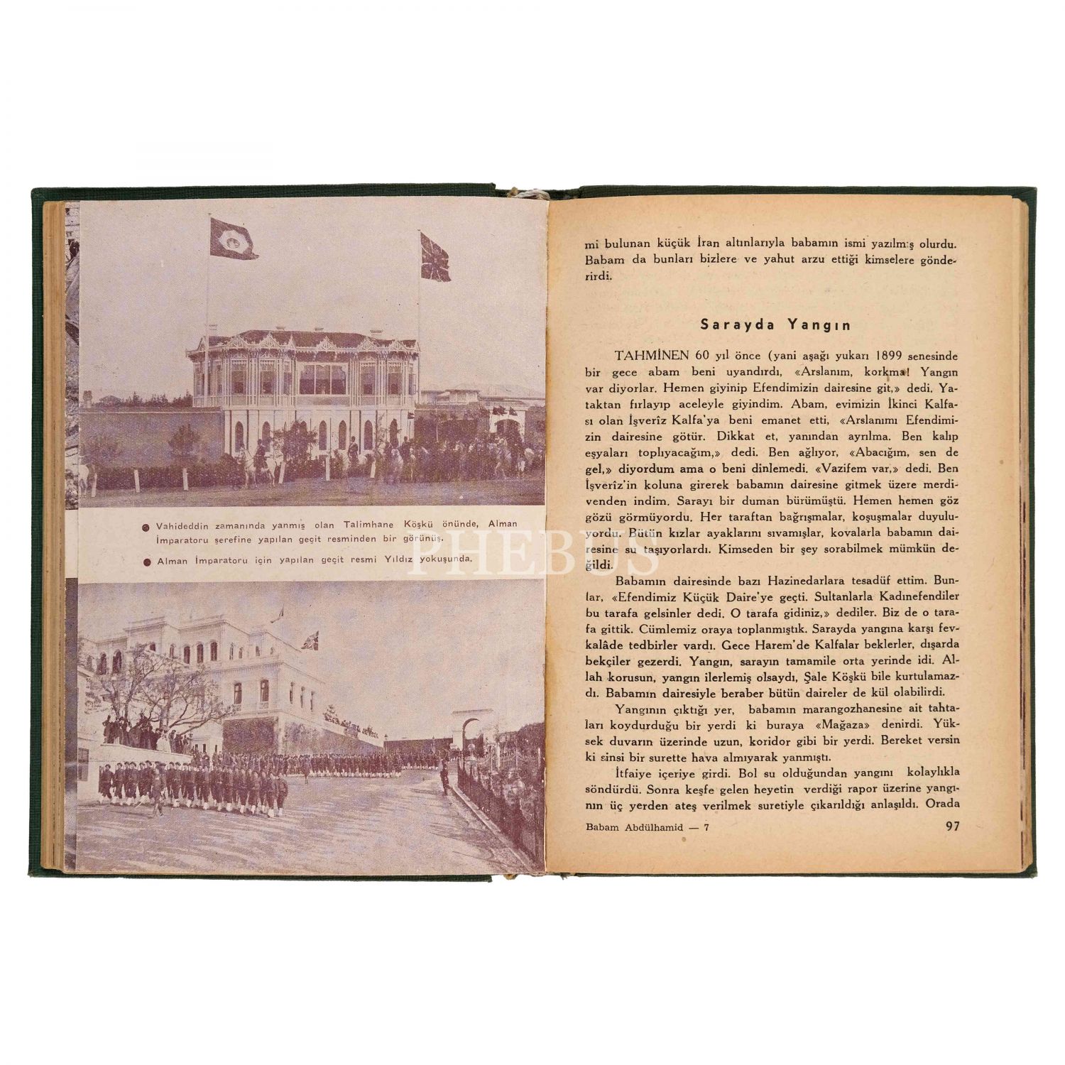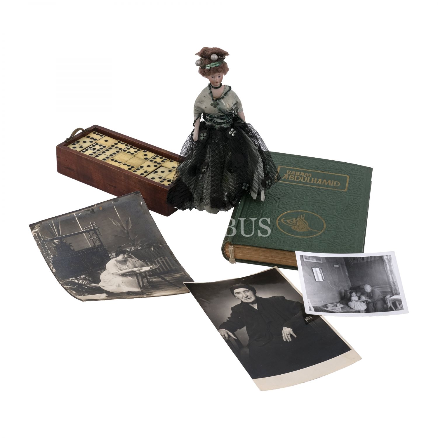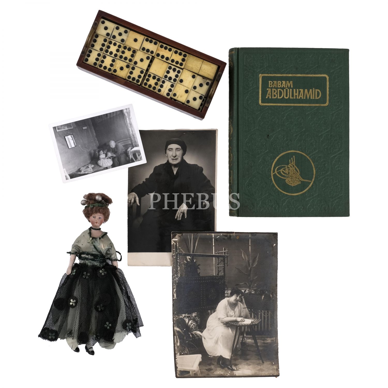 1886 yılında nikahlanacağı Sultan II. Abdülhamid´i ölümüne kadar yalnız bırakmayan Müşfika Kadınefendi, Ayşe Sultan´ın annesidir. Sultan II. Abdülhamid´i ne saltanatının çalkantılı son demlerinde, ne de 31 Mart Vakası sonrası tahttan indirilip sürgün edileceği Selanik´te yalnız bırakmamıştır. 1912´de Balkan Harbi´nin başlamasıyla güvenlik sebebiyle yeniden İstanbul´a, Beylerbeyi Sarayı´na getirilen devrik padişaha buradaki son yıllarında da eşlik eden Müşfika Kadınefendi, sadakatle bağlandığı eşinin vefatının ardından saraydan ayrılarak mütevazı bir yaşam sürmüştür. 1924 yılındaki Hanedan sürgününde cariye kökenli olduğu için sürgün dışında tutulan Müşfika Kadınefendi, hanedan mensubu kızı Ayşe Sultan´ın Avrupa´ya sürgün edilmesine bağrına taş basarak şahitlik etmiştir... Lot içeriği: 1) Müşfika Kadınefendi tarafından Osmanlıca "Oğlum Cemil Bey´e yadigârımdır." ithafıyla imzalanmış, yine Osmanlıca "Müşfika" mühürlü BABAM ABDÜLHAMİD kitabı (yazar: Ayşe Osmanoğlu). 2) Müşfika Kadınefendi´nin vefatından bir sene önce (1960) çektirip, arka yüzüne "Yadigâr" notu düşerek imzaladığı bir stüdyo portre fotoğrafı (11x16,5 cm). 3) Müşfika Kadınefendi´nin küçük bir kız çocuğuyla görüldüğü enstantane fotoğraf (10,5x7,5 cm). 4) Müşfika Kadınefendi ile Ayşe Osmanoğlu´nun sürgün yıllarında oynadıkları domino takımı (orijinal ahşap kutusunda; 16,5x7,5x3,5 cm). 5) Ayşe Osmanoğlu´nun gençlik yıllarında çekilmiş stüdyo fotoğrafı. 6) Ayşe Osmanoğlu´nun sürgün yıllarında kendi elleriyle yaptığı oyuncak bebek (18x6,5 cm).
