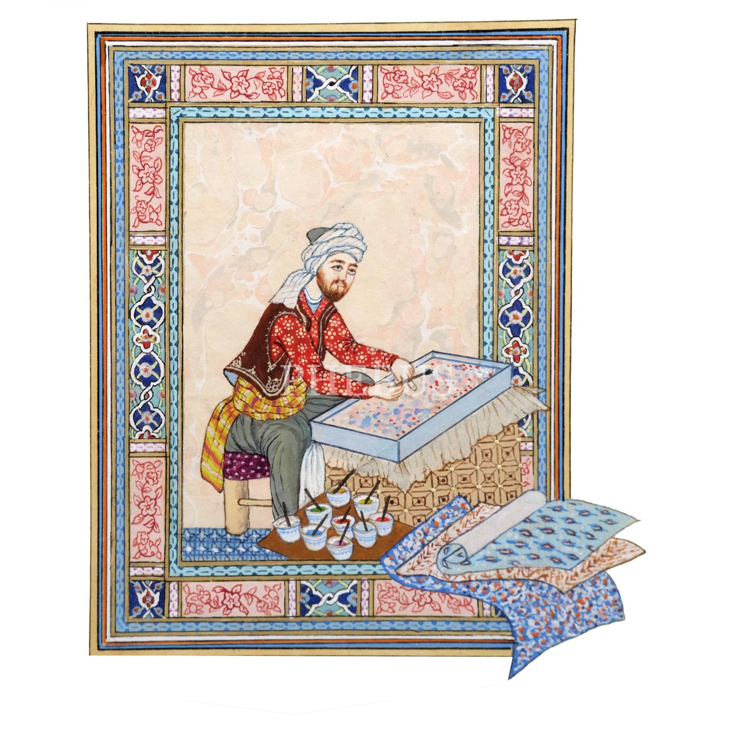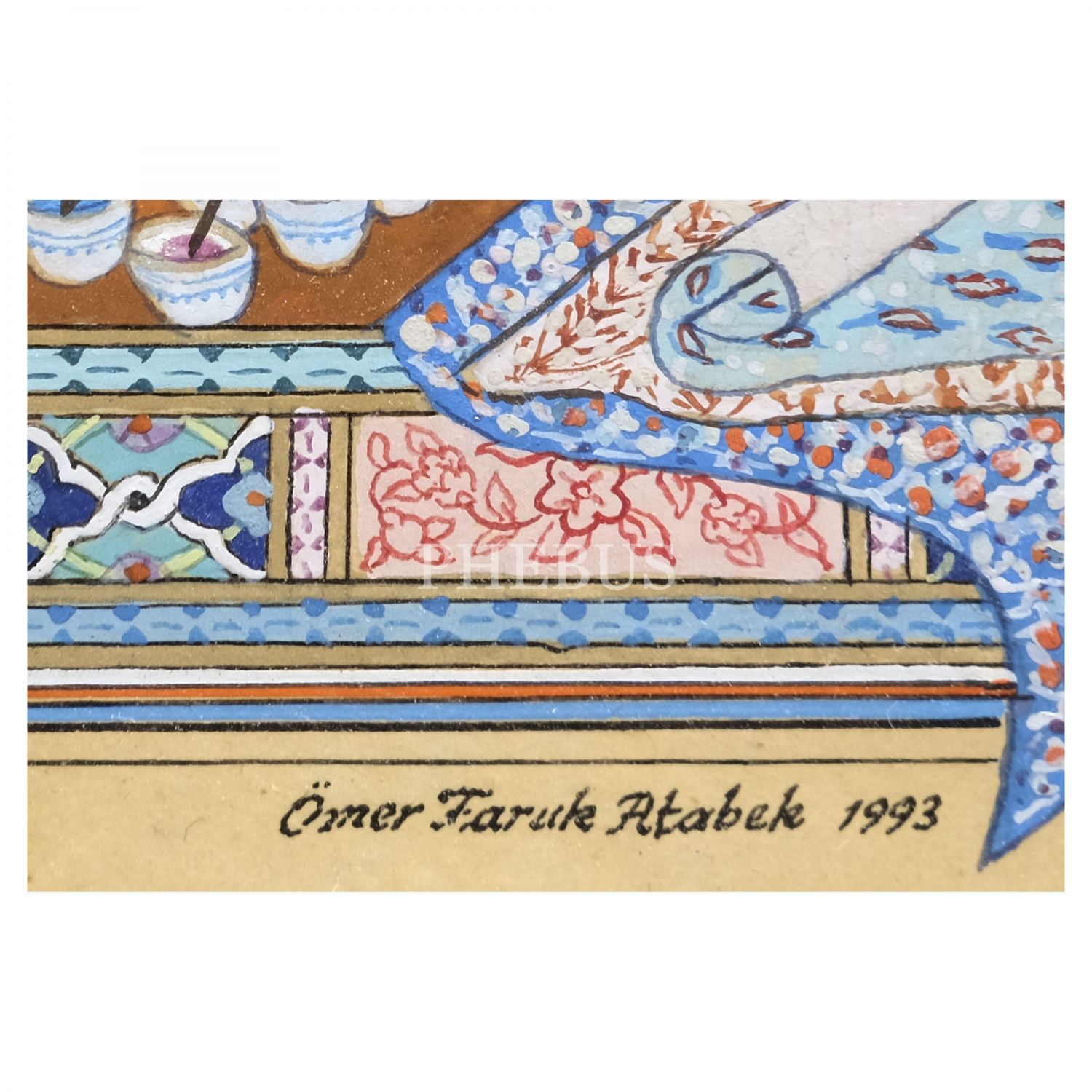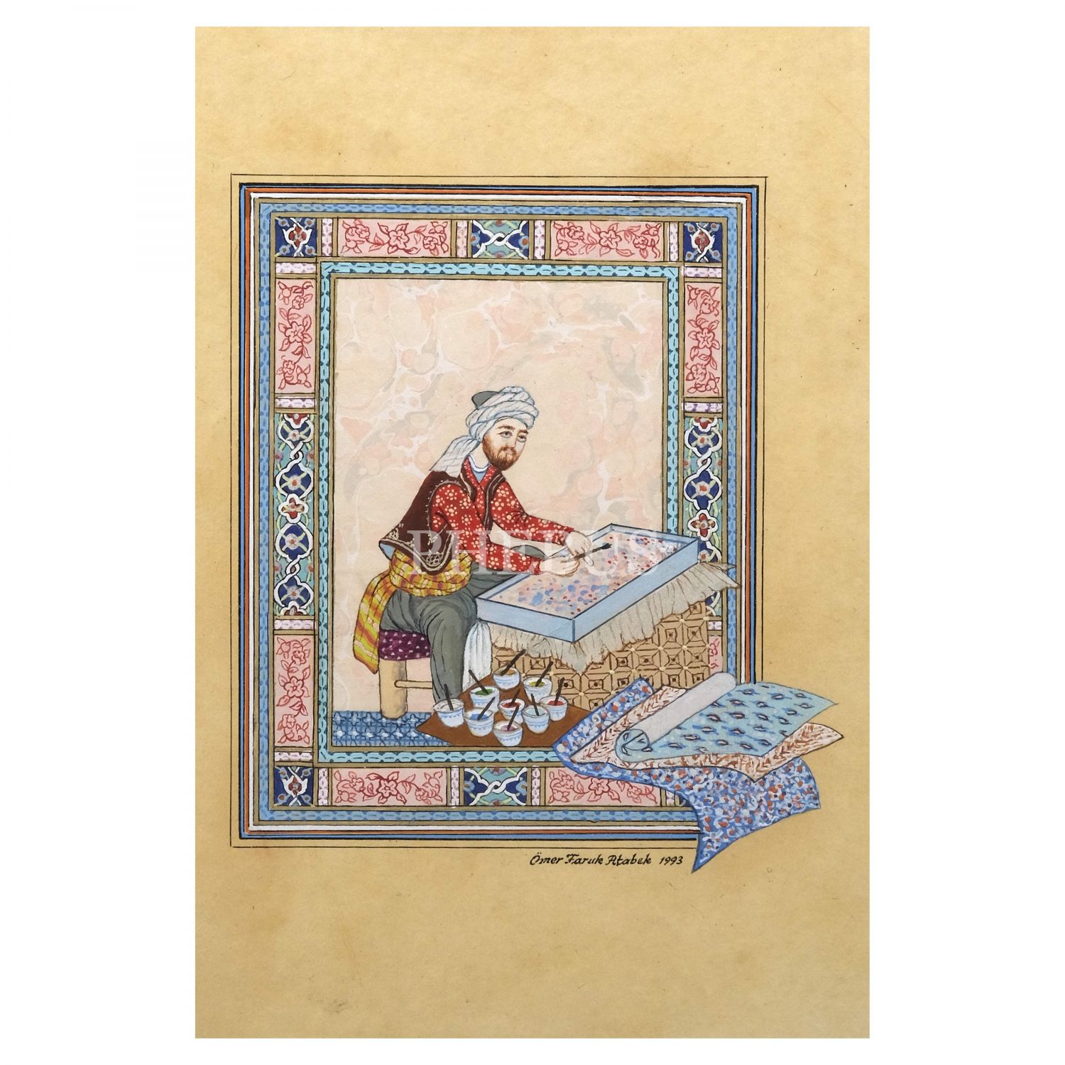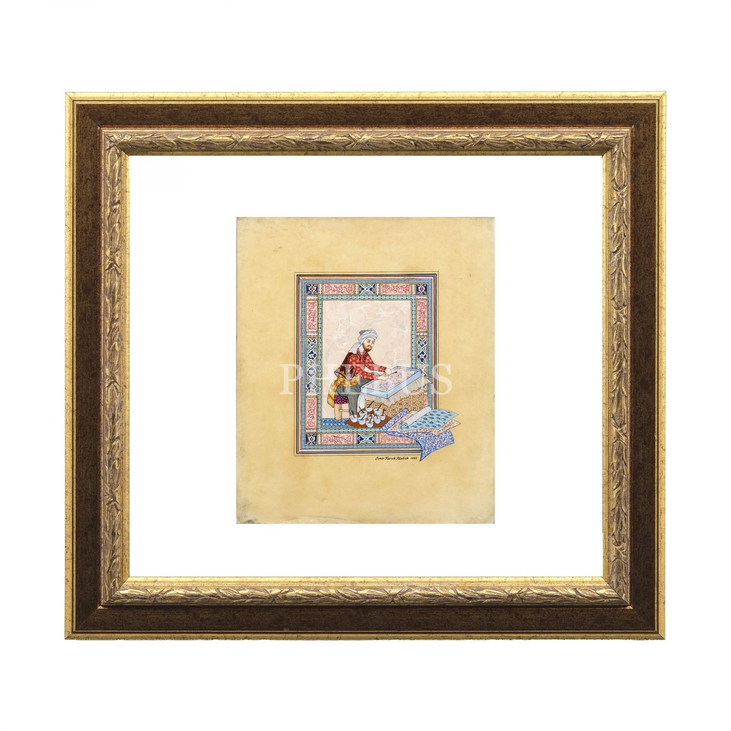 Ömer Faruk Atabek imzalı, ebru sanatçısı temalı tezhipli minyatür, 1993 tarihli, minyatür ölçü: 12x15 cm, çerçeve ölçü: 49x45 cm...