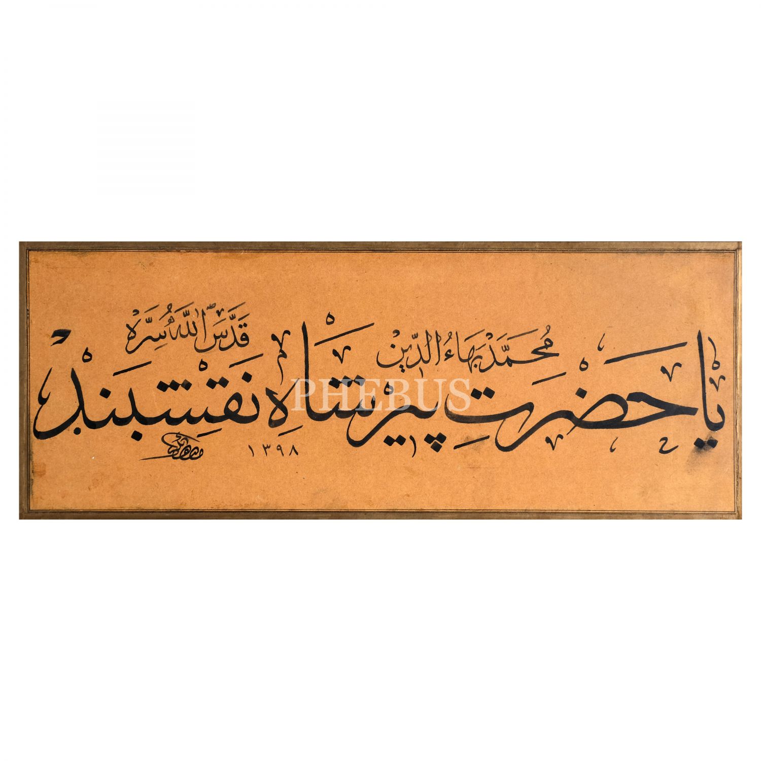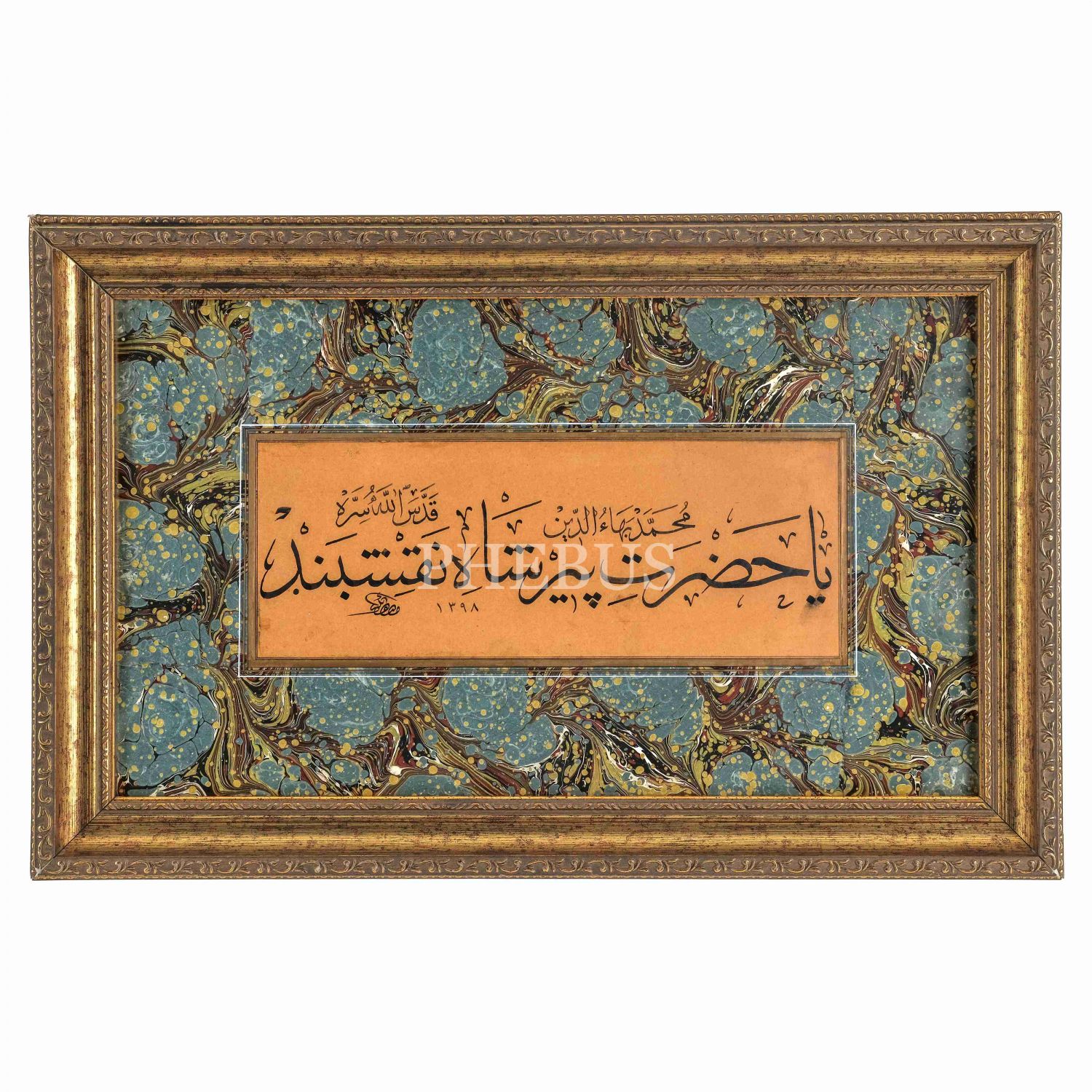 Mustafa Bekir (Pekten) ketebeli sülüs yazı, 1398 tarihli, yazı ölçü: 33x13 cm, çerçeve içi ebru ölçü: 49x28 cm...