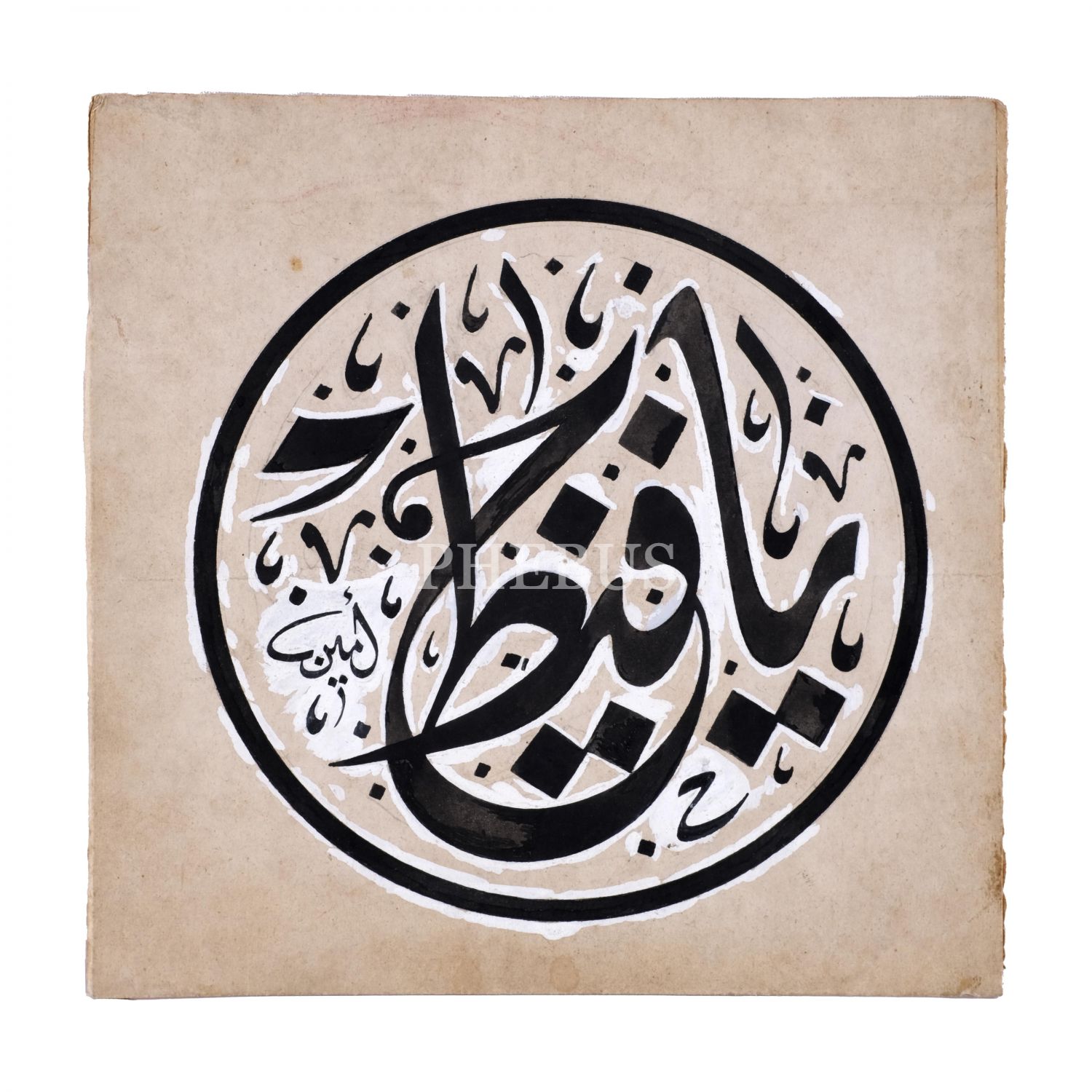 Emin (Barın) ketebeli celî divânî Yâ Hafîz levhası, yazı çapı: 15 cm, kâğıt ölçü: 18x18 cm...