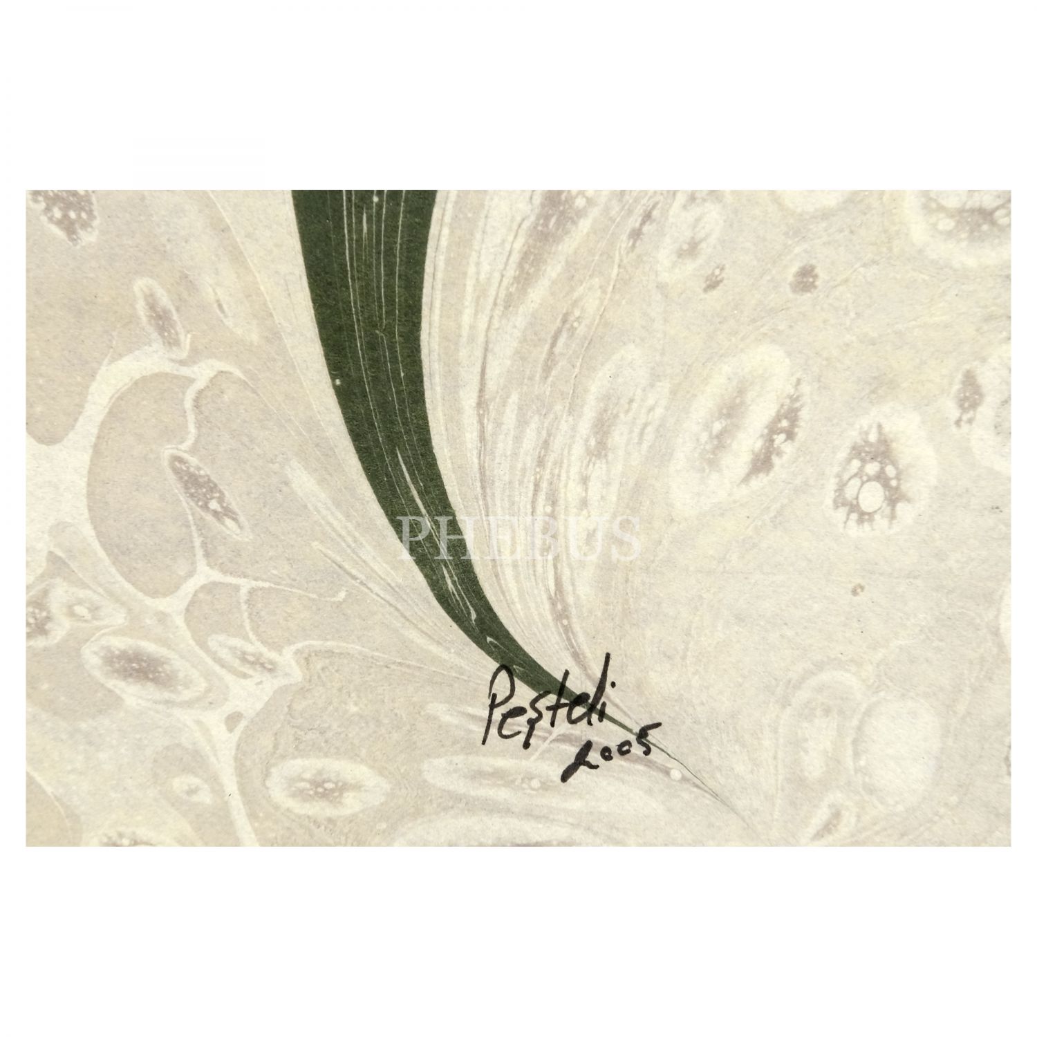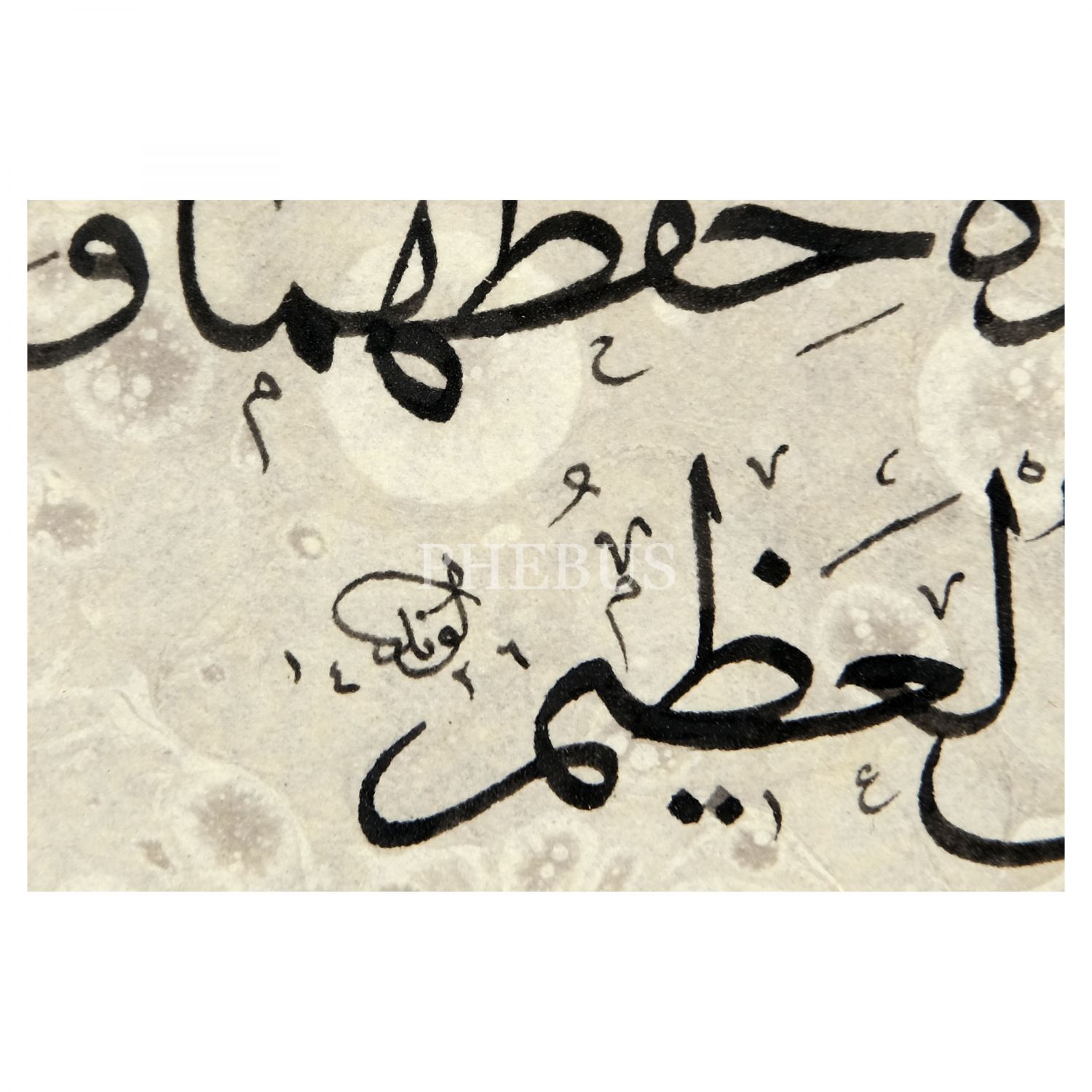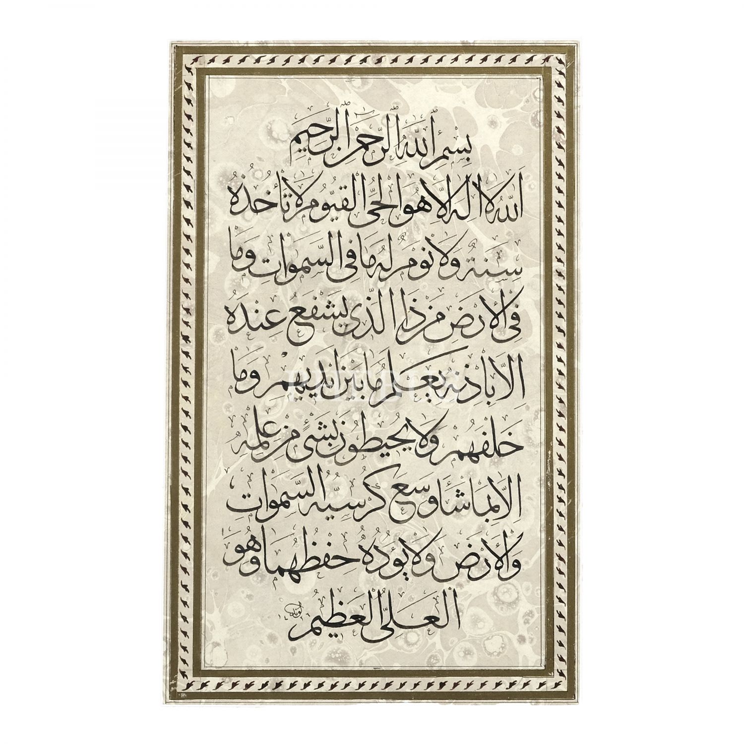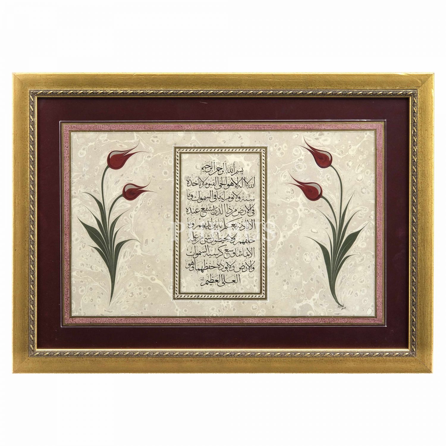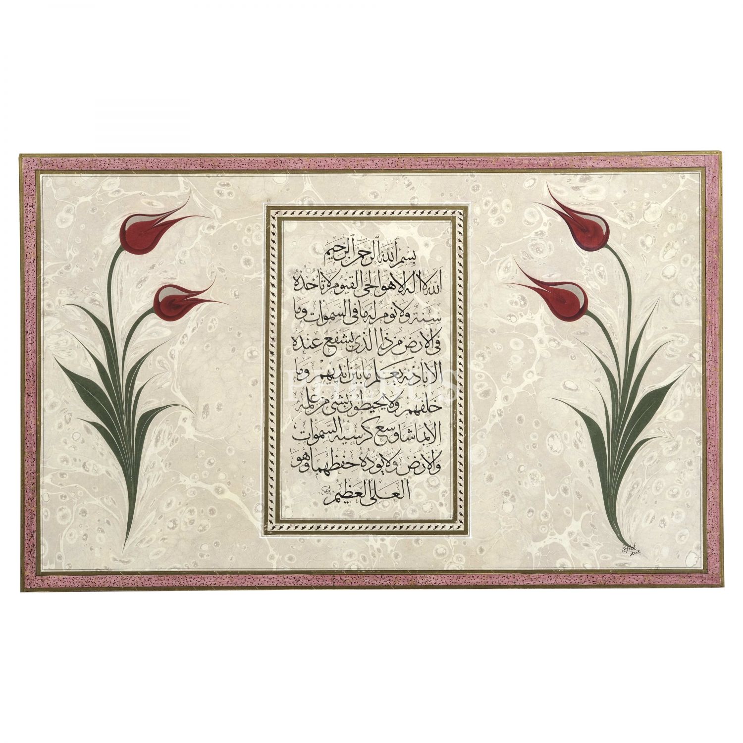 Levent (Karaduman) ketebeli, (Mahmut) Peşteli imzalı lale ebrusu üzerine sülüs âyetelkürsî, 1426 tarihli, yazı ölçü: 12x21 cm, ebru ölçü: 47x28 cm, çerçeve içi ölçü: 57x39 cm...