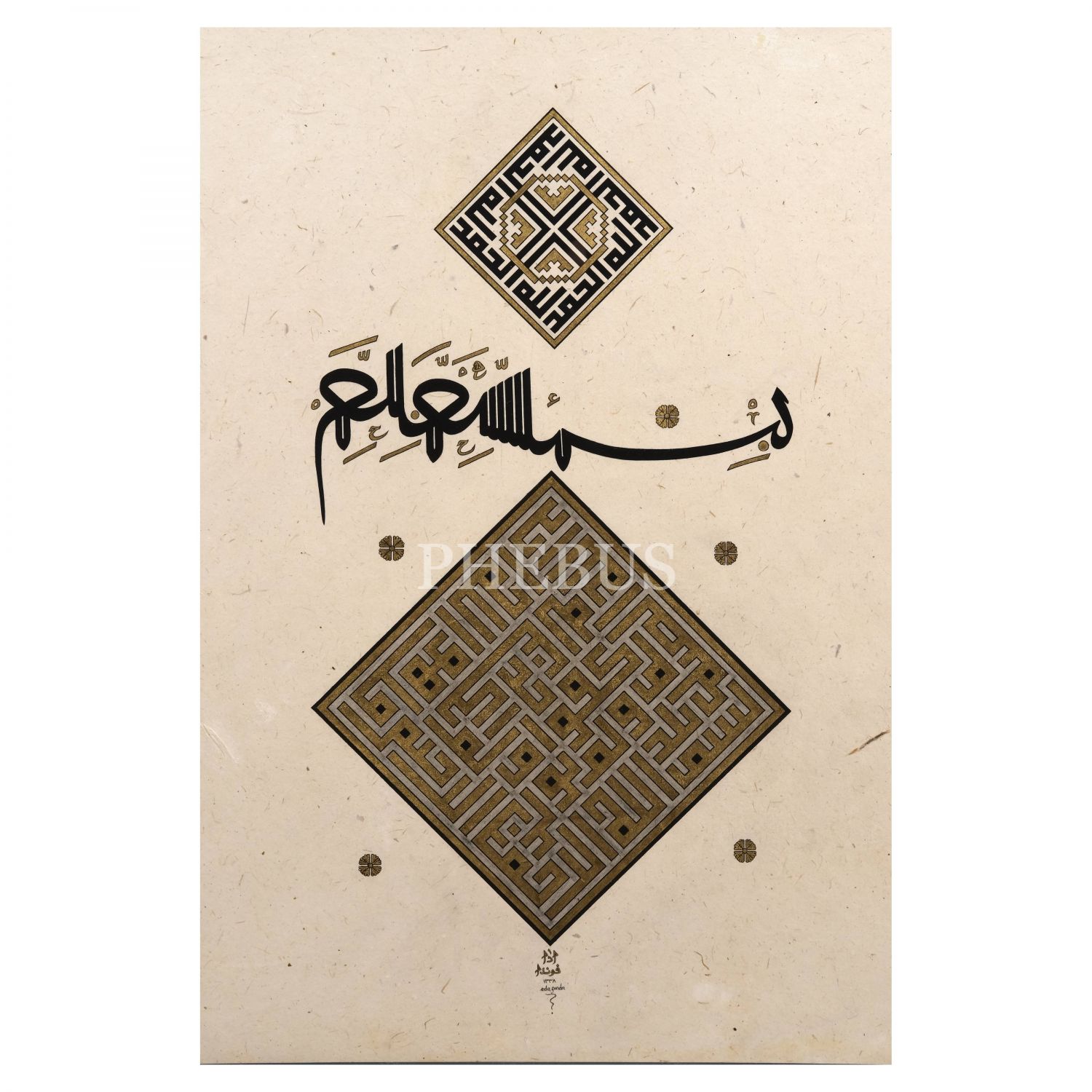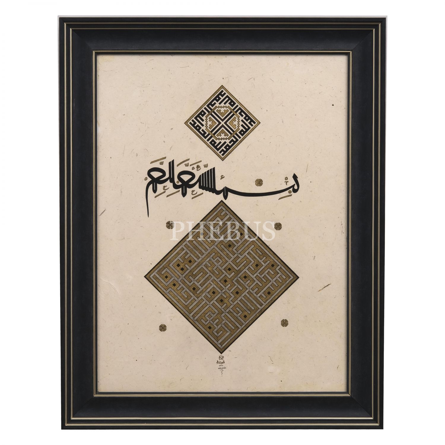 Türk İslam Eserleri Müzesi´nde sergilenen Ahmed Karahisârî Albümü´ndeki müselsel besmele ve makılî yazının takliden yazılmış örneği. Üst kısımda "Allah" ve "Muhammed", ortada müselsel besmele, altta da besmele ve İhlâs Sûresi yazılıdır.