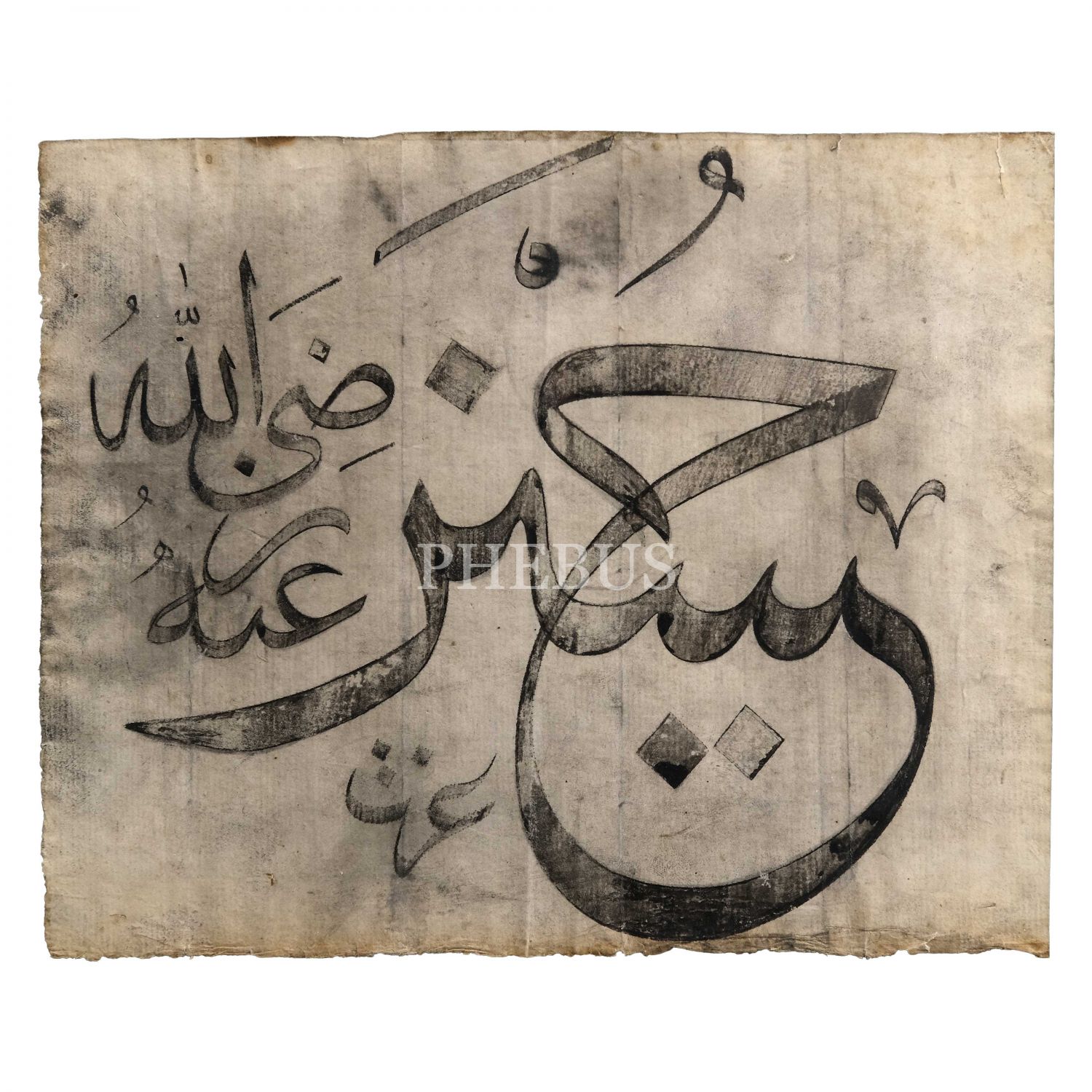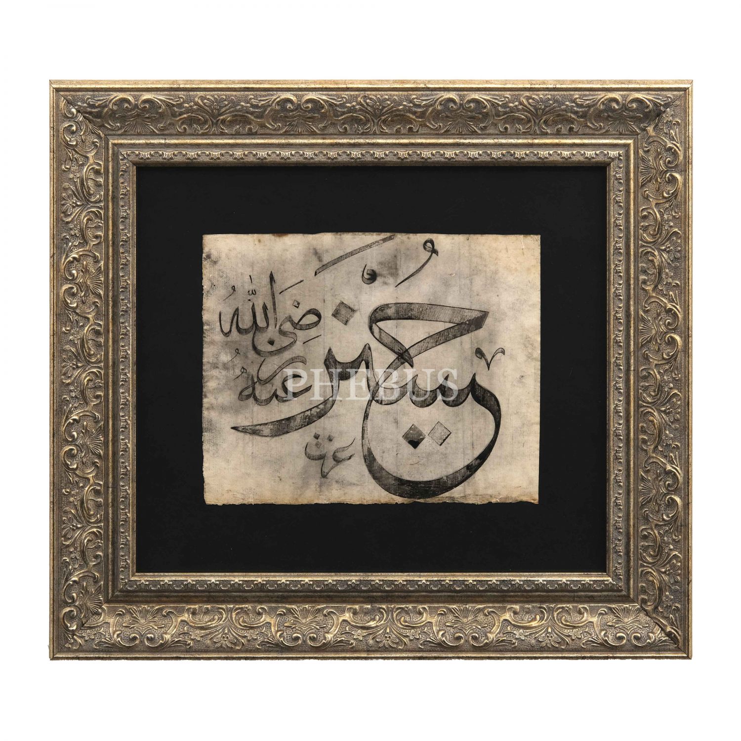 (Kazasker Mustafa) İzzet ketebeli celi sülüs "Hüseyin radıyallahu anh" yazısı, yazı ölçü: 25x20 cm, 35x30 cm...