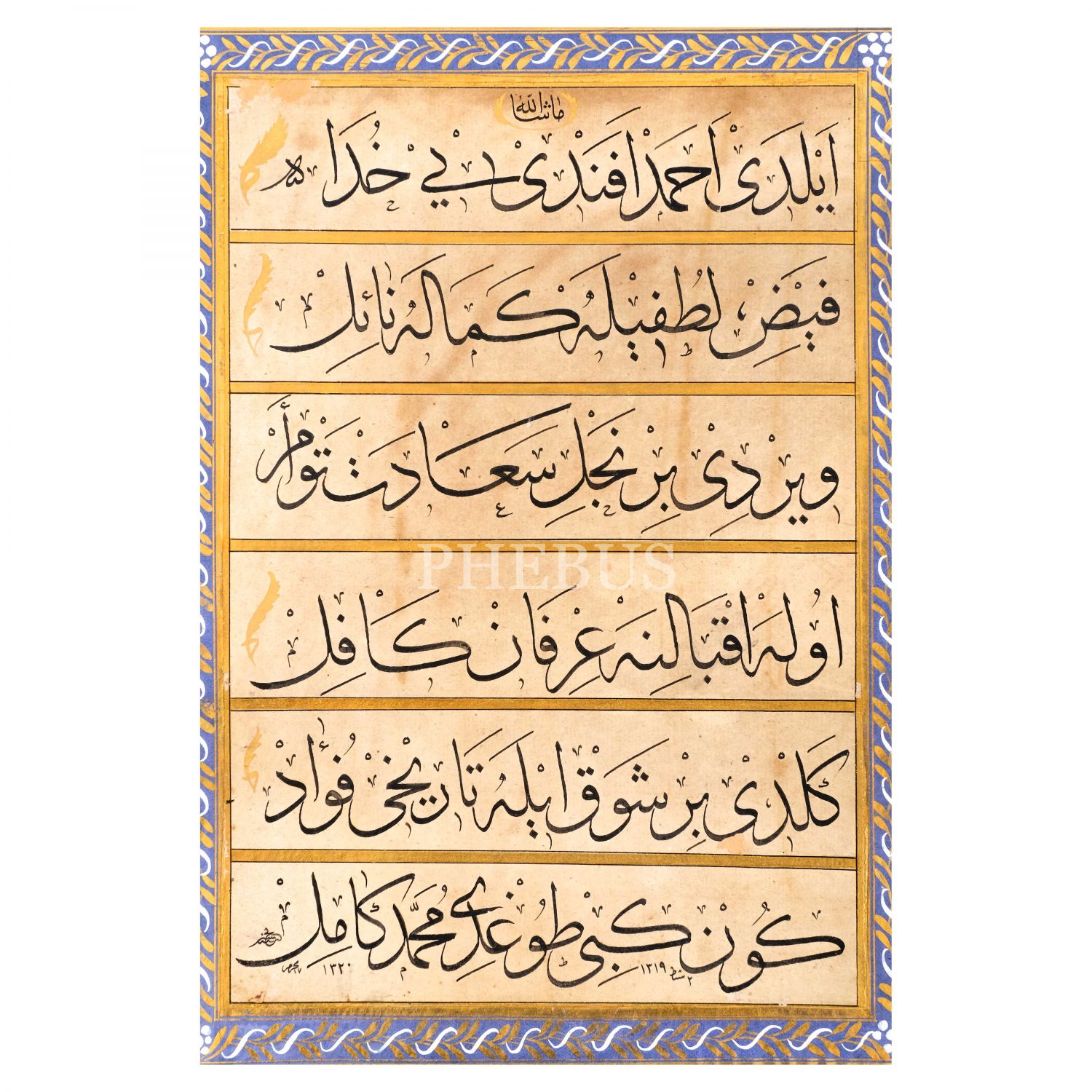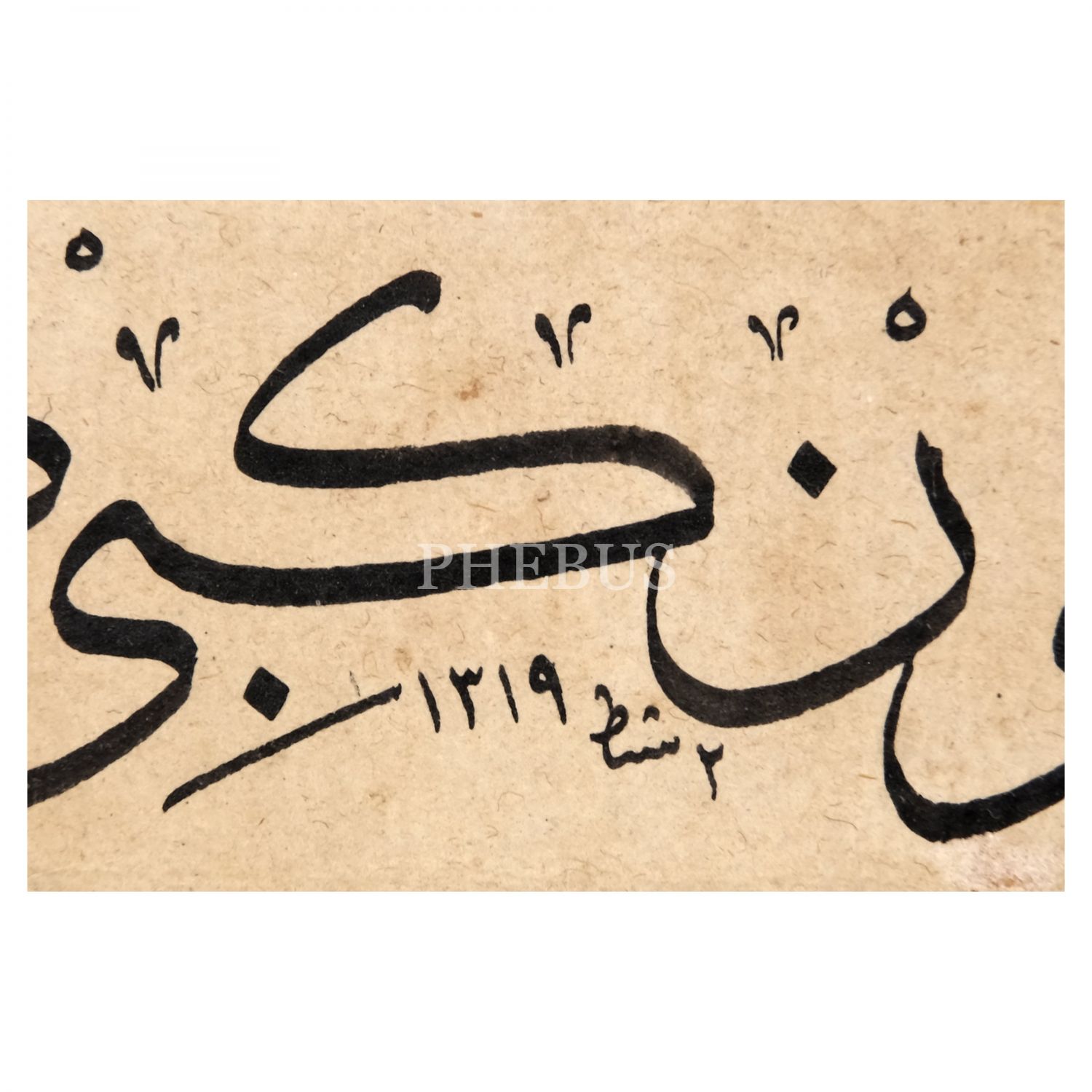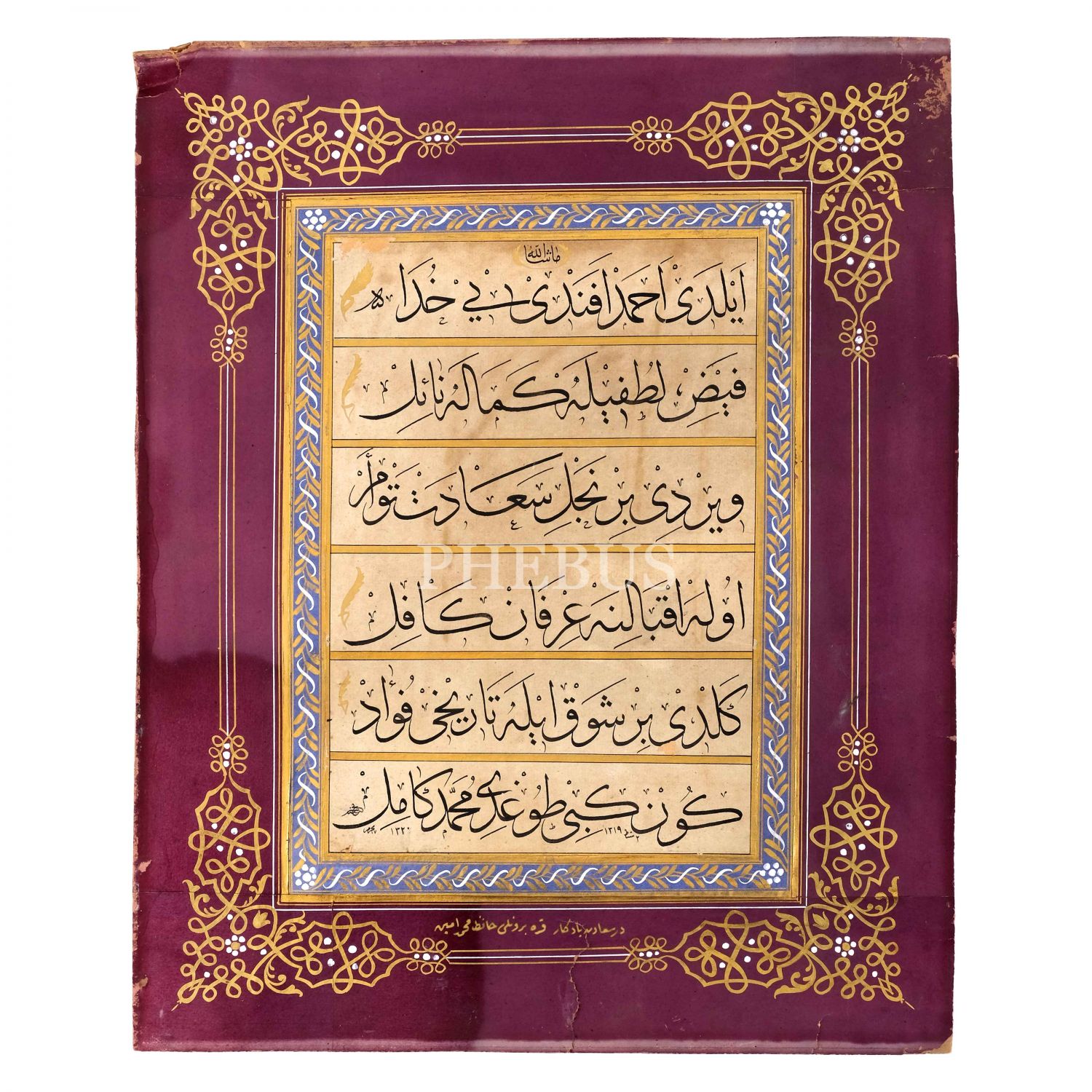 Tahsin ketebeli sülüs levha, hicrî 1320 tarihli, dönem tezhipli, yazı ölçü: 18x26 cm, mukavva ölçü: 34x42 cm...