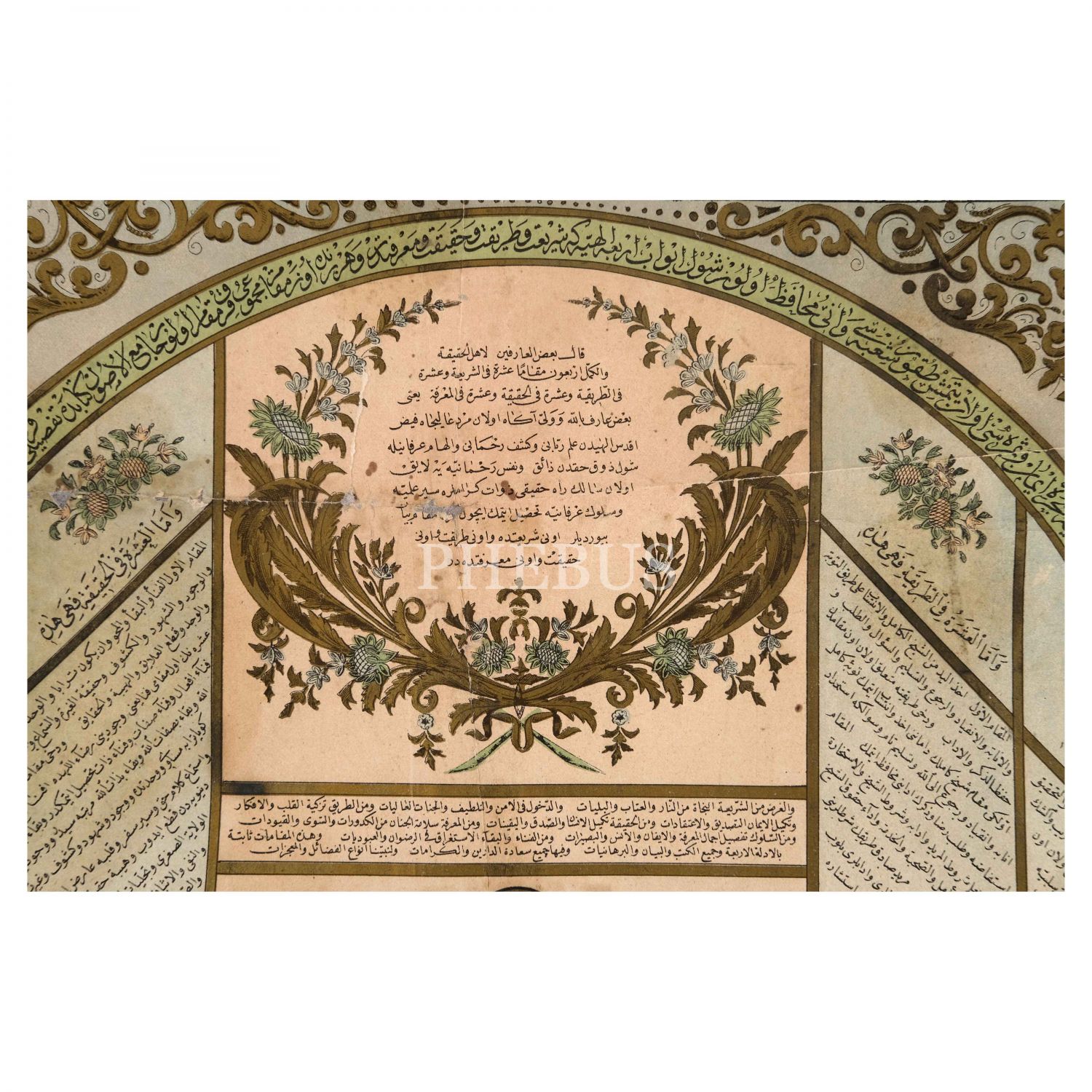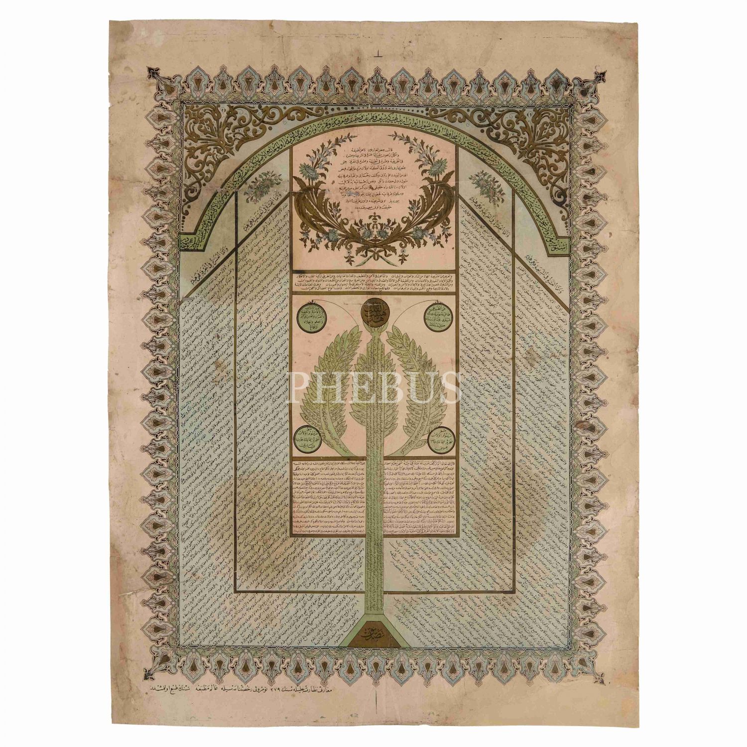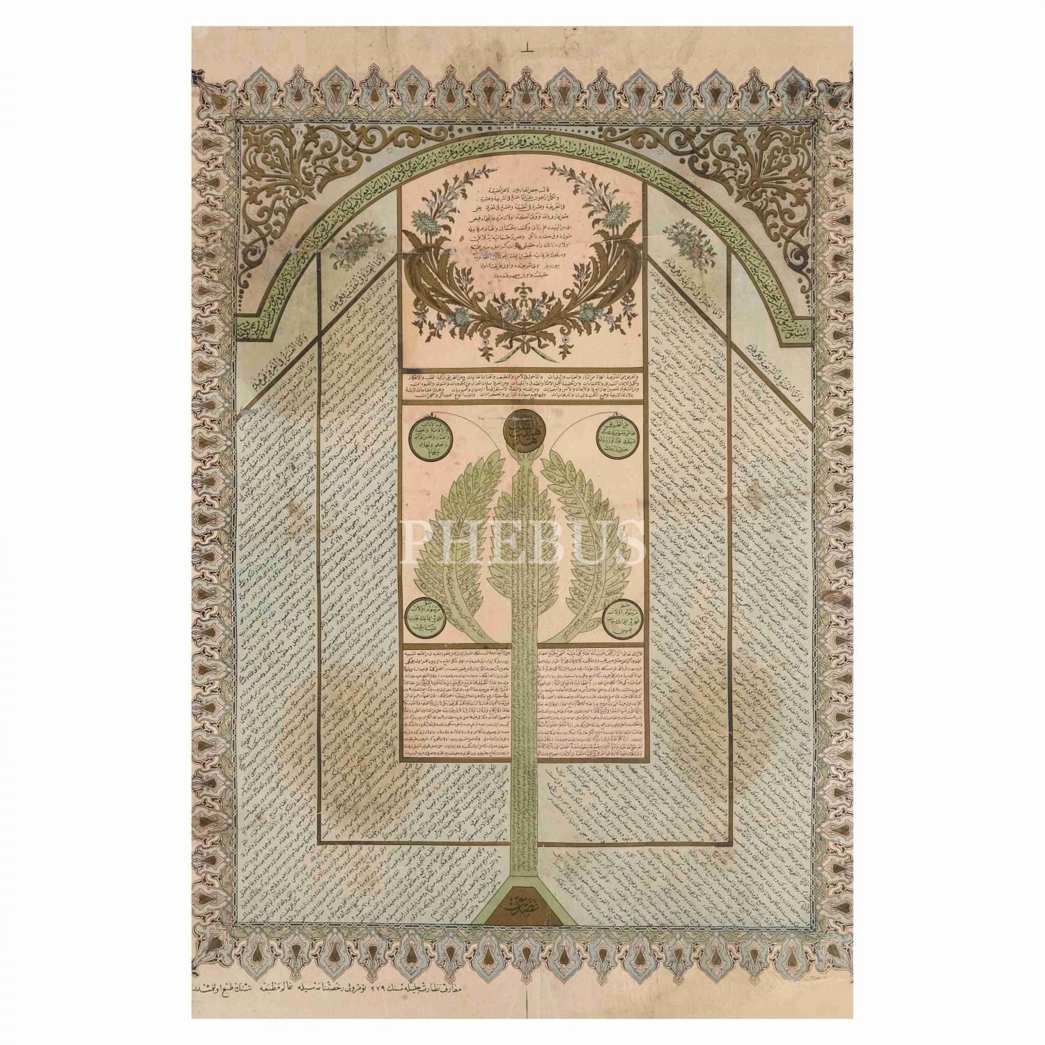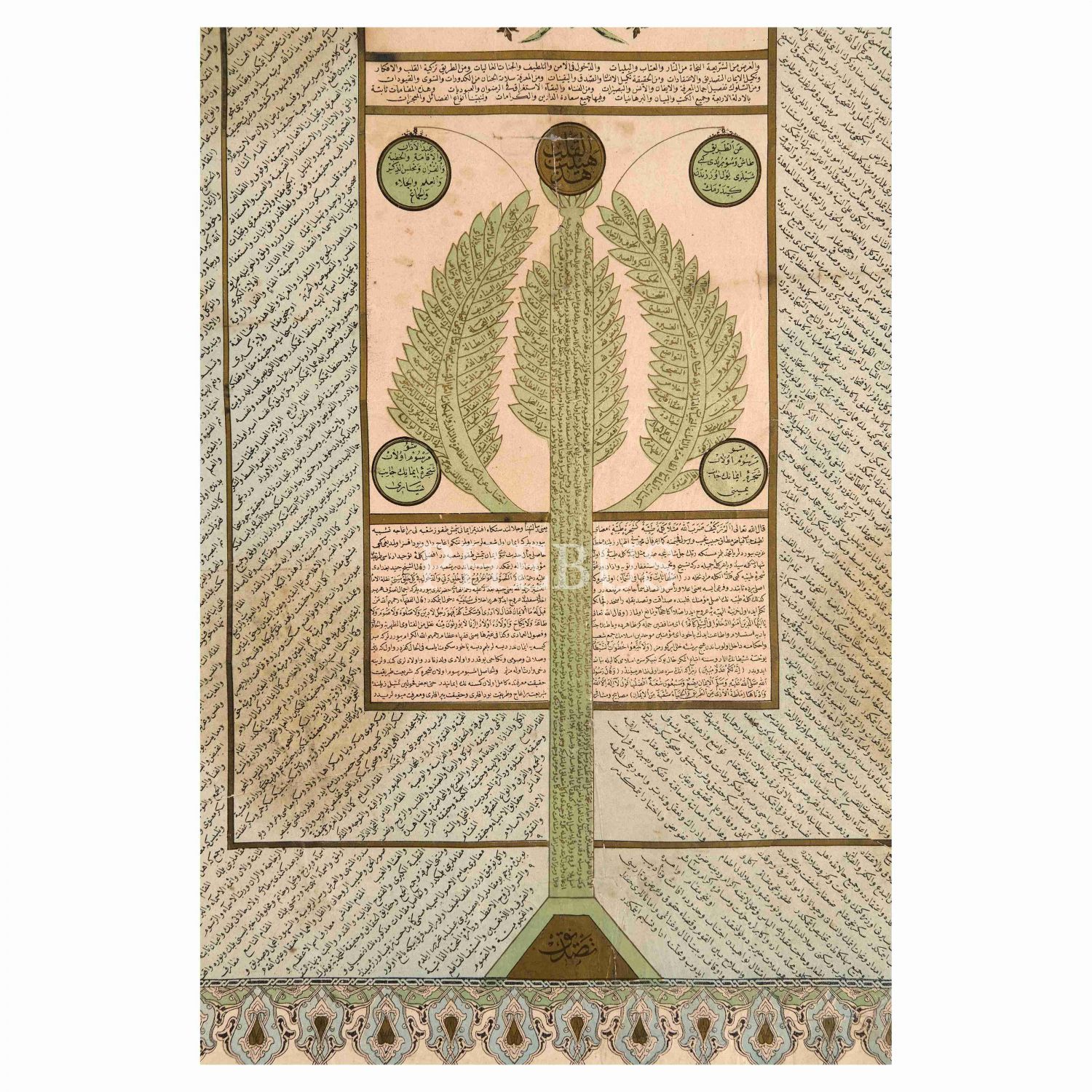 "70 şube, 4 kapı 40 makam" üzerinden imanı açıklayan Osmanlıca-Arapça metin. Ortasında iman ağacını temsilen hurma ağacı (nahl) çizimi vardır. Ağaçta kalbin durumu ve imanın amelde, ilimde ve kalpteki gerekleri listelenmiştir. Ağacın kökünde yazan "tasdik" imanı oluşturan en temel unsurdur. Kenarlardaki dört bölümde 10´ardan 40 kapı açıklanmıştır. Kapılar "şeriat, tarikat, hakikat ve marifet"ten müteşekkildir. Üstteki kemerdeki başlıkta şu yazılıdır: "İşbu mersûm olan şecere-i nahliyeye şebih Şecere-i Îmân ve semeresi olan yetmiş dokuz şubesi ve onu muhâfız olur. Şol ebvâb-ı erbaa-i ilâhiye ki şeriat ve tarikat ve hakikat ve marifetdir; ve her yerinde on makam, mecmûu kırk makam olur. Câmiu´l-Usûl kitab[ın]da tafsîli kırk bine bâliğ olur. Hattâ beyne´l-ekâbir makbul ve mergub ´hey´etü´l-kalb´ ismiyle müsemmâ bir levha-i acîbedir."