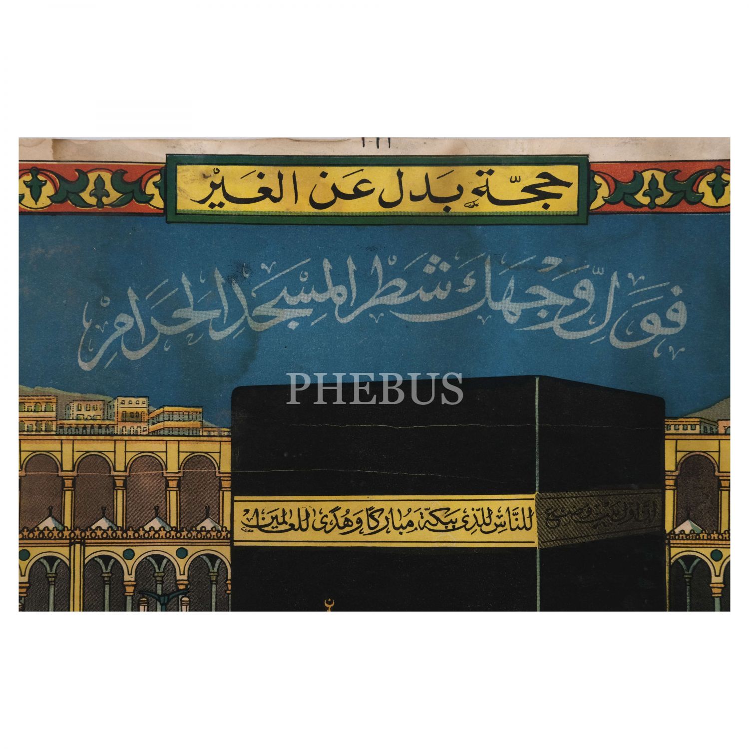 Kabe ve önemli mescidlerin resminin olduğu Arapça hac ve umre yapma belgesi. Alttaki beyaz kutuda hac ve umre için tarih, kişi ve şahitler için boşluk bırakılmıştır. Belgeyi alan kişinin ihrama girerek haccın farz, vacib, sünnet ve hükümlerini yerine getirdiği, sonra umreye de katıldığı bilgisi hazır olarak yazılıdır. Belge tamamen Arapçadır. En üstte "Bedel ani´l-Gayr" yani "Başkası Yerine Hac" başlığı vardır. Buradan belgenin vekâleten hacca gelenler için olduğu anlaşılıyor. Başlığın altında mihraplara yazılan iki âyetten biri olan "(Namazda) yüzünü Mescid-i Haram tarafına çevir!" mealindeki Bakara 149. âyeti yazılıdır.