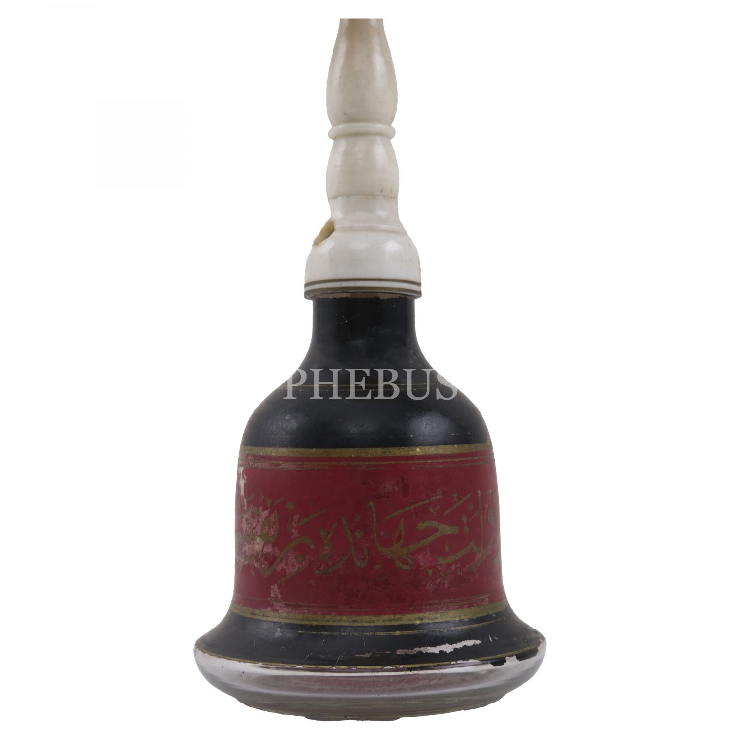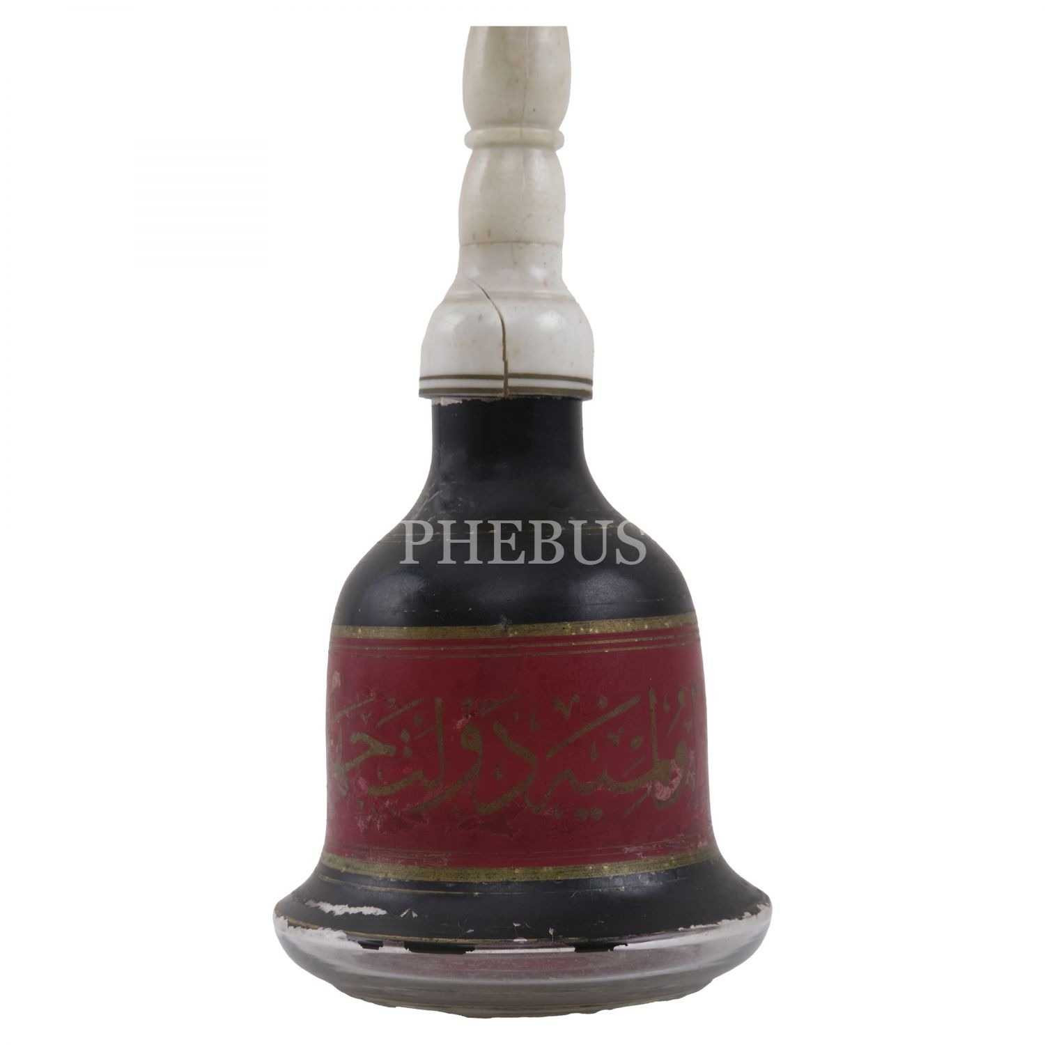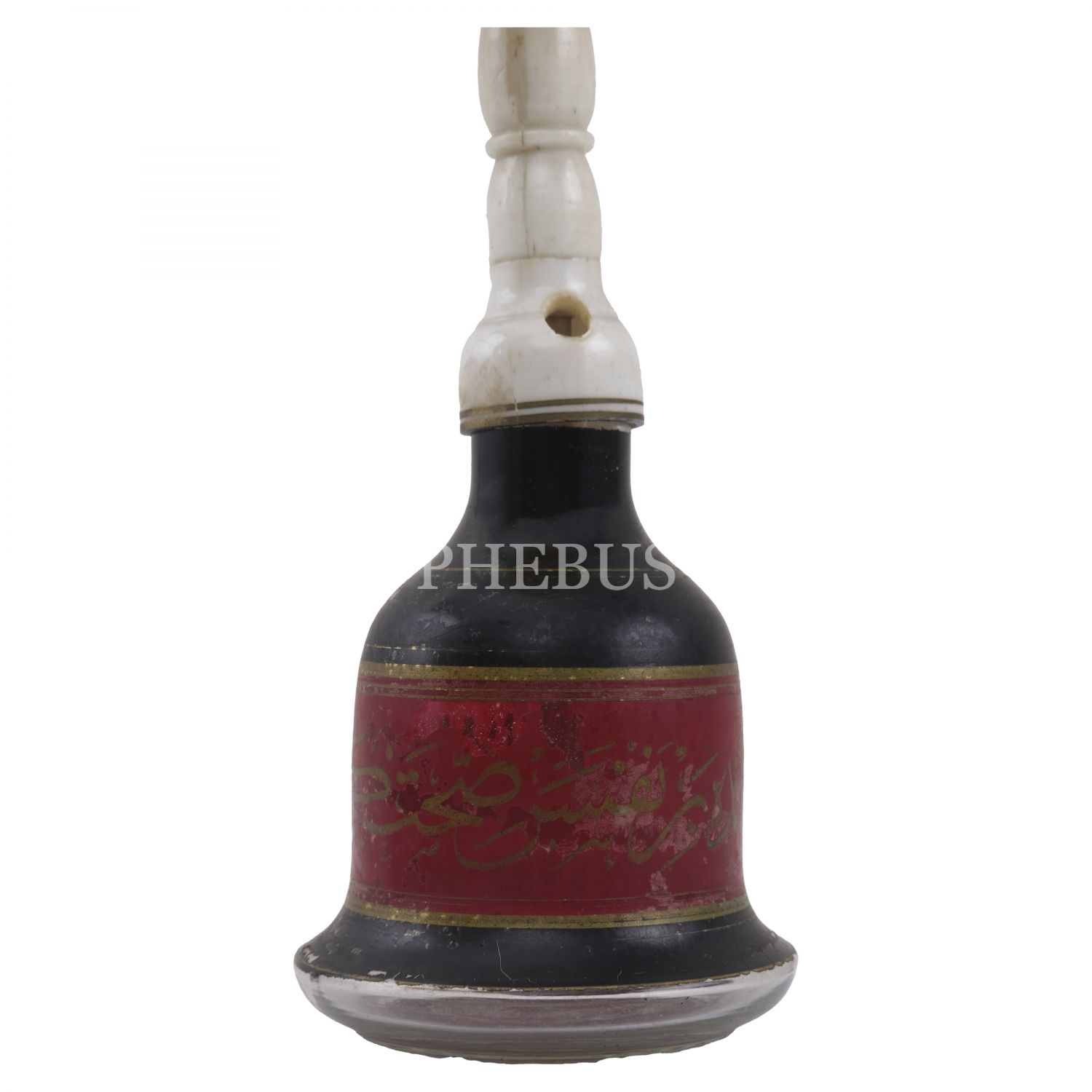 Şişesinde, Kanuni Sultan Süleyman'ın meşhur şiirinden "Olmaya devlet cihanda bir nefes sıhhat gibi" dizesi yazılı mini nargile, yükseklik 20 cm, şişe çapı 7 cm, marpuç uzunluğu 62 cm...