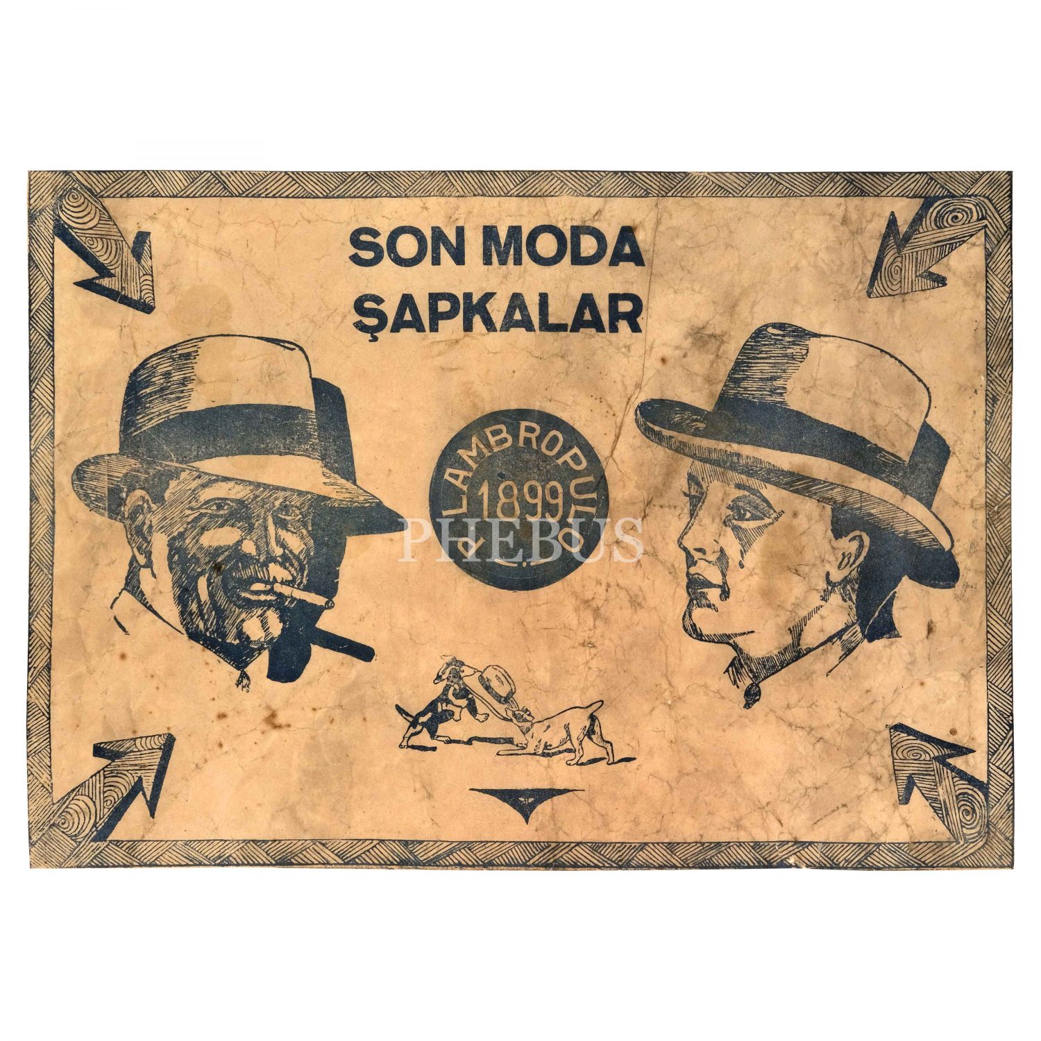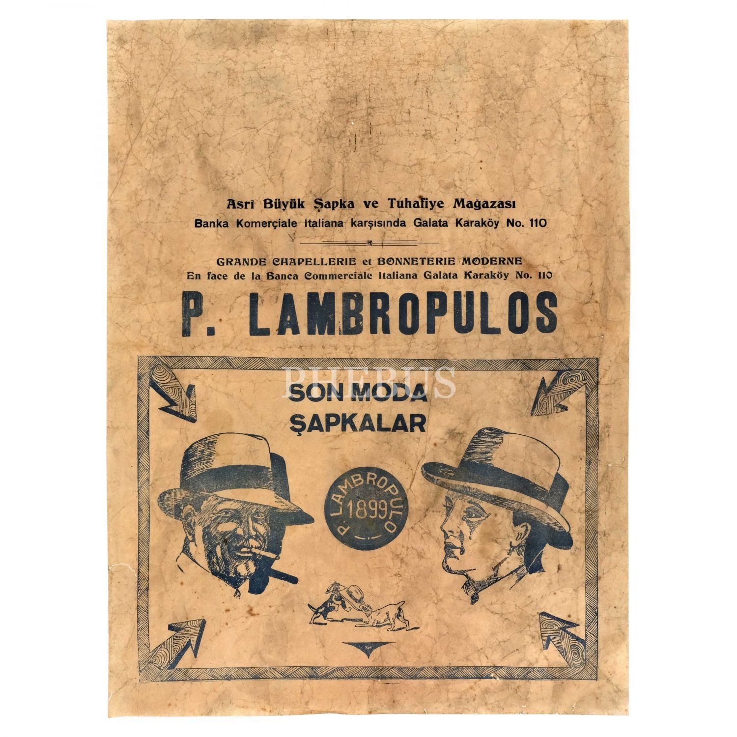 1899 yılında açılan Asrî Büyük Şapka ve Tuhafiye Mağazası P. Lambropulos´un, çift dilde adresli reklam afişi, 1930´lu yıllar, 42x56 cm...