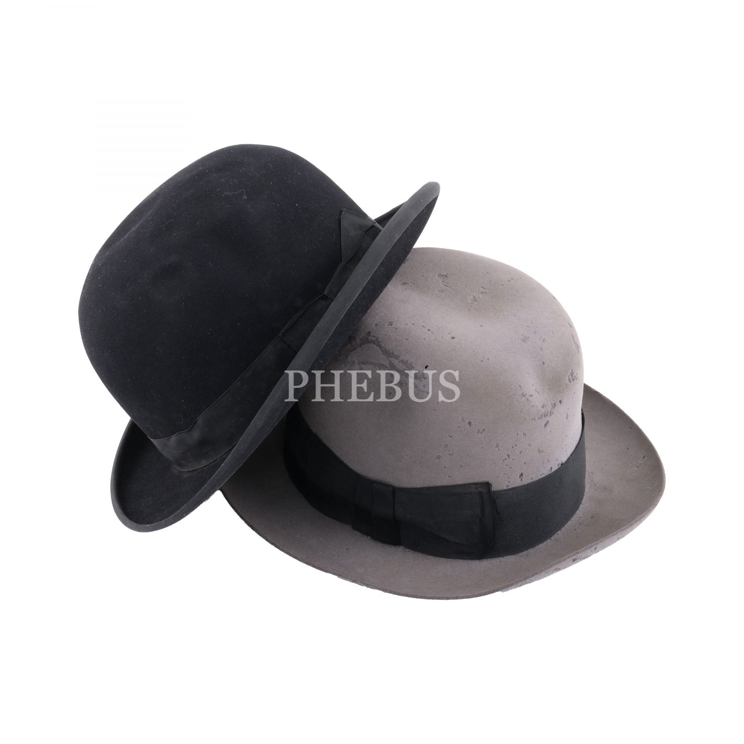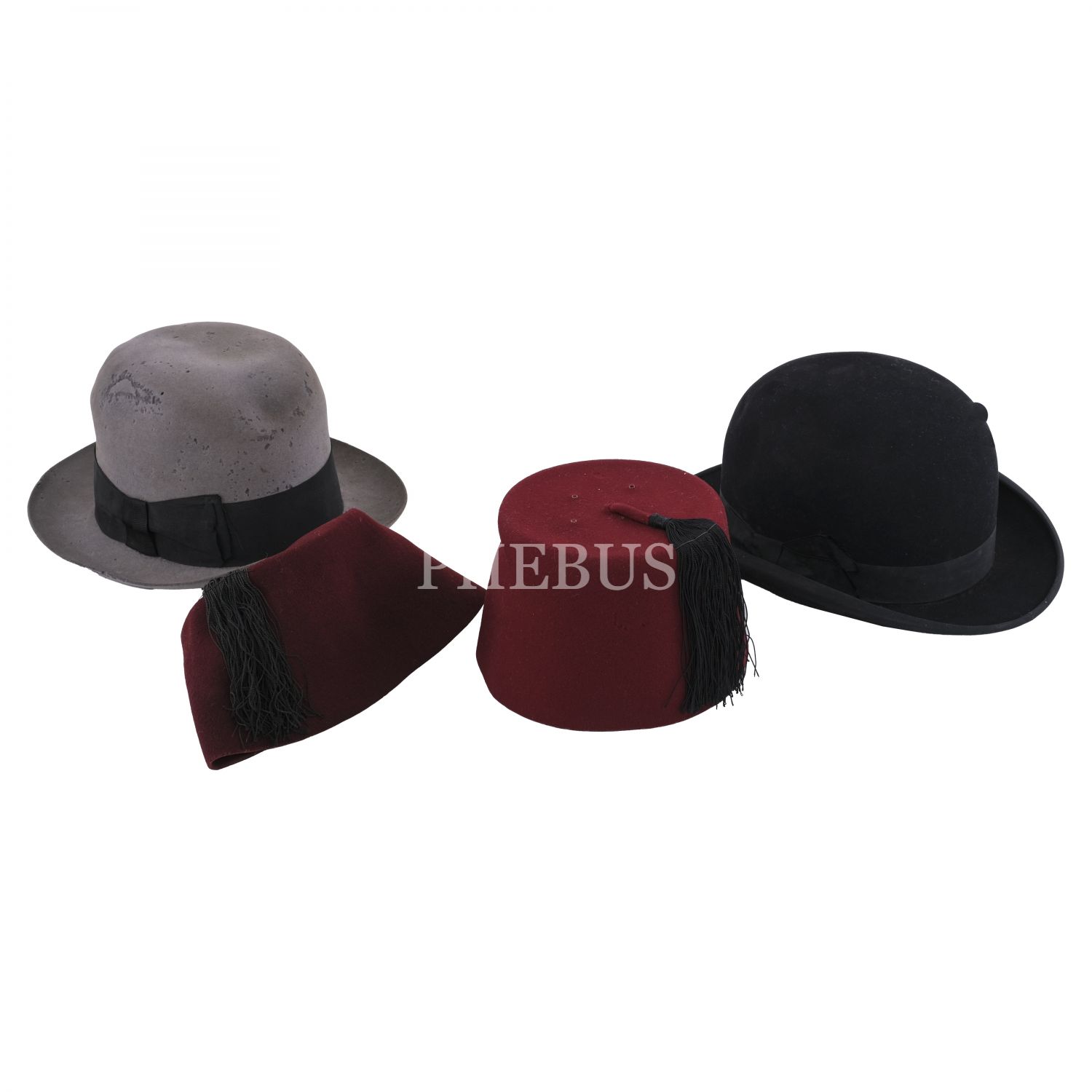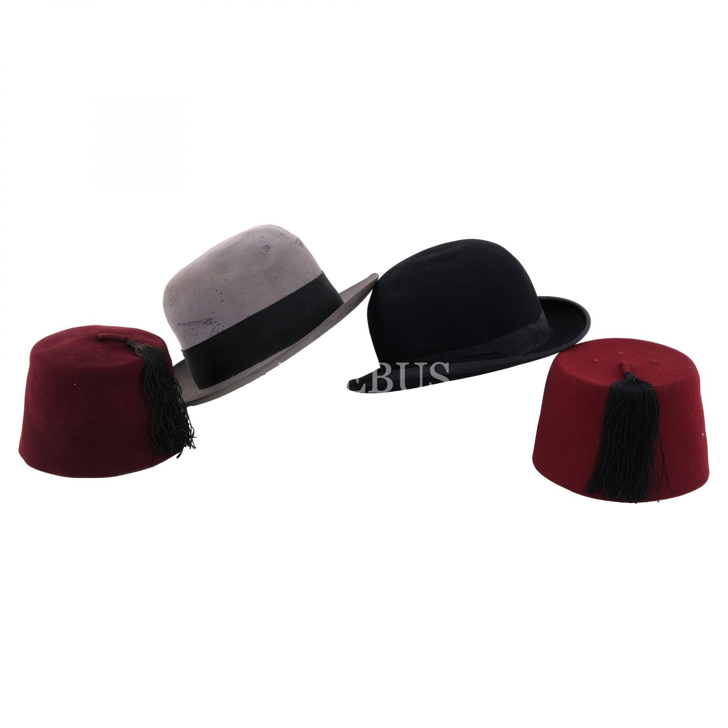 Osmanlı döneminden iki fes ve biri bowler (siyah renkli), diğeri fedora (gri renkli) stili iki şapka...