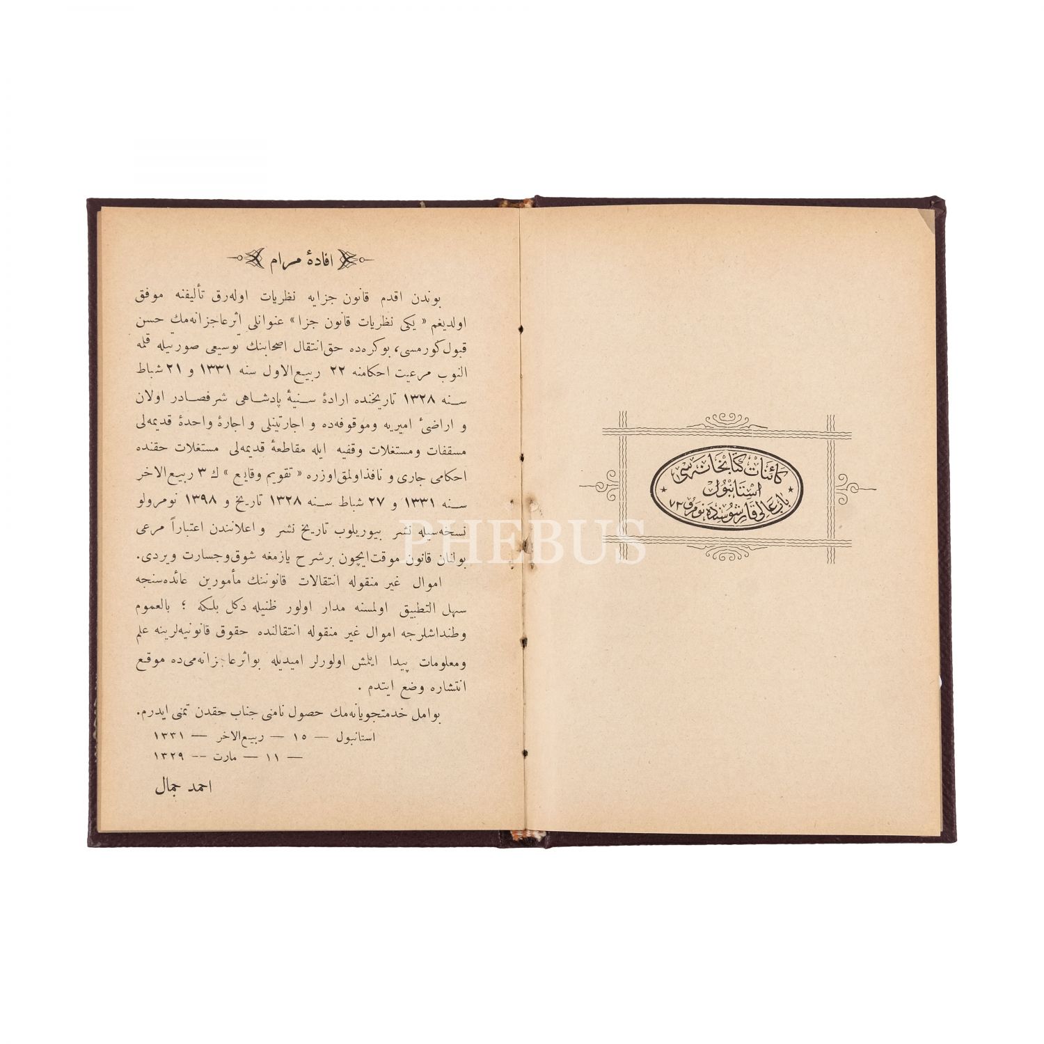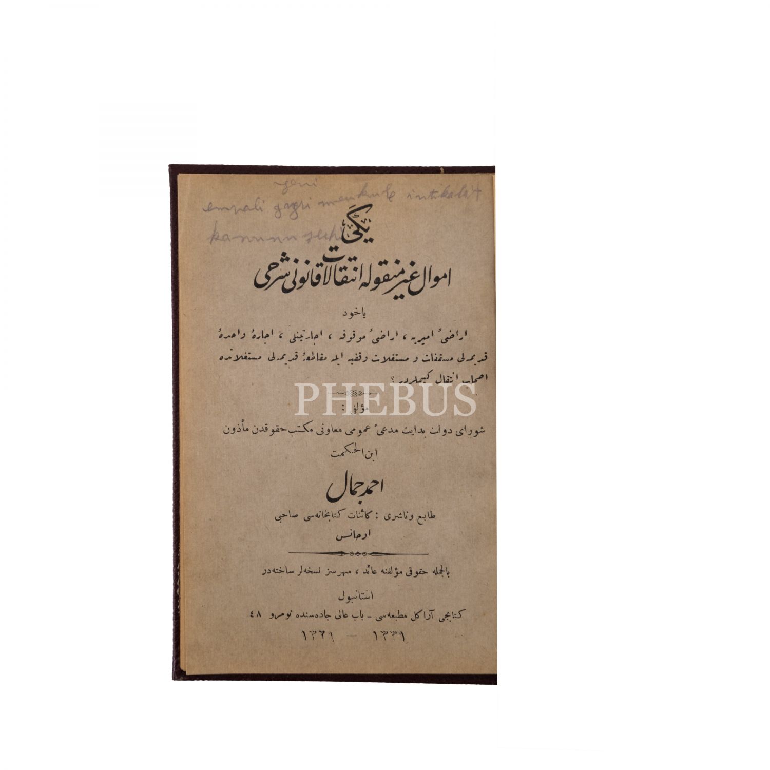 5. Ahmet Cemal Efendi´nin kaleme aldığı, "Yeni Emval-ı Gayrimenkule İntikalat Kanunu Şerhi" başlıklı Osmanlıca kitabı...