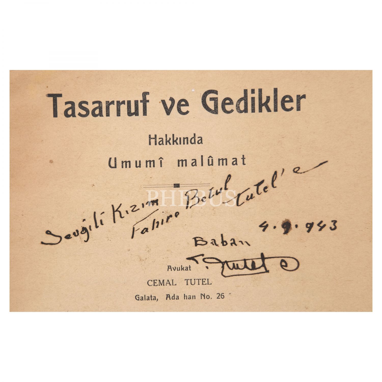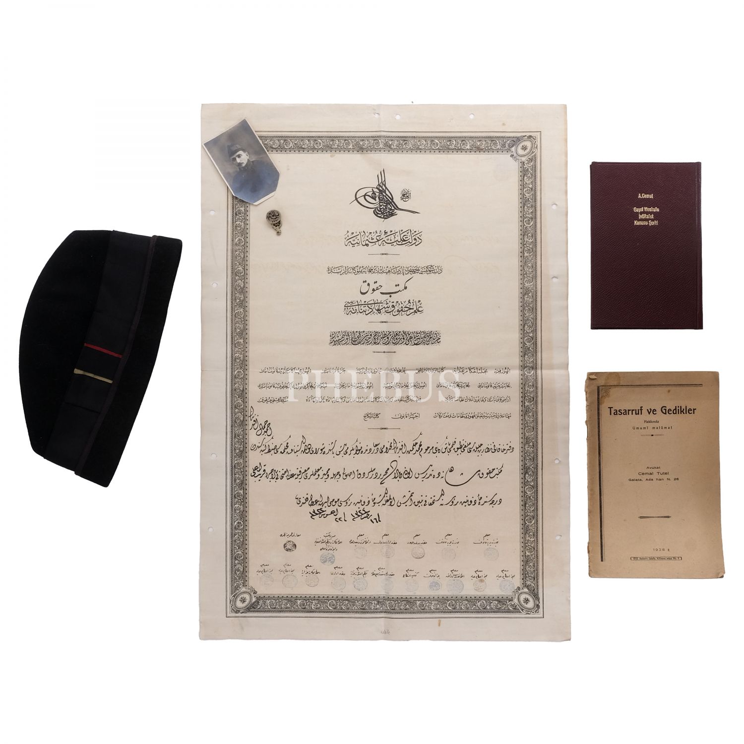 Osmanlı´nın son dönemi ve Cumhuriyet´in ilk yıllarında görev yapmış avukat Ahmet Cemal Tutel´in, Mekteb-i Hukuk diploması, hukuk alanında kaleme aldığı iki adet kitabı, cüppesi ve şapkasıyla çektirdiği fotoğrafı ile fotoğraftaki üniformasının bir parçası olan şapka ve Osmanlıca mührü...