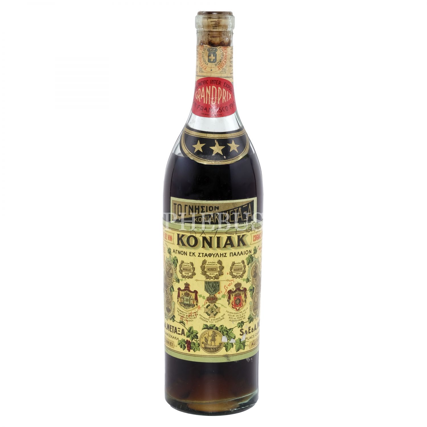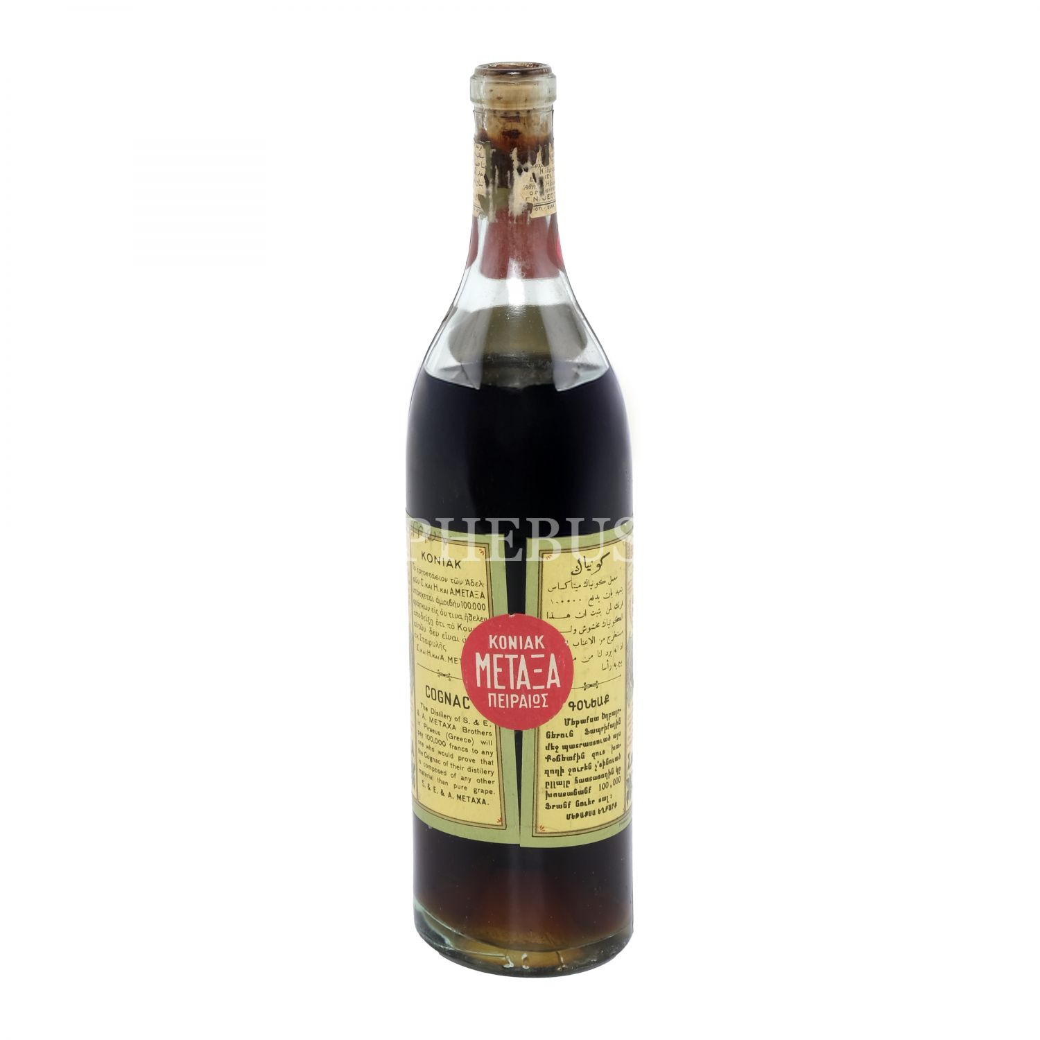 Osmanlı döneminden, Yunanistan menşeli Metaxa Biraderler Konyağı´nın dolu şişesi, Rumca, Ermenice, İngilizce ve Arapça olmak üzere dört dilde etiketli, 31x7 cm...