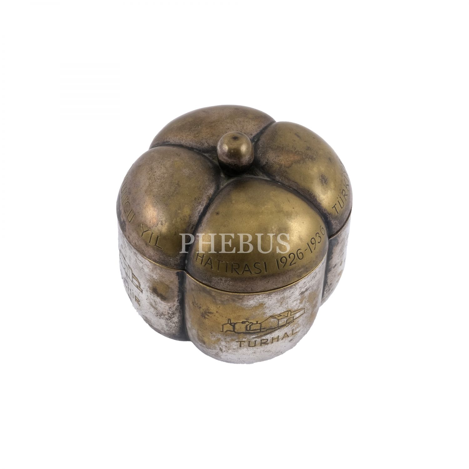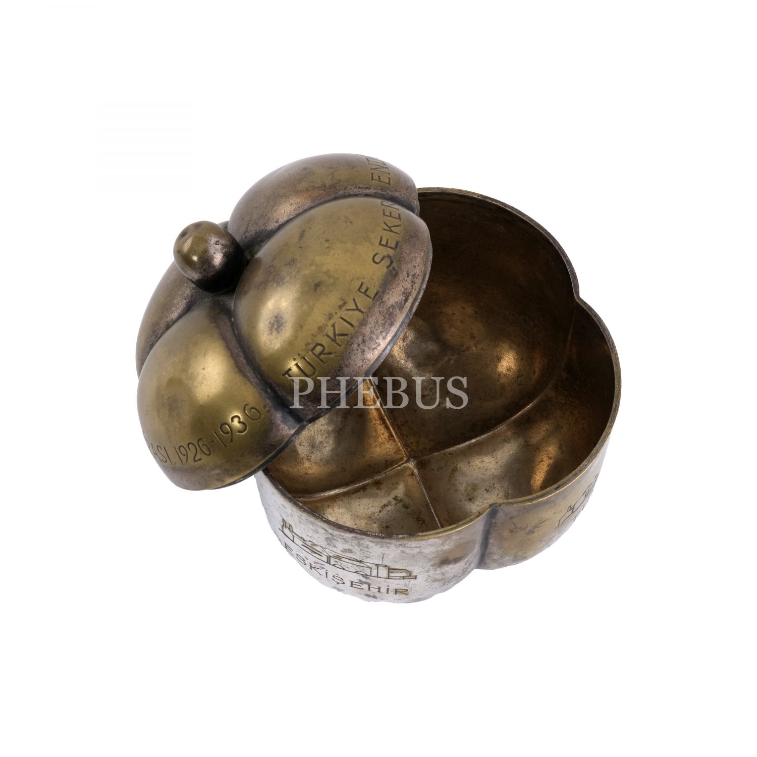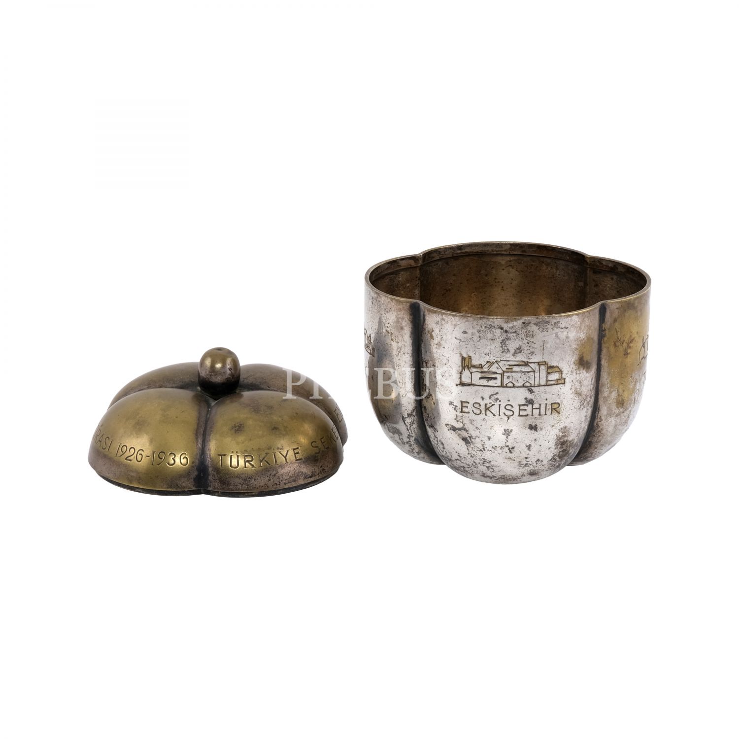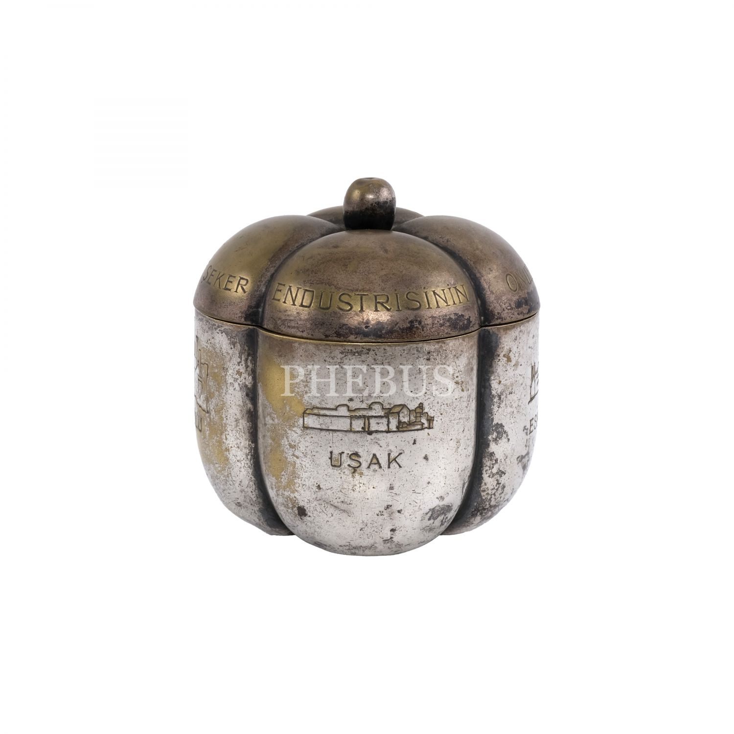 "Türkiye Şeker Endüstrisinin Onuncu Yıl Hatırası 1926 - 1936" yazılı, gümüş kaplama şekerlik, köşelerinde Uşak, Eskişehir, Turhal ve Alpullu Şeker Fabrikalarının isim ve tasvirleri yer almaktadır, 11,5x9,5 cm...