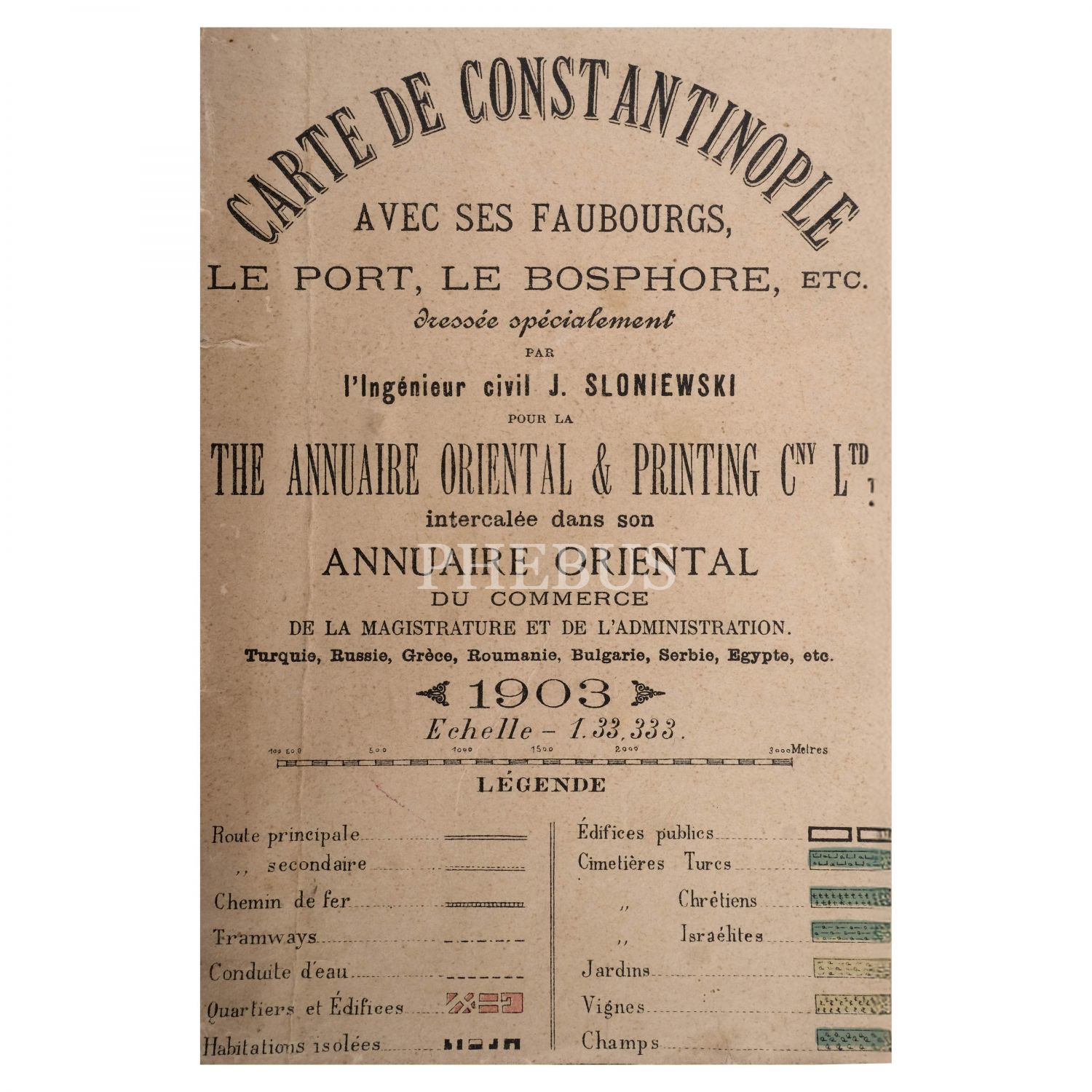 İstanbul´un banliyölerini, limanını, Boğazını vb. gösteren, bazı yerleşim bölgelerinin bugün kullanılmayan eski isimlerini içeren harita; Osmanlı İmparatorluğu ve çevresindeki bölgelerde yayımlanan Fransızca ticaret ve idari rehber yıllığının 1903 nüshası için hazırlanmıştır. Harita başlığı: "CARTE DE CONSTANTINOPLE avec ses Faubourgs, le port, le Bosphore Etc. dressee specialement par l´ingenieur Civil J. Sloniewski pour l´indicateur Oriental Annuaire du commerce de la Magistrature et de l´administration (Turquie, Russie, Grece, Roumanie, Bulgarie, Serbie, Egypte, etc.) -1903-"