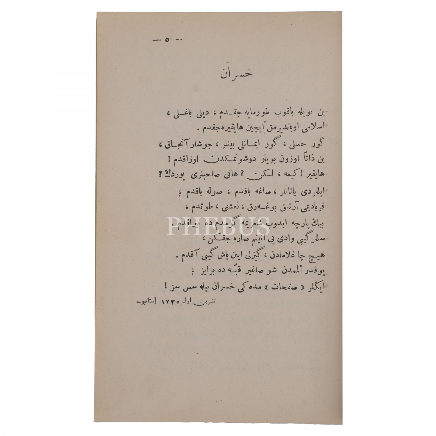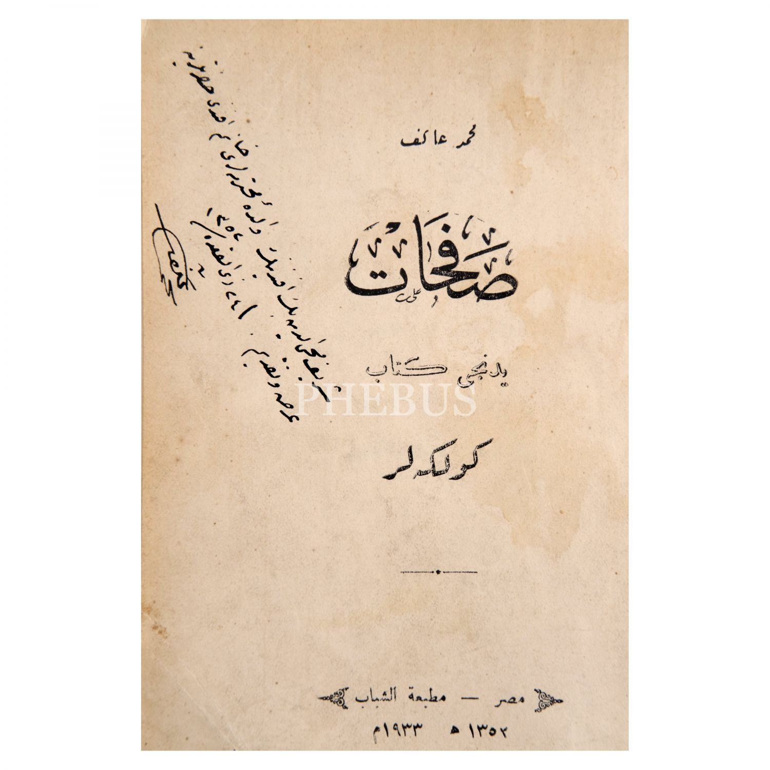 Mehmet Akif´in, yakın dostu Şefif Muhiddin Targan´ın annesine "Şerif Muhiddin Beyefendi´nin valide-i muhteremeleri hanımefendi hazretlerine arz-ı takdim" ithafıyla imzaladığı, Safahat´ın, 1933 yılında eski harflerle Mısır´da basılmış olan son kitabı...