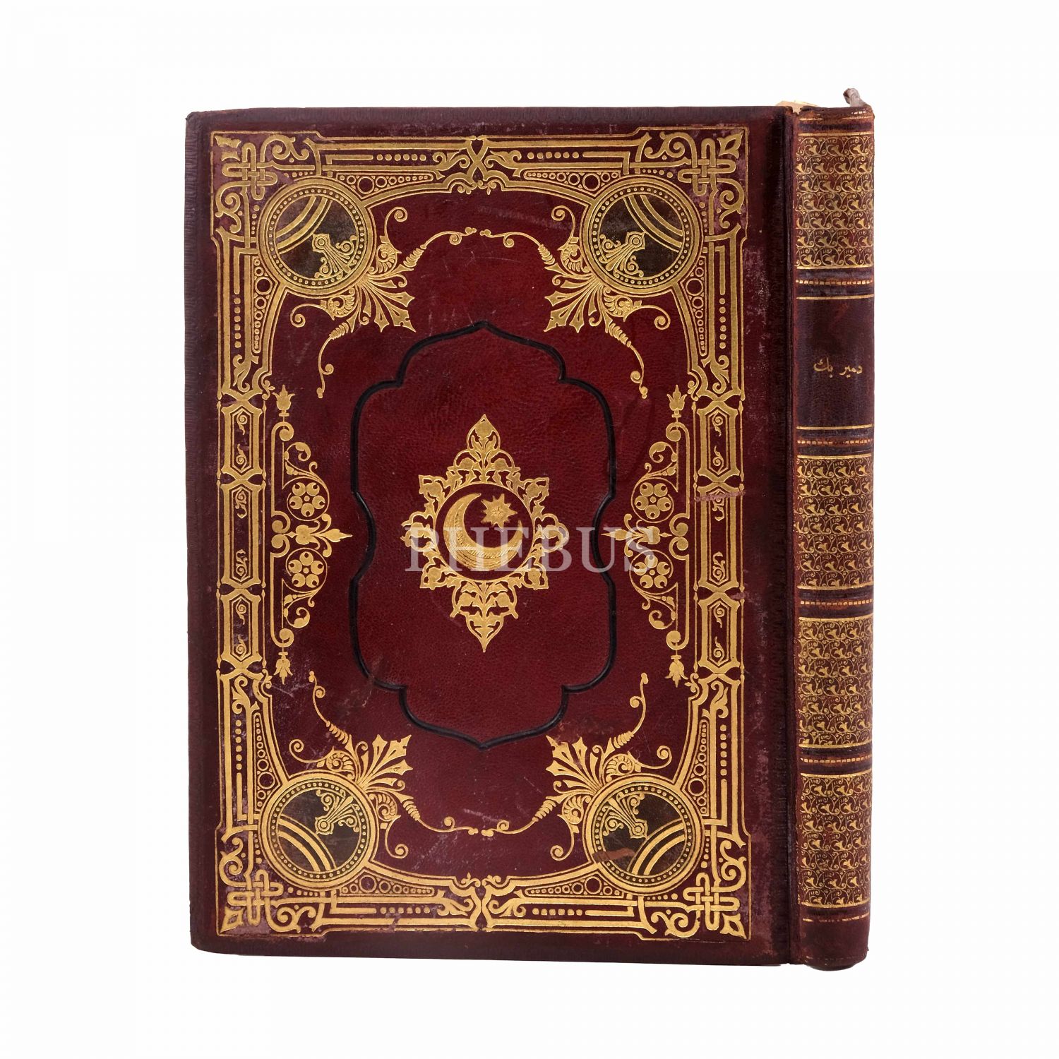 Kapakları hilal-yıldız ve floral desenlerle süslenmiş, sırtı altın yaldız panelli, sayfa kenarları altın yaldızlıdır.