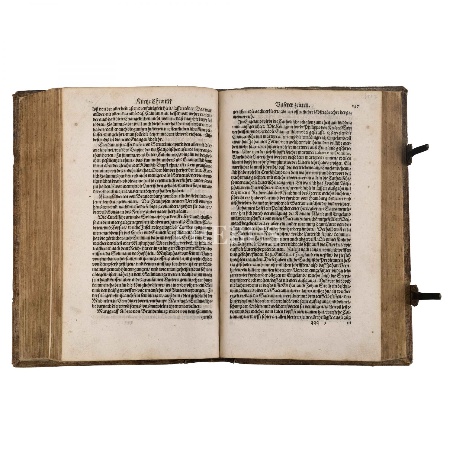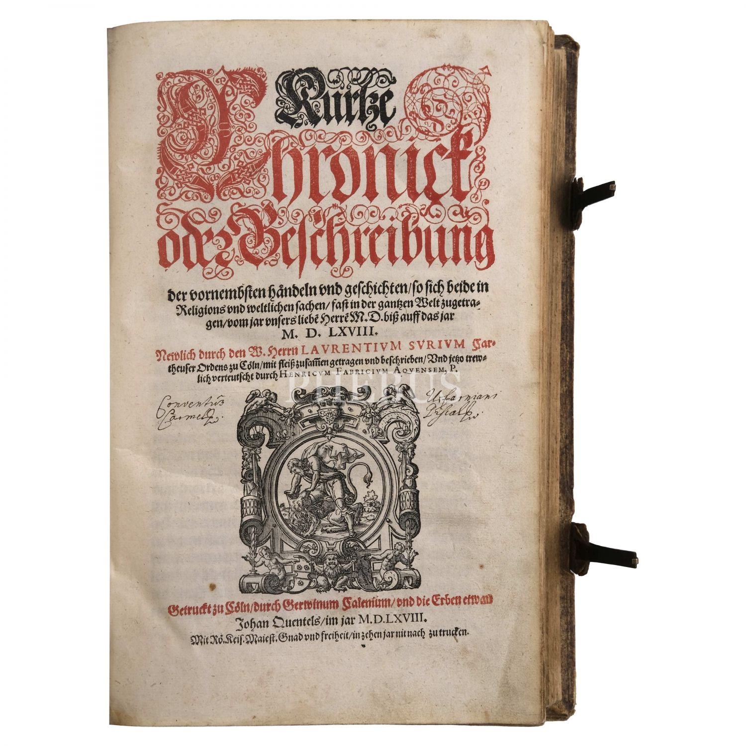 KURTZE CHRONICK ODER BESCHREIBUNG der vornembsten händeln vnd gschichten, so sich beide in Religions und weltlichen Sachen, fast in der gantzen Welt zugetragen, vom Jahr unsers lieben Herren. biß auff das jar 1568... Laurentius Surius, 1568, Gerwinum Calenium & Johan Quentel, Köln, 377 sayfa, 21x32 cm...