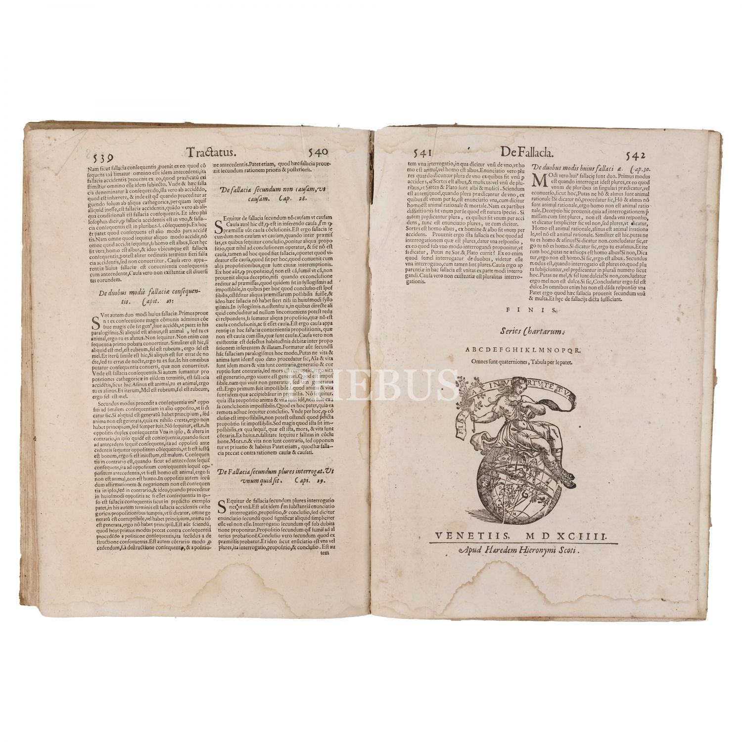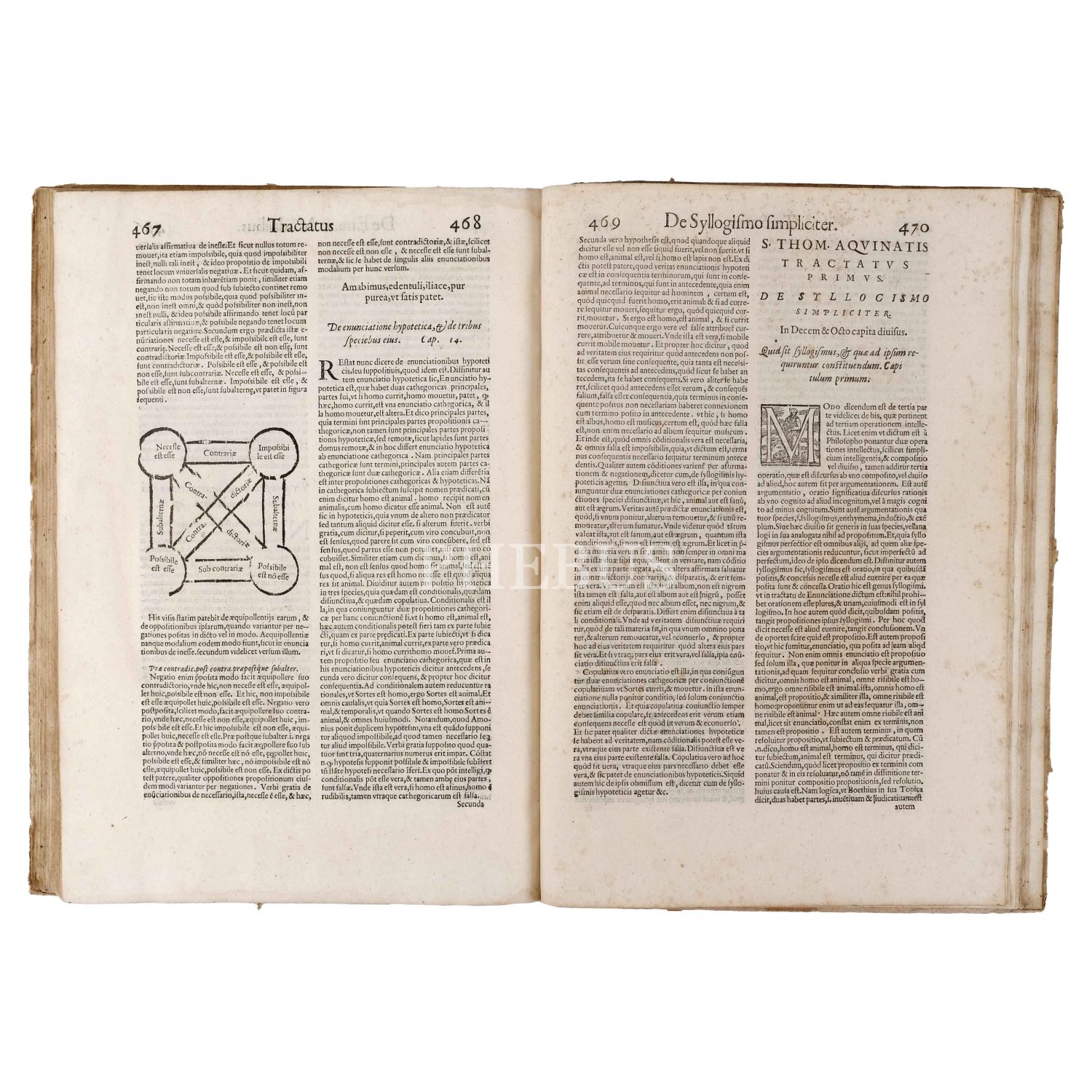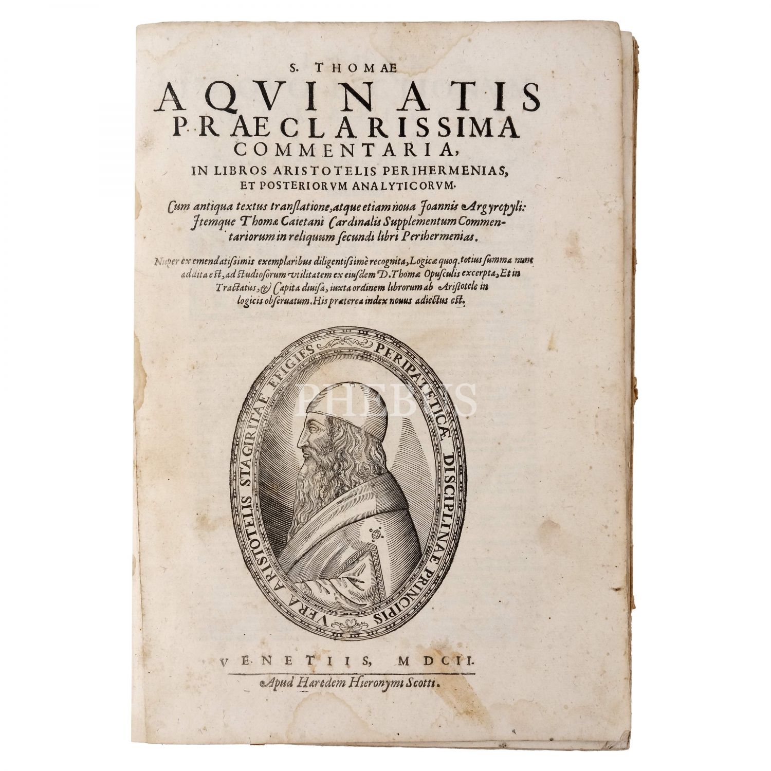AQUINATIS PRAECLARISSIMA COMMENTARIA, IN LIBROS ARISTOTELIS PER IHERMENIAS, ET POSTERIORUM ANALYTICORUM, Apud Haredem Hieronymi Scotti, 22,5x32,5 cm...