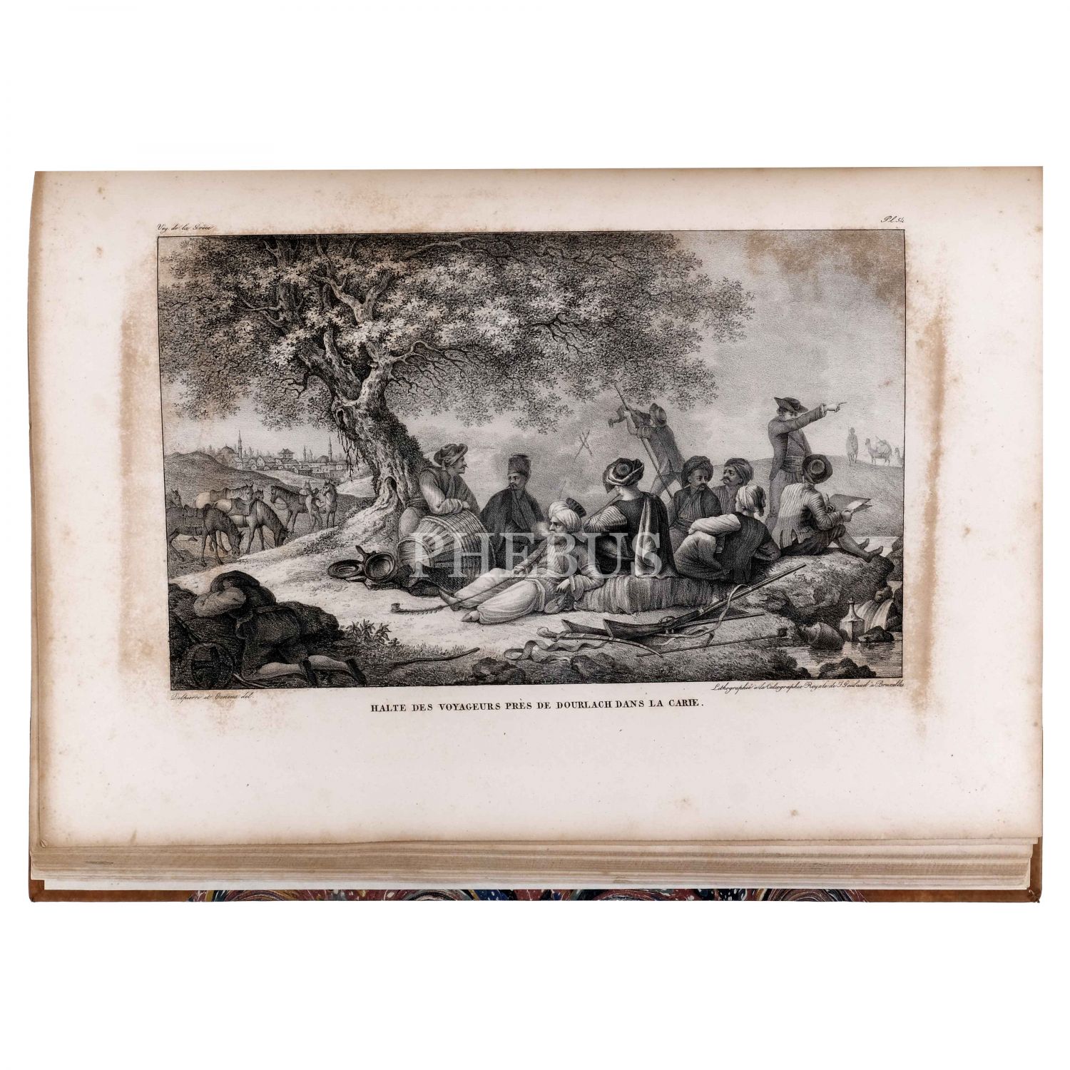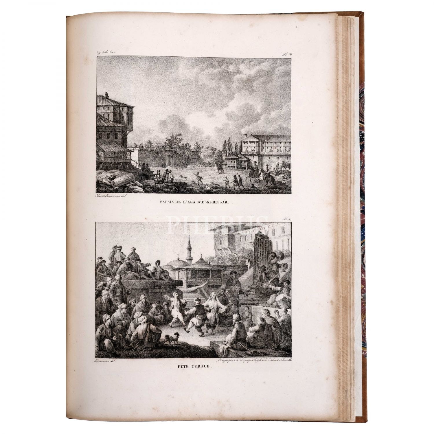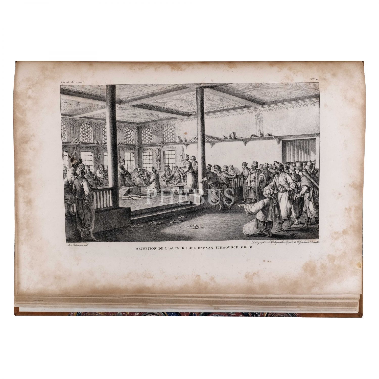 Fransız tarihçi, diplomat ve gezgin Marie-Gabriel-Florent-Auguste de Choiseul-Gouffier´ın, Yunanistan’ın antik kalıntılarını, coğrafyasını, toplumsal yaşamını ve manzaralarını kaleme aldığı seyatnamesinde yer alan gravür ve çizimlerin derlendiği, Brüksel baskı özel edisyon... Eserde, 1 katlanır harita (açık halde 74x54,5 cm boyutunda), 100 planş ve 28 ek gravür bulunmaktadır. Planş ve gravürler arasında Osmanlı İmparatorluğu sınırları altındaki bölgeler ve antik kentler de (İzmir, Efes, Bergama, Ege Adaları vd.) yer almaktadır. Sırtı panelli, altın yaldız dekor ve başlıklı, kapakları ebru desenli deri cildinde.