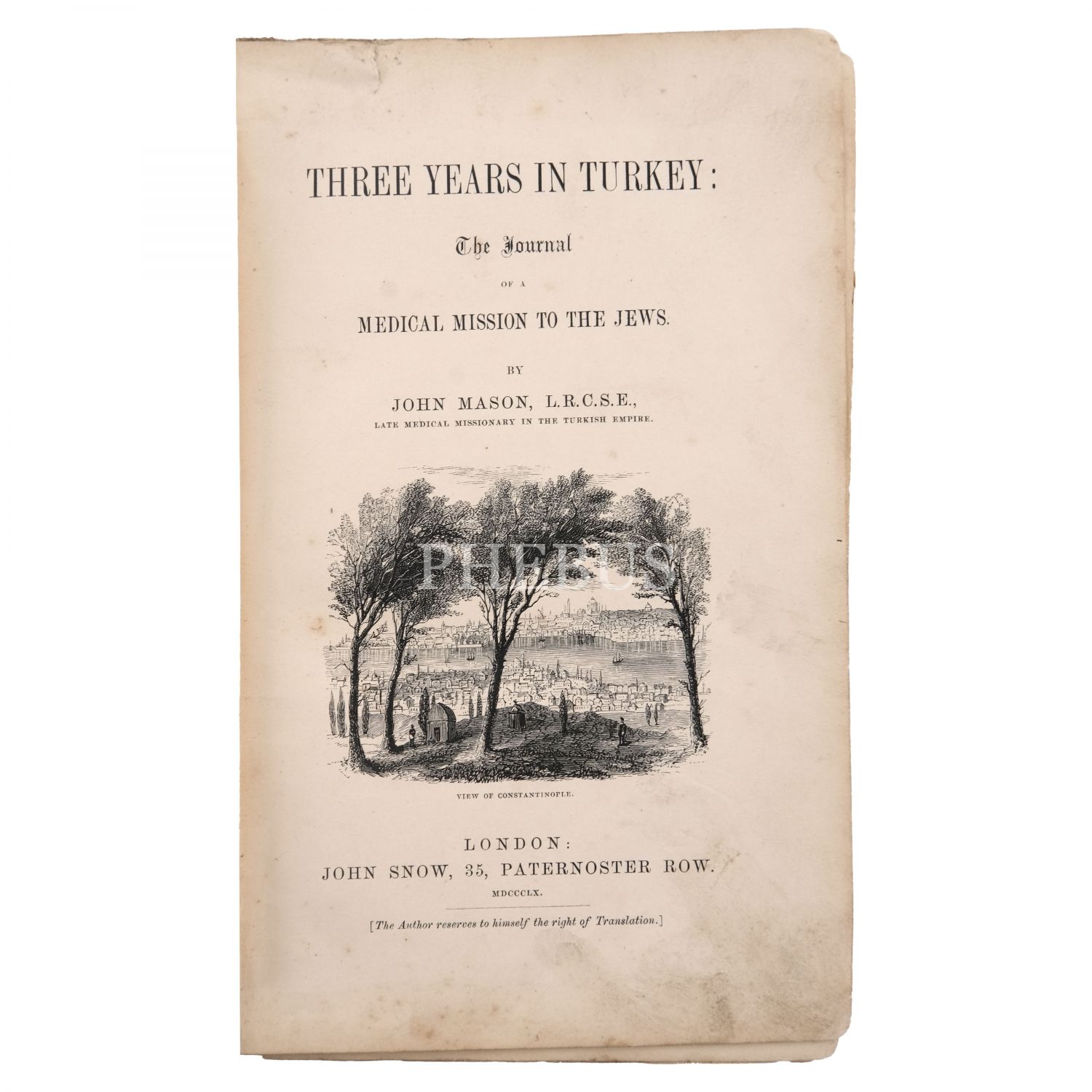 Türkiye´nin ilk tıp fakültesi Mekteb-i Tıbbiye-i Şâhâne´nin gelişme yıllarında, İskoçya Serbest Kilisesi´ni temsilen Osmanlı Imparatorluğu´na gelen İngiliz misyoner-hekim John Mason´ın günlük şeklinde kaleme aldığı seyahatnamesi. Görevi Osmanlı İmparatorluğu´nda yaşayan Museviler arasında Hıristanlığı yükseltmek olan Mason, İstanbul´da bulunduğu yıllarda çeşitli cemaatlerle ve cemaat ileri gelenleriyle, Hıristiyan misyonerlerle, hekim meslektaşlarıyla çeşitli temaslarda bulunur; dini törenlere, sohbetlere katılır. 12 Mayıs 1849´da İngiltere´ye dönmek üzere İstanbul´dan ayrılır. Ülkesine döndükten 11 sene sonra, kendi ifadesine göre Osmanlı İmparatorluğu´nda Hıristiyanlığın durumunu göstermek ve aynı zamanda bu tür tıbbi misyonları teşvik etmek amacıyla, dostlarının önerisiyle, seyahat esnasında tuttuğu günlüğünü ve notlarını 1860 yılında yayınlar. Tıp tarihimize dair önemli bilgilerin yer aldığı eserde, Sultan Abdülmecid´in 1848 yılında gerçekleştirdiği Galatasaray Mekteb-i Tıbbiyesi ziyareti de kaleme alınmıştı. Yayıncısının bez cildinde. Blackmer 1091