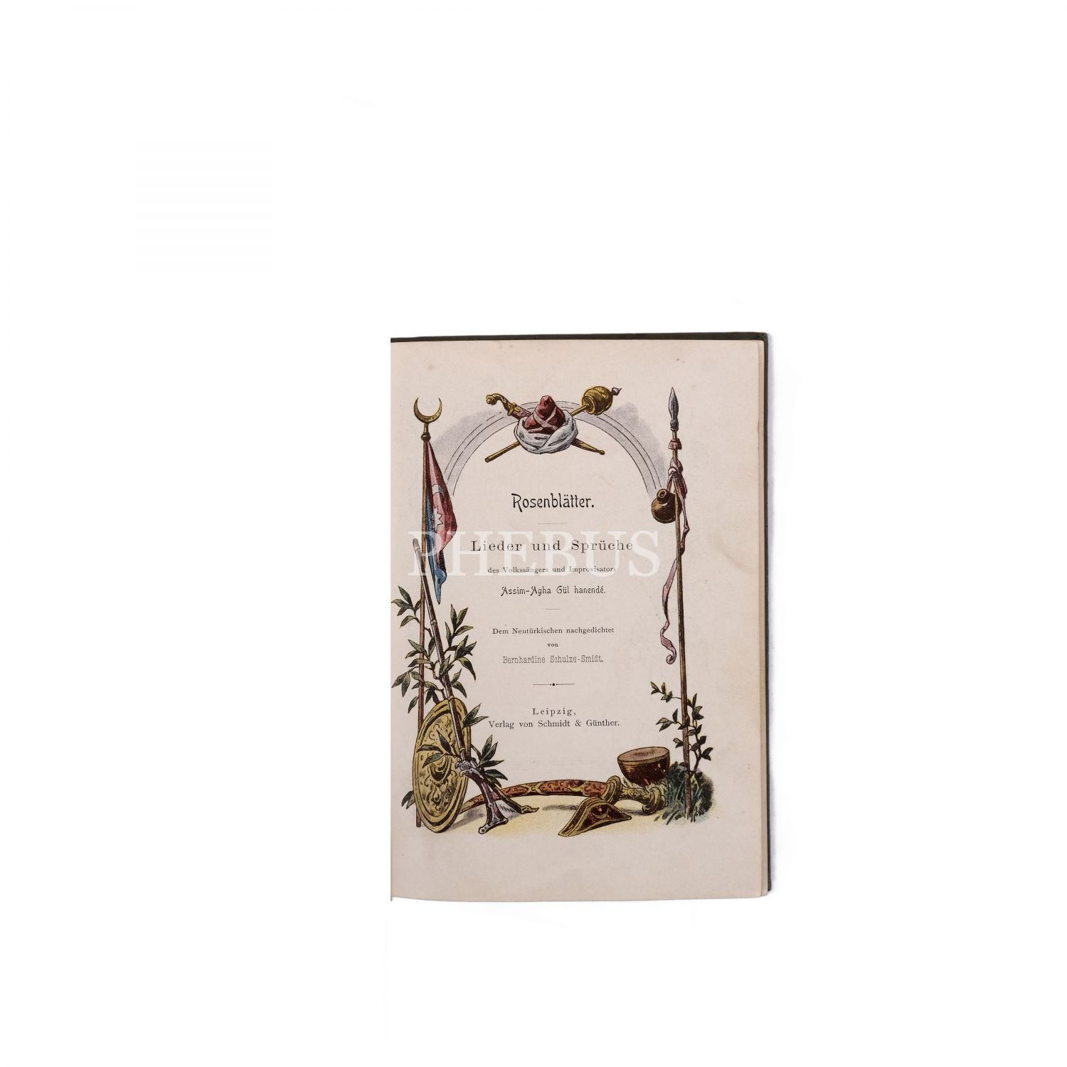 ROSENBLÄTTER: Lieder und Sprüche des Volkssängers und Improvisators Assim-Agha Gül hanende, Dem Neutürkischen nachgedichtet von Bernhardine Schulze-Smidt, 1893, Verlag von Schmidt & Günther, 143 sayfa, 13x18 cm...