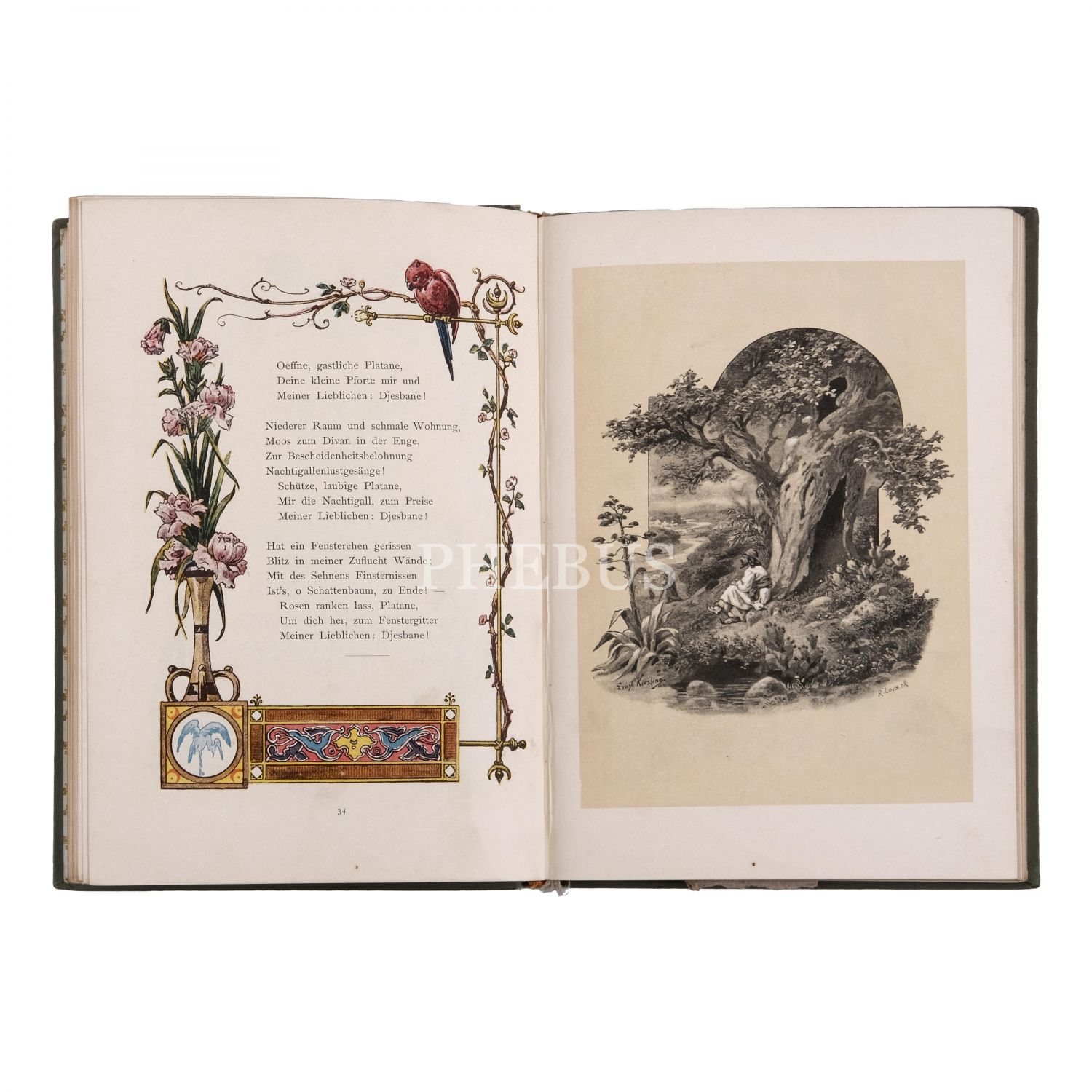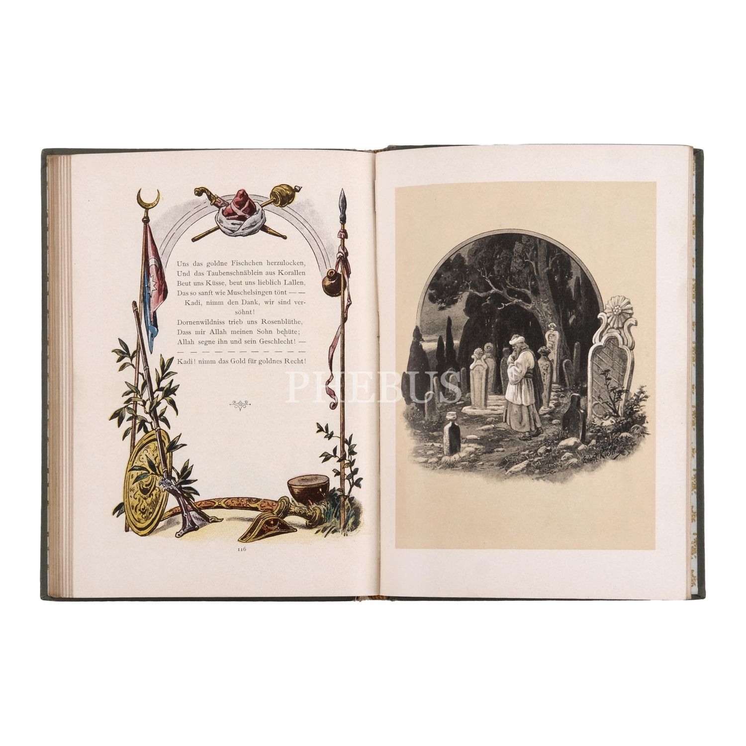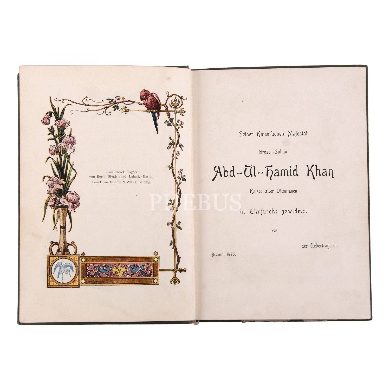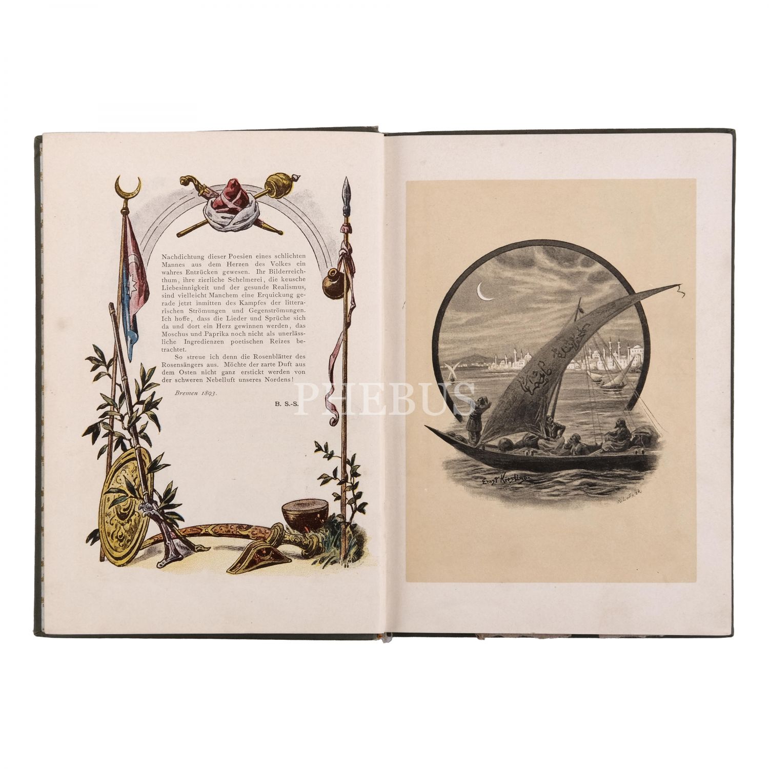 Alman yazar ve çevirmen Bernhardine Schulze-Smidt, daha çok romantik realist romanları ve seyahat yazılarıyla tanınsa da çok yönlü bir yazar olarak Rusça ve Osmanlı Türkçesi gibi dillerden serbest çeviriler de yapmıştır. Müzayedemizde sunduğumuz nadir eserini; İstanbul´dan Marsilya´ya yapılan dokuz günlük bir deniz yolculuğu sırasında, yol arkadaşlarından ikisinin (biri iyi eğitimli bir Türk, diğeri Anadolu´da görevli bir Fransız misyoner) aldığı yardımla tamamlamıştır. Smidt, çalışması sırasında ritimleri tespit etmek amacıyla eserdeki şarkı ve deyişleri, Asım Ağa (Gülhanende) isimli bir halk ozanına okutmuş; büyük bir dikkat ve titizlikle takip ettiği ritimleri Almanca´ya uyarlamıştır. Eserin ilk sayfasında, çalışmanın Sultan II. Abdülhamid´e -saygıyla- adandığını belirten bir yazı yer almaktadır. Kitapta yer alan metinler; Türk sancağı, mızrak, nargile, çarık, saz vd. Doğu´ya özgü renkli sembollerle çerçevelenmiştir. 4 adet gravür mevcuttur. Sırtı ve ön kapağı altın yaldız başlık ve dekorlu dönem cildinde. Sayfa kenarları altın yaldızlıdır.