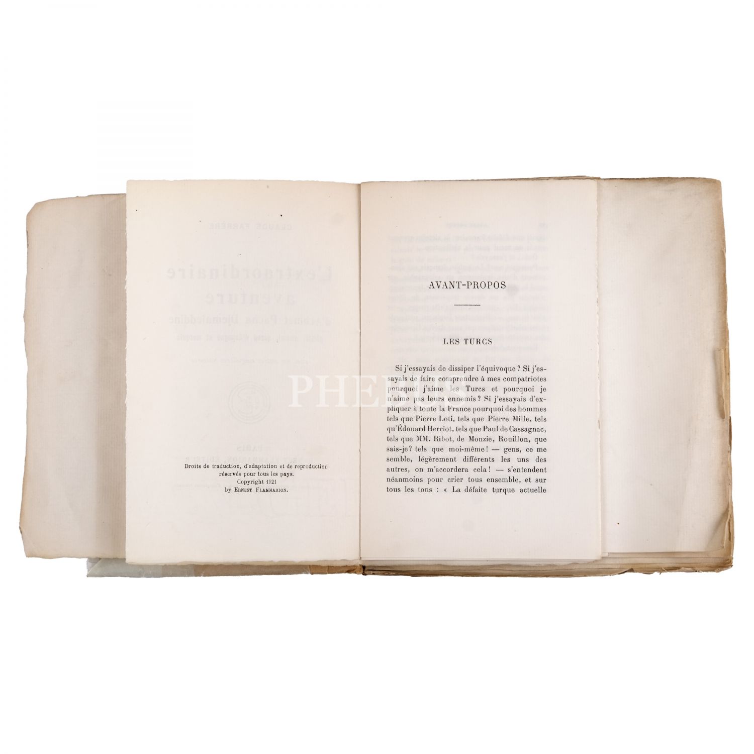 Türk Kurtuluş Savaşı´nda Türkiye´ye cephe alan kendi ülkesi Fransa´ya karşı Türkiye´yi destekleyen yazılar yazan Claude Farrere´in ithaf ve imzasıyla; Hollanda kâğıdına geniş marjinli olarak basılarak, 36´dan 240´a kadar numaralandırılmış 175 nüshanın 207 numaralı kopyası... Fransız akademisyen ve yazar Claude Farrere, Pierre Loti gibi aslen deniz subayıdır. Görevi gereği dünyanın birçok ülkesini dolaştı, Japonya´ya kadar gitti. Bu gezilerinden aldığı izlenimleri meslekten ayrıldığı 1919 yılından sonra romanlarında değerlendirdi. Claude Farrère, İstanbul´a ilk olarak 1902 yılında geldi. Türkiye´yi çok sevdi ve buraya bağlandı. Ardından 1908 yılında tekrar geldi. Türk dostu olarak ünlenen Claude Farrere’e 1910 yılında Osmanlı Devleti tarafından Mecidiye Nişanı verildi. 1939 ve 1950 yıllarında Türkiye´yi iki kez daha ziyaret etti. Türkiye üstüne edindiği olumlu izlenimleri kaleme aldığı makalelerde dile getirdi ve bütün Avrupa´ya duyurmaya çalıştı. Doğu’nun en parlak merkezi olarak Türkiye’yi Batı’ya karşı sürekli olarak savunan Farrere’in müzayedemizde sunduğumuz bu kitabı, kahramanlarının çoğu Türk olan yedi öyküden meydana gelmektedir.