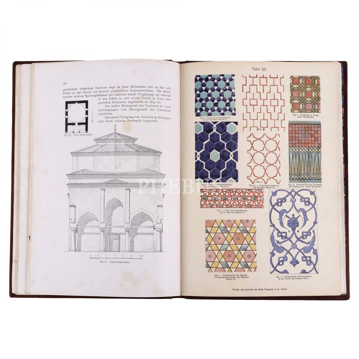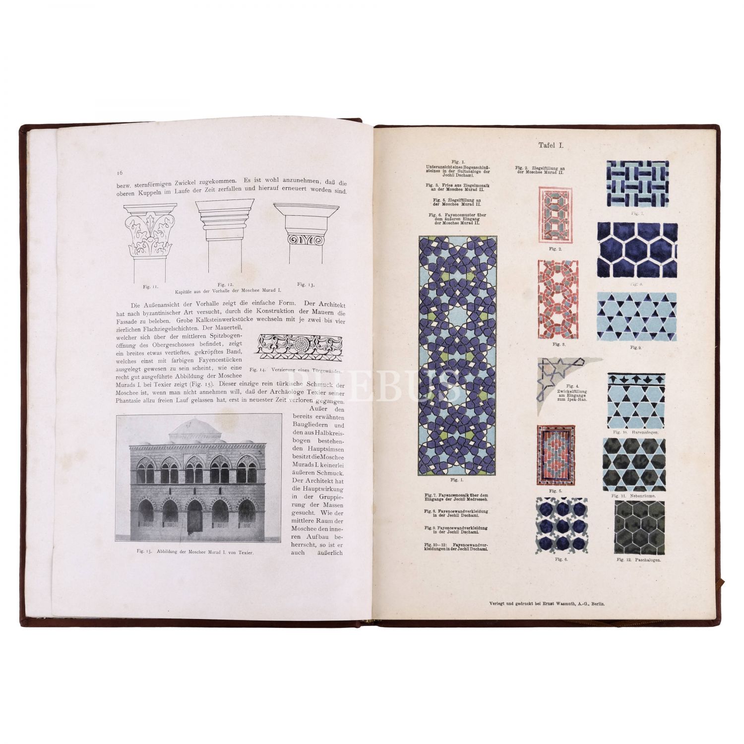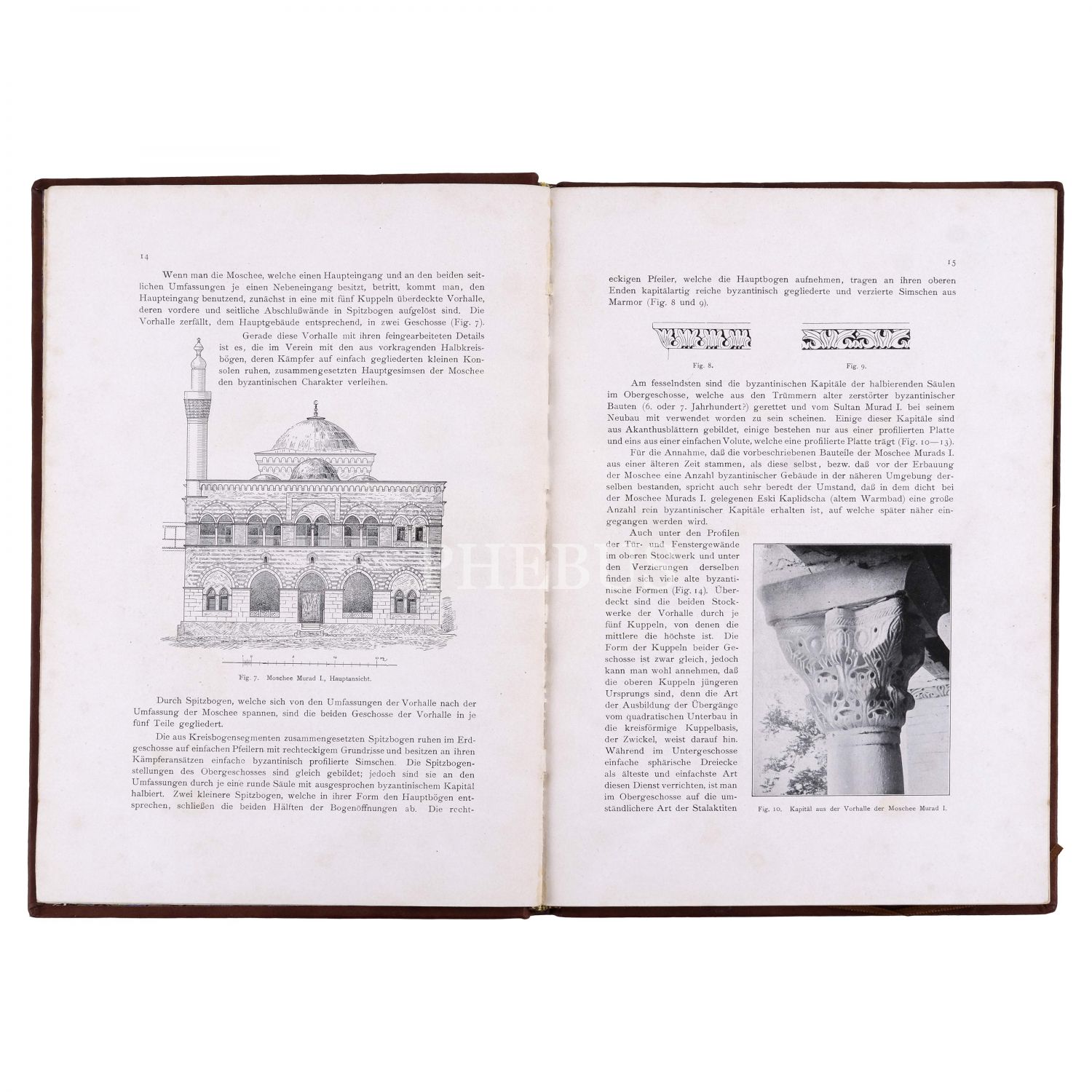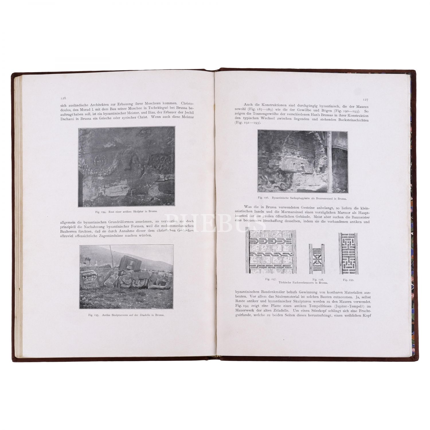 Osmanlı mimarisinin erken dönemdeki gelişiminin Bursa örneği üzerinden incelendiği son derece nadir bir kaynak. Erken Osmanlı mimarisinin Batılı mimarlık literatüründeki ilk akademik çalışmalarından biri olarak kabul edilen kitapta; cami, türbe, medrese, kaplıca, han ve konak mimarisi, zengin görsel malzeme eşliğinde incelenmektedir. Kitap, Cornelius Gurlitt tarafından yayınlanan "Beiträge zur Bauwissenschaft" dizisinin 13. kitabı olarak basılmıştır. Metin içinde bazıları renkli olmak üzere toplam 222 fotoğraf, plan, kroki, relöve, çizim vb. görsel; metin dışında ise 4 renkli levha yer almaktadır. Sırtı panelli ve kapakları dekoratif desenli lüks deri cildinde. İç kapakları ebru desenlidir.