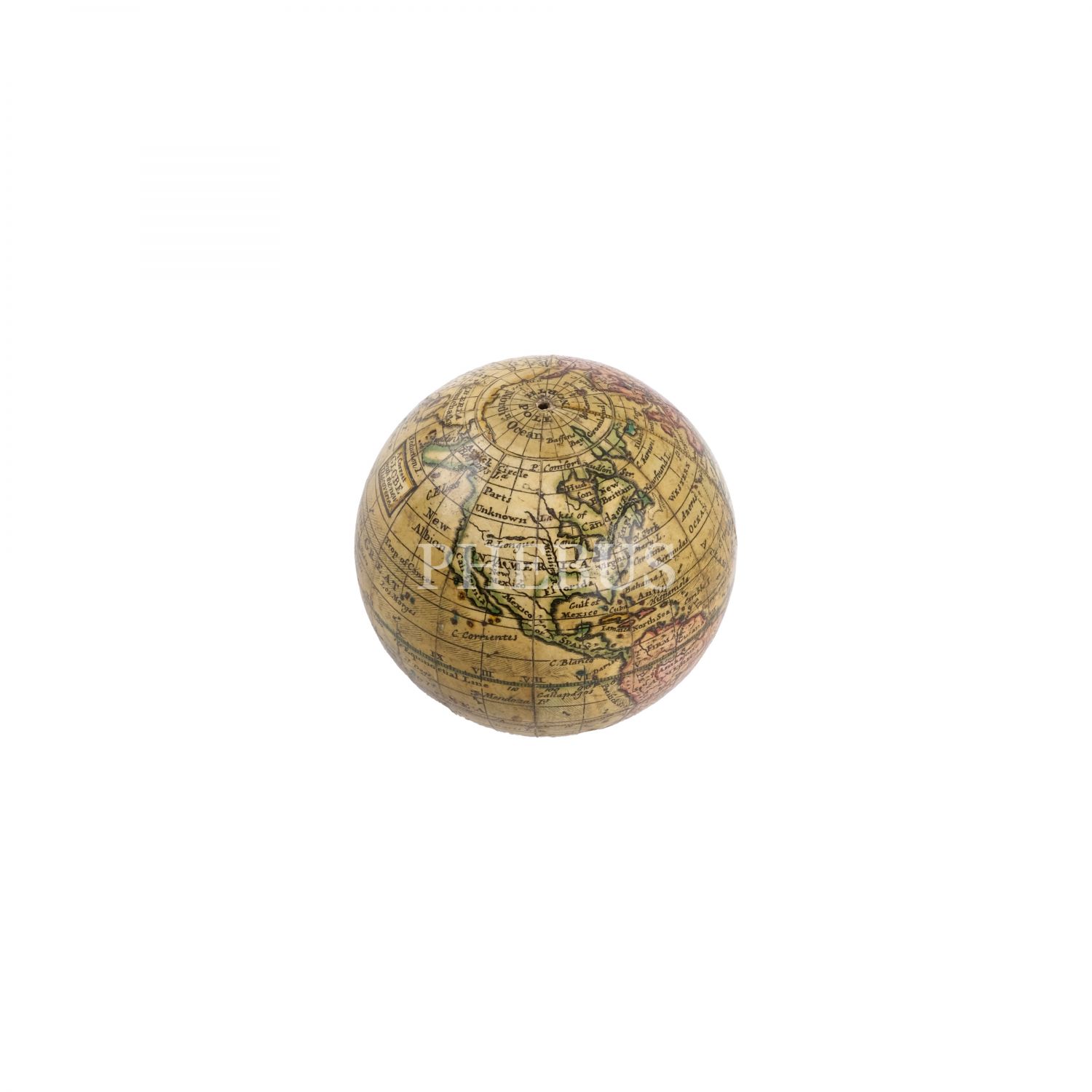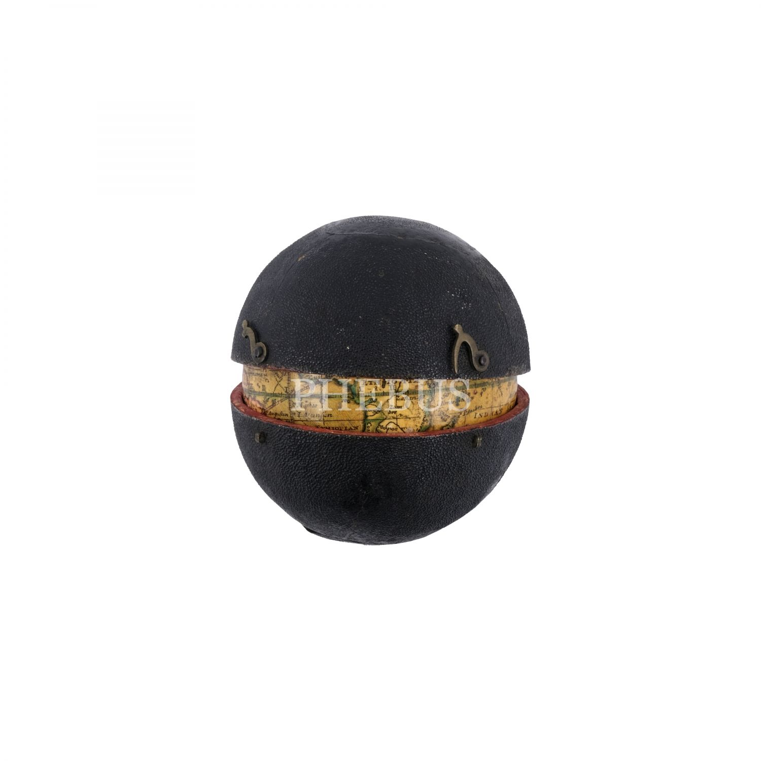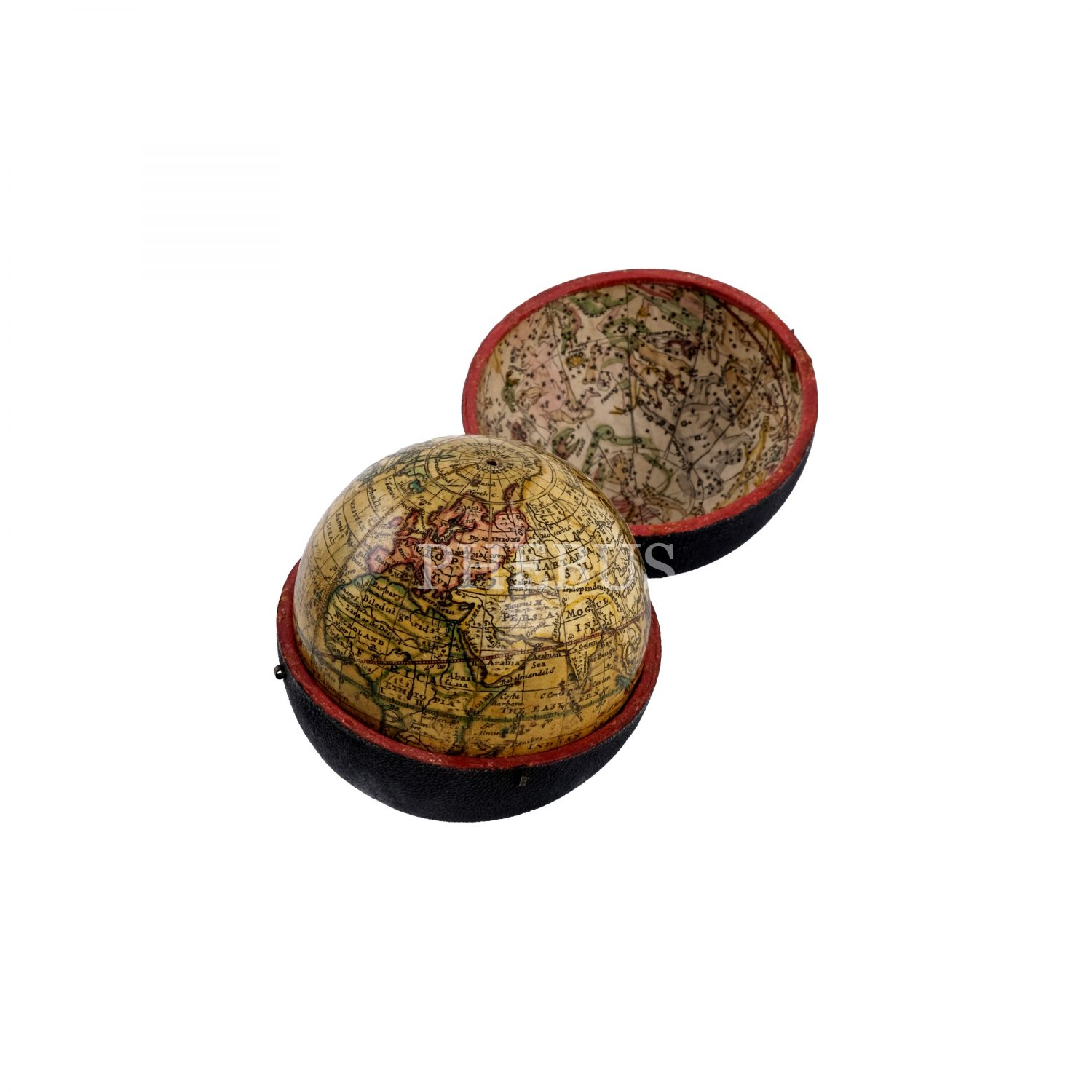 İngiliz kartograf Herman Moll´un 1719 yılında hazırladığı dünya küresi baz alınarak, (yaklaşık) 1775 yılında yeni ilavelerle üretilmiş cep boy dünya küresi, "A Correct GLOBE with the new Discoveries", alçı üzerine kâğıt hamuru (papier-mache), köpekbalığı derisi kaplı, menteşeli orijinal kutusunda, küre çapı 6,5 cm, kutu 7 cm...