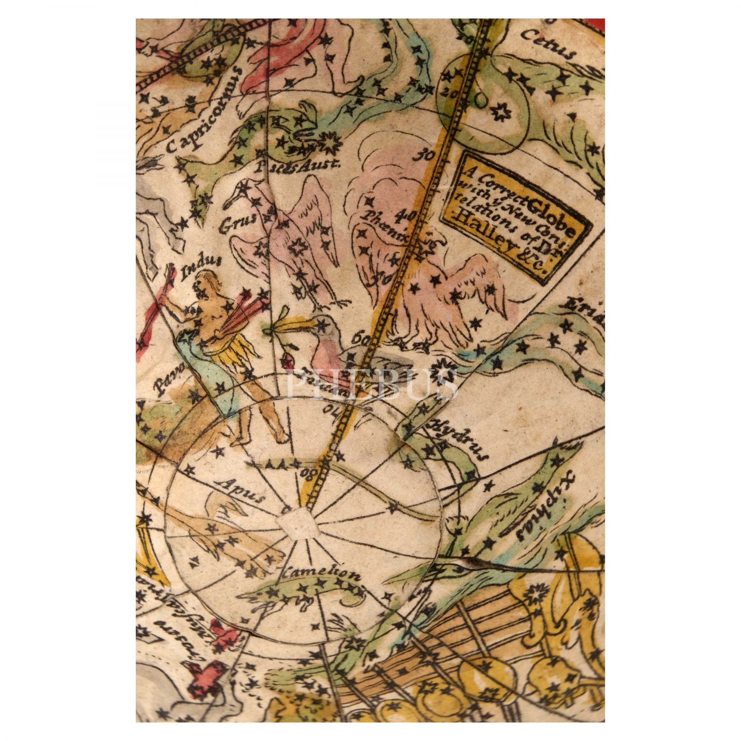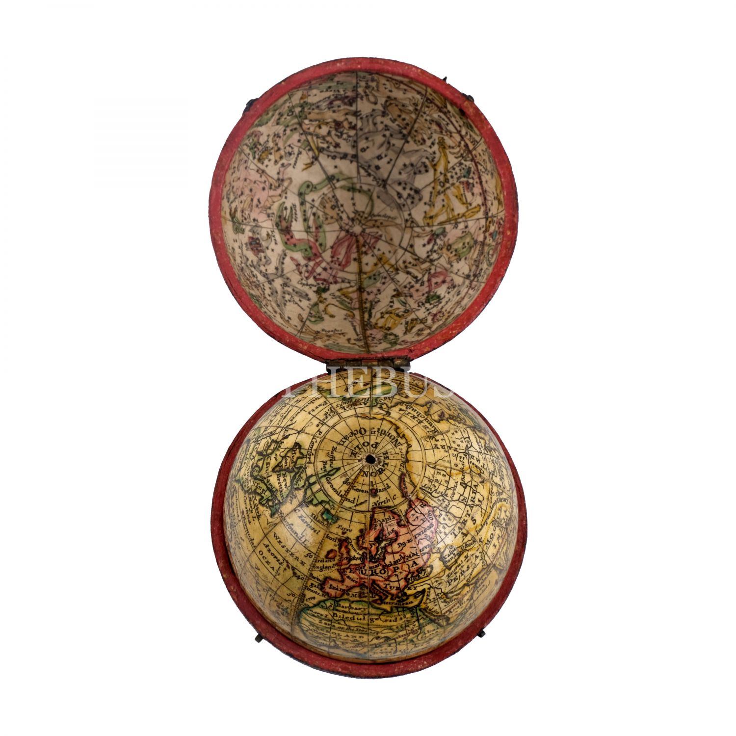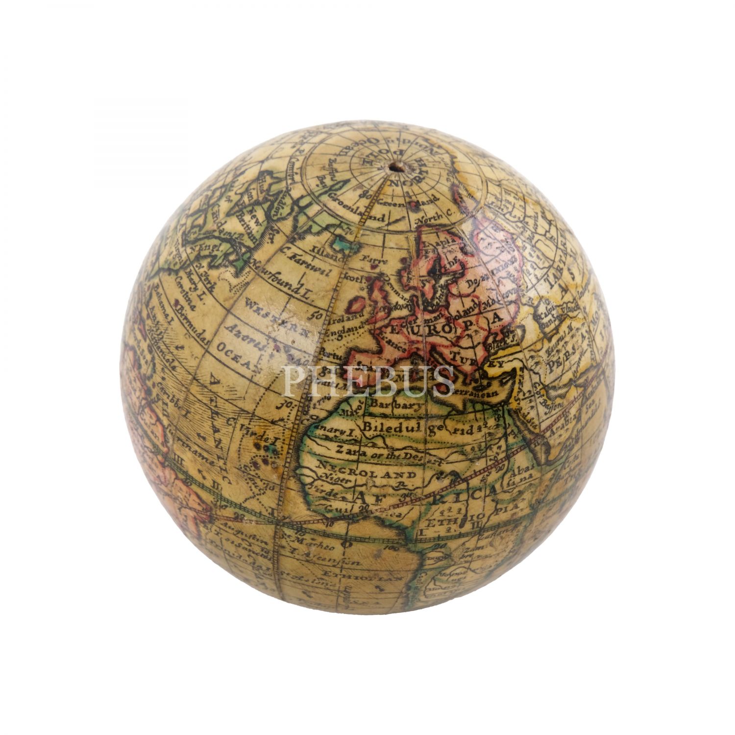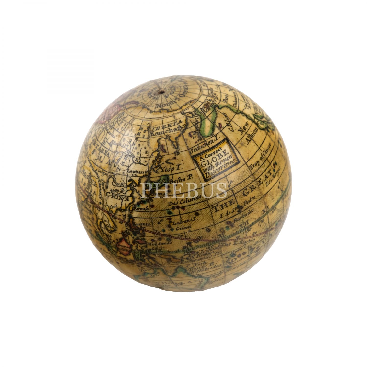 İngiliz kartograf Herman Moll´un 1719 yılında hazırladığı dünya küresi baz alınarak, (yaklaşık) 1775 yılında yeni ilavelerle üretilmiş cep boy dünya küresi, "A Correct GLOBE with the new Discoveries", alçı üzerine kâğıt hamuru (papier-mache), köpekbalığı derisi kaplı, menteşeli orijinal kutusunda, küre çapı 6,5 cm, kutu 7 cm...