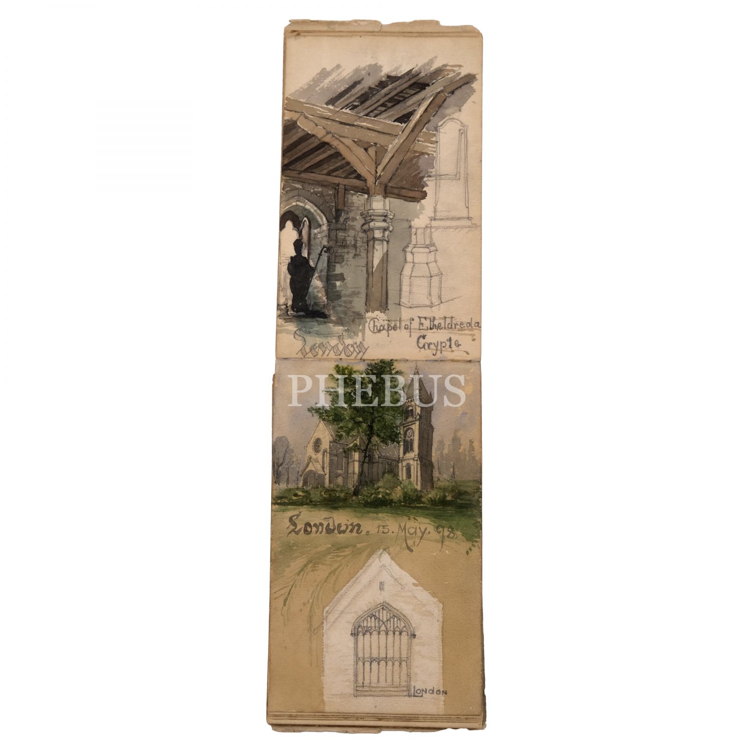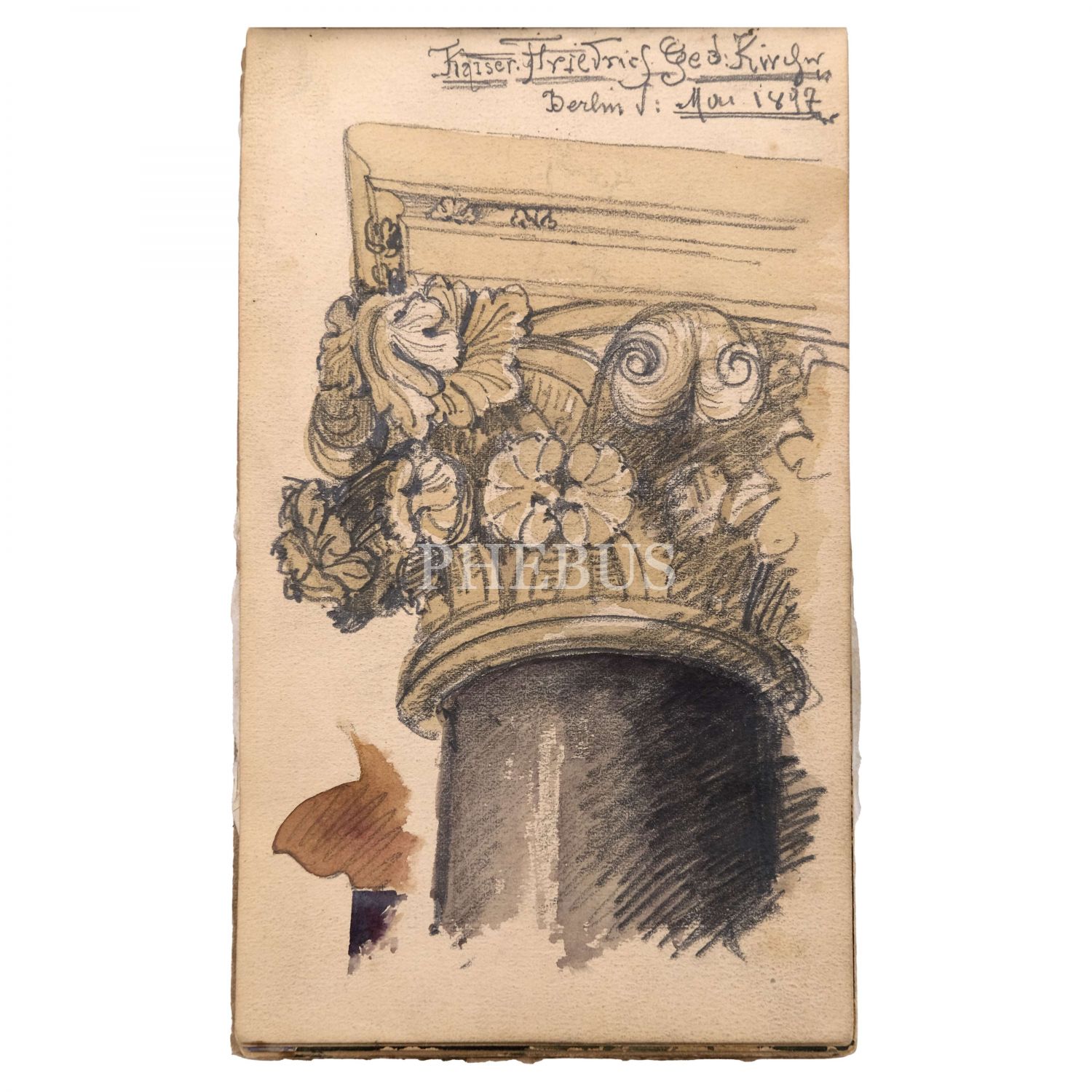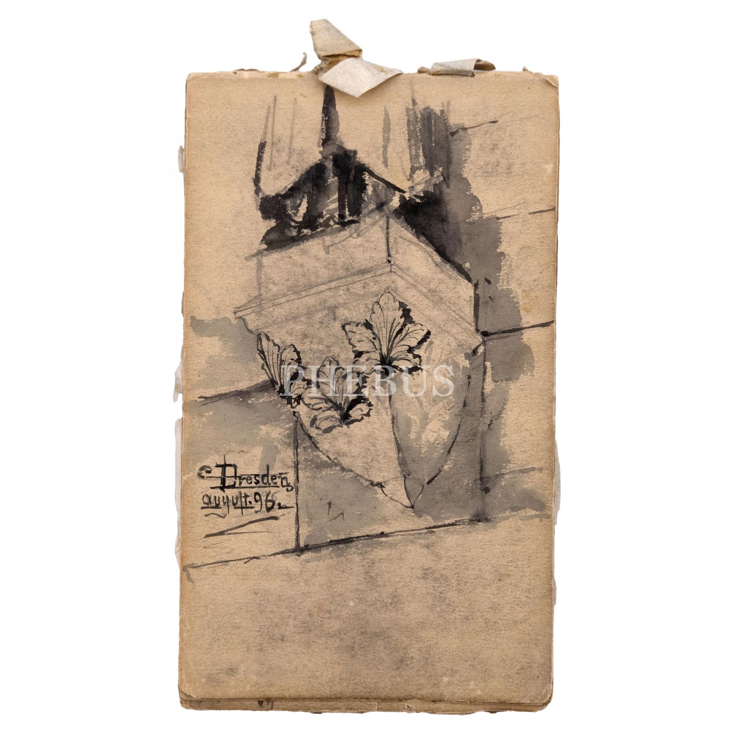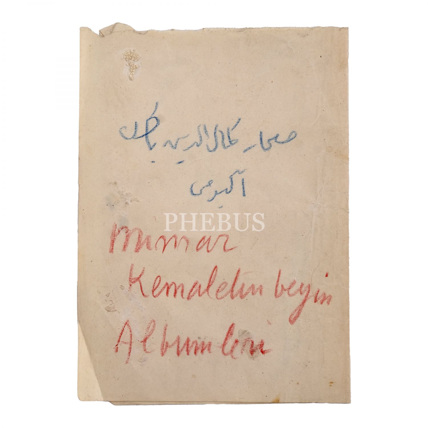 Mimar Kemaleddin´in yurtdışı seyahatlerinde yanında taşıdığı; çoğunlukla çeşitli mimari yapıların harikulade renkli resimlerini ve sütun başları, kemerler gibi detaylarını geçirdiği; seyahatlerinde kendisine eşlik eden simaların portrelerini ve eskiz çizimlerini de içeren resim albümü. Albümün ilk sayfasında Mimar Kemaleddin´in otoportre resmi yer almaktadır, 20x11,5 cm...