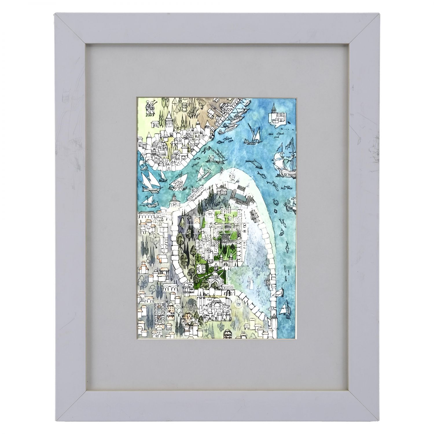 Haliç, Galata Kulesi ve Surları, Kız Kulesi, Ayasofya Camii vd. detayların görüldüğü çizimde imza ve tarih bulunmamaktadır. Çizim 15,5x23 cm, çerçeve 31x39 cm.