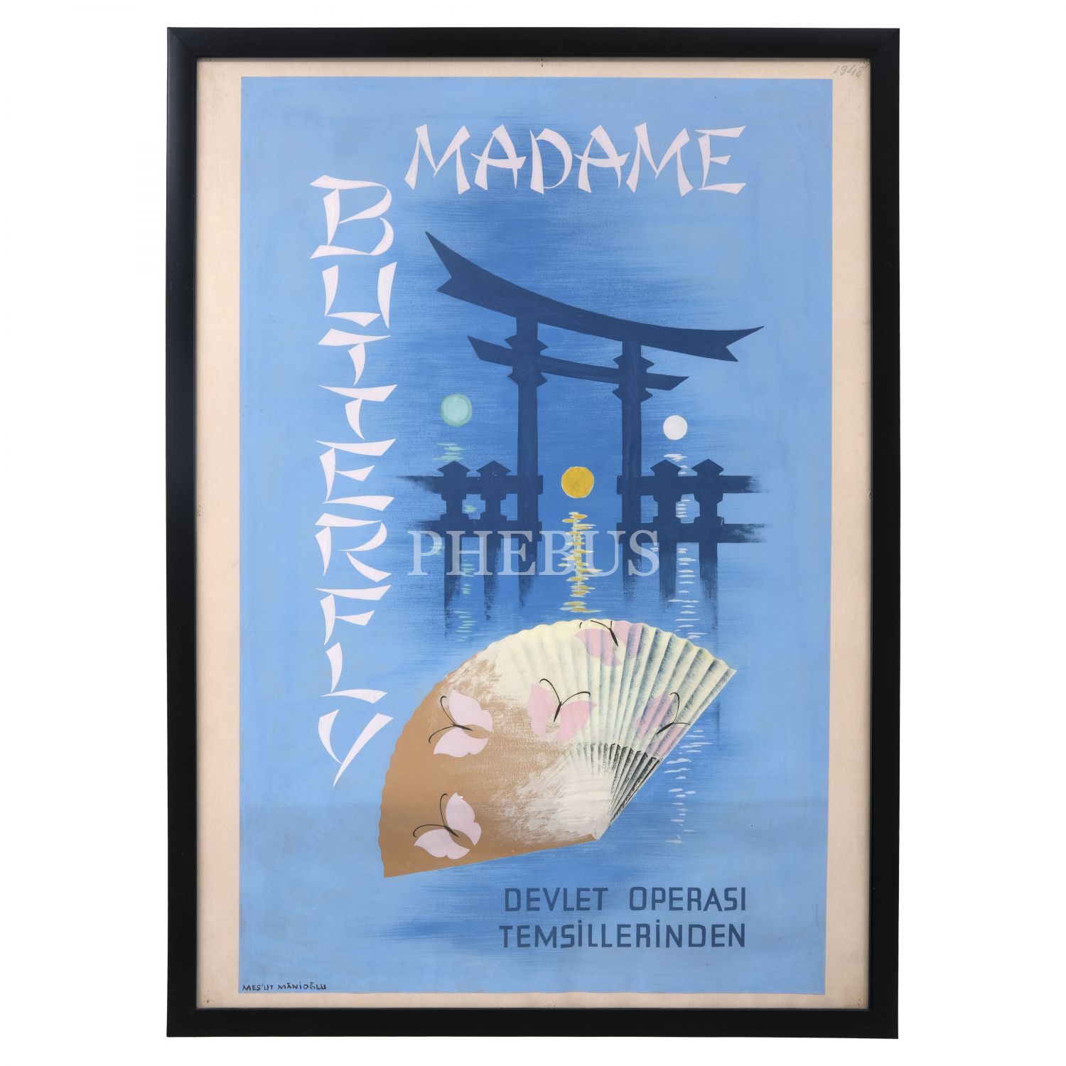 Mesut Manioğlu´ndan ıslak imzalı, "Madam Butterfly - Devlet Operası Temsillerinden" yazılı, orijinal çizim duyuru afişi, 1948 tarihli, kâğıt üzerine karışık teknik, çerçevesiyle birlikte 76x106 cm...