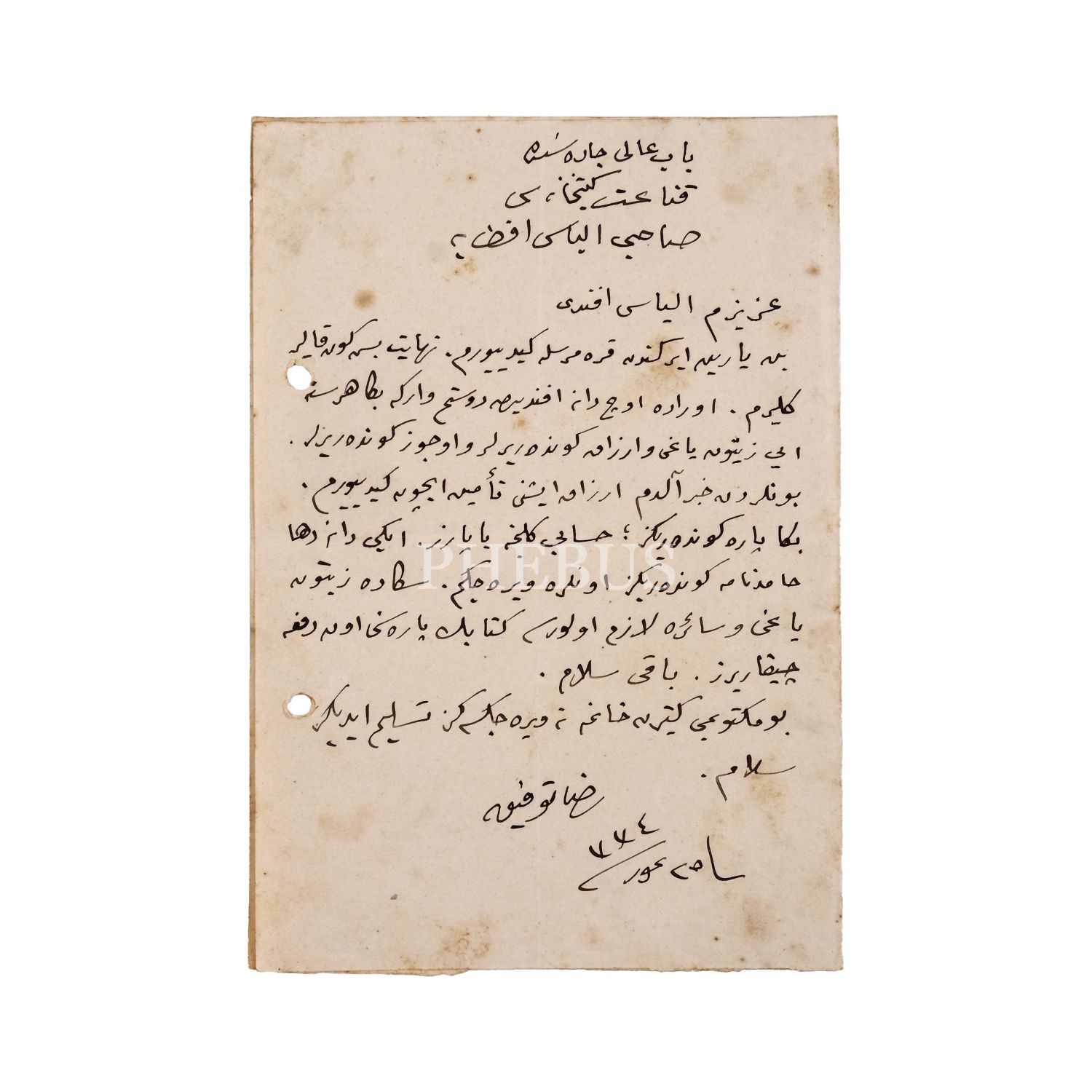 "Bab-ı Ali Caddesi´nde Kanaat Kütüphanesi sahibi İlyas Efendiye; Azizim İlyas Efendi, Ben yarın erkenden Karamürsel´e gidiyorum. Nihayet beş gün kalır gelirim. Orada üç tane efendiden dostum var ki bana her sene iyi zeytinyağı ve erzak gönderirler ve ucuz gönderirler. Bunlardan haber aldım; erzak işini temin için gidiyorum. Bana para gönderiniz; hesabı gelince yaparız. İki tane daha Hamitname gönderiniz; onlara vereceğim. Sana da zeytinyağı vesaire lazım olursa kitabın parasını on defa çıkarırız. Baki selam. Bu mektubumu getiren hanıma ne verecekseniz teslim ediniz. Selam."