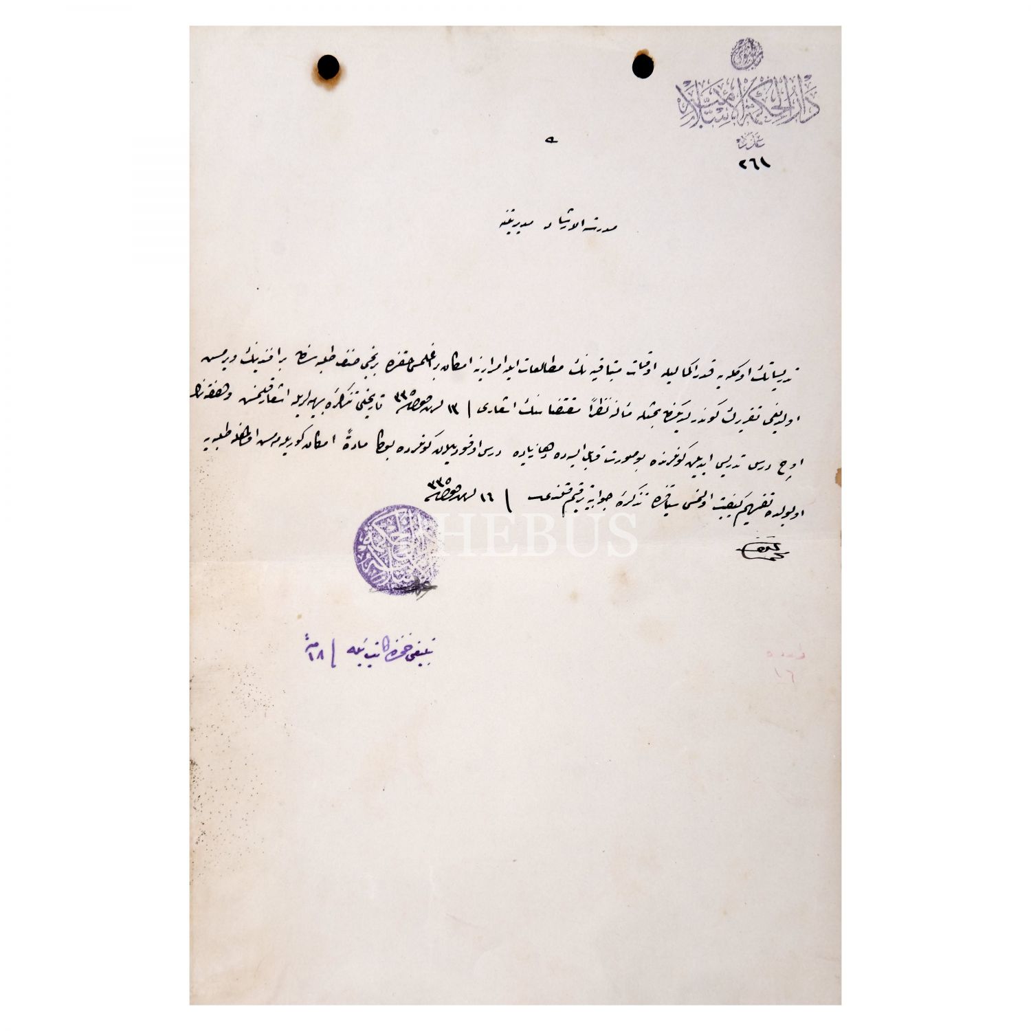 Darü´l-Hikmeti´l-İslâmiyye antetli kâğıt üzerine kaleme alınan evrak, öğrencilerin ders saatlerinin öğleye kadarla sınırlı tutulup geri kalan vakitlerinin okumayla geçirilmesi hakkında kaleme alınmıştır.