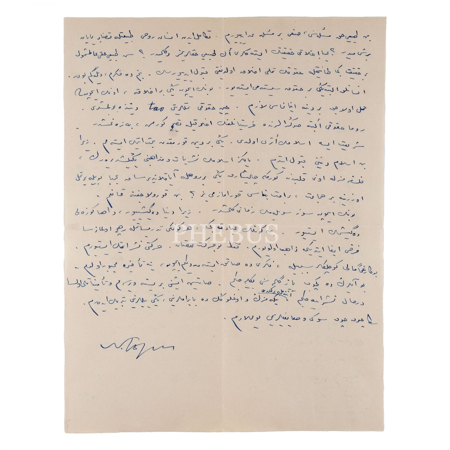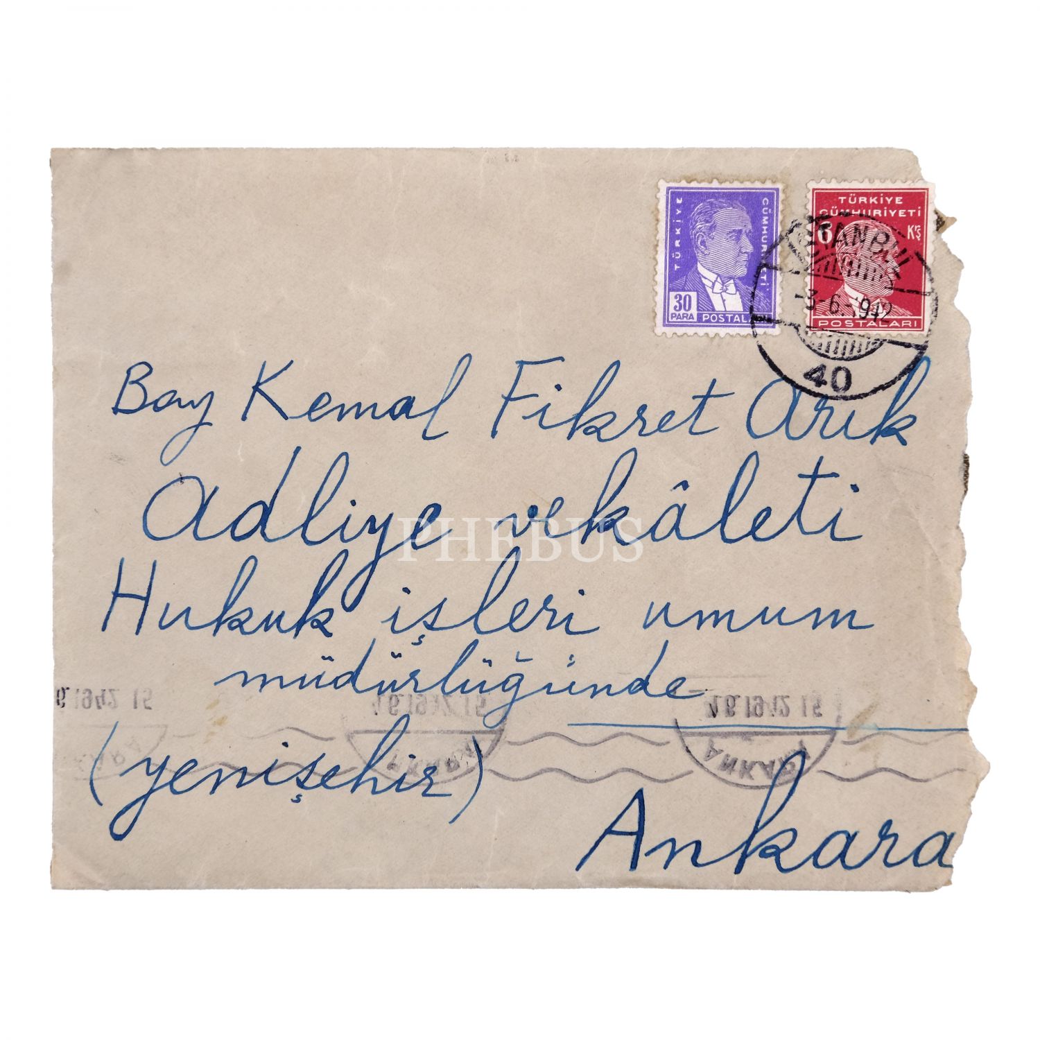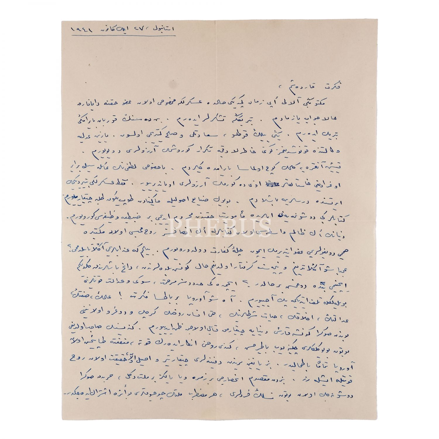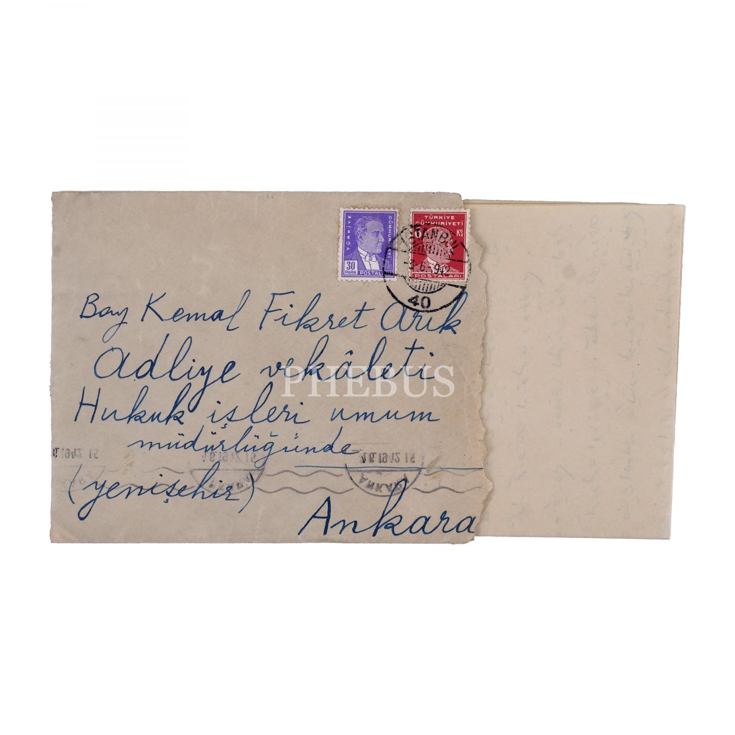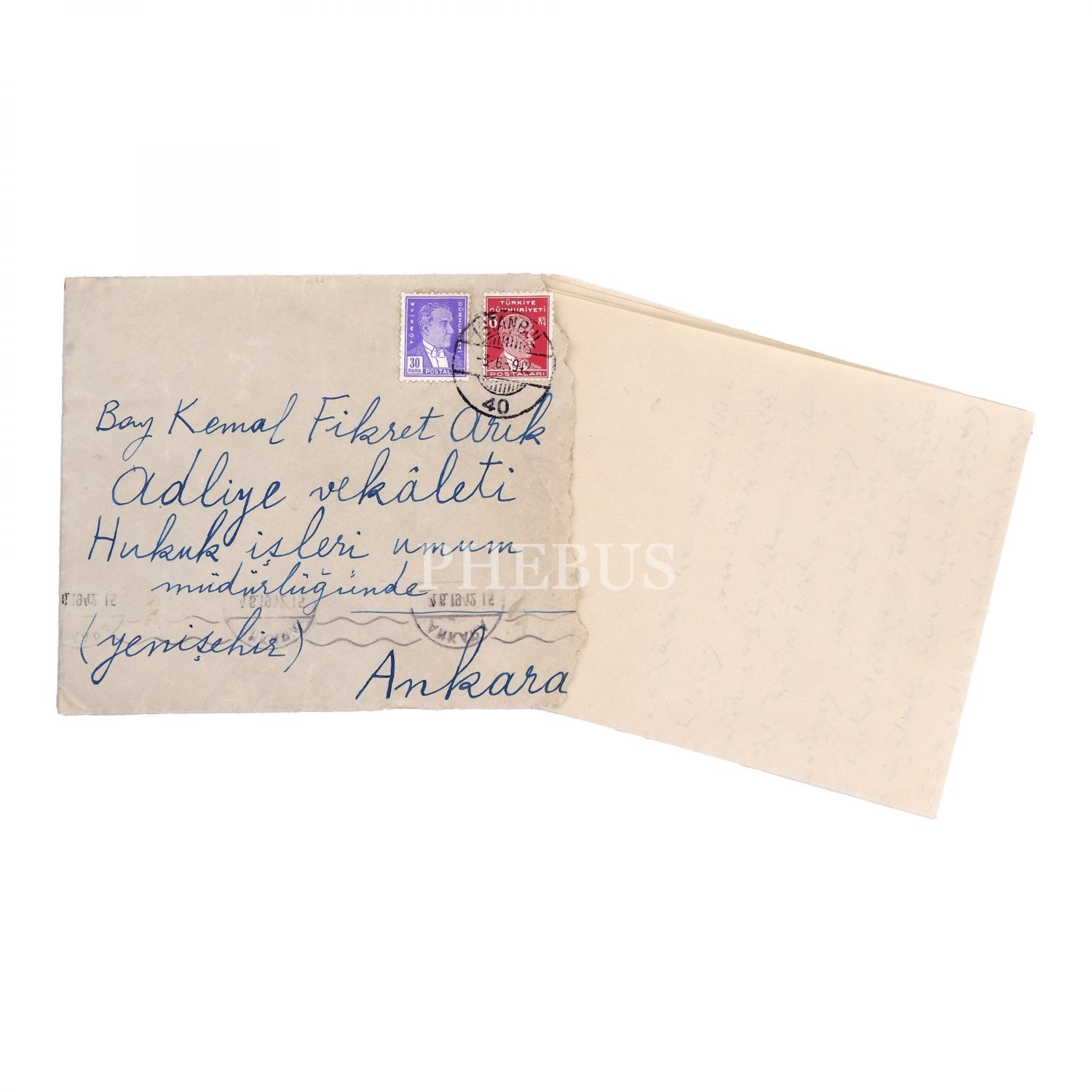 Nurettin Topçu´nun, Fikret Arık´a "Fikret kardeşim" hitabıyla başlayan, 27 Ocak 1941 tarihli el yazısı mektubu ve zarfı, 23x29 cm...