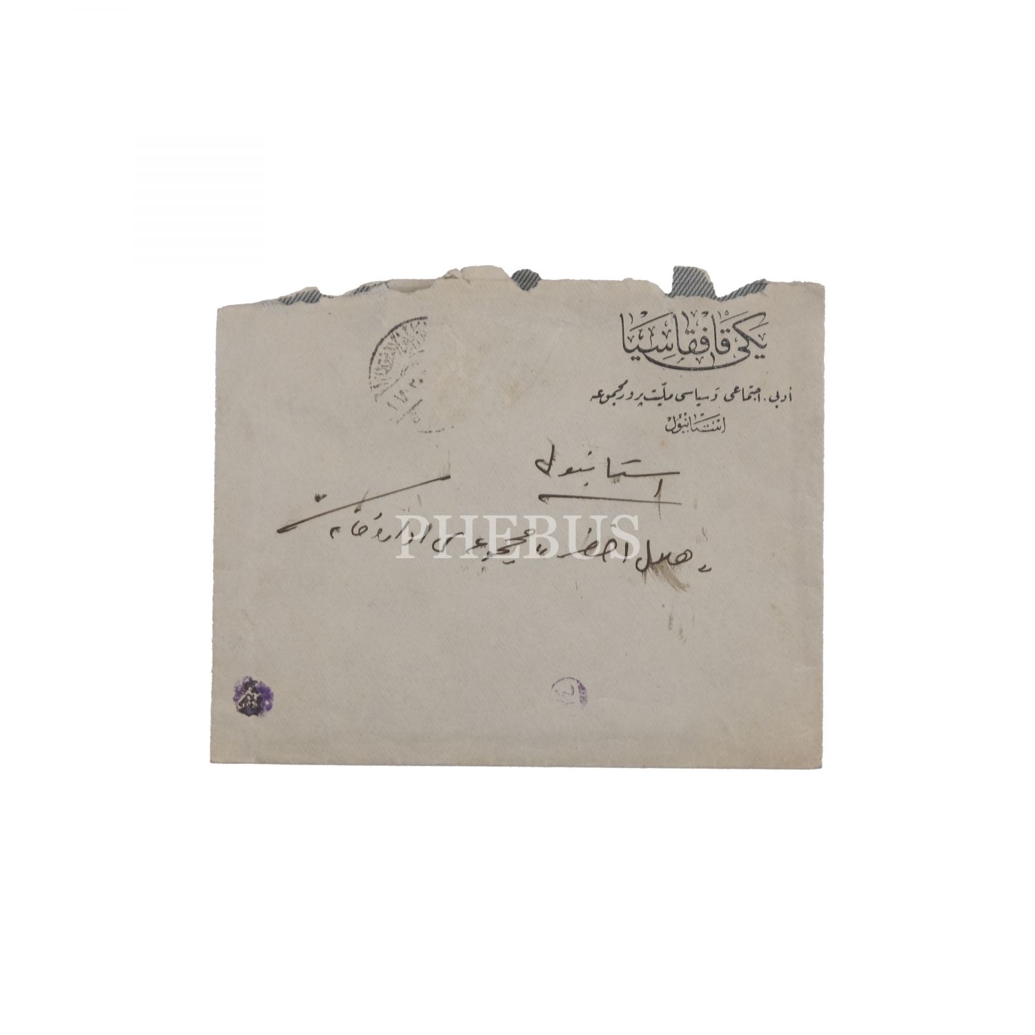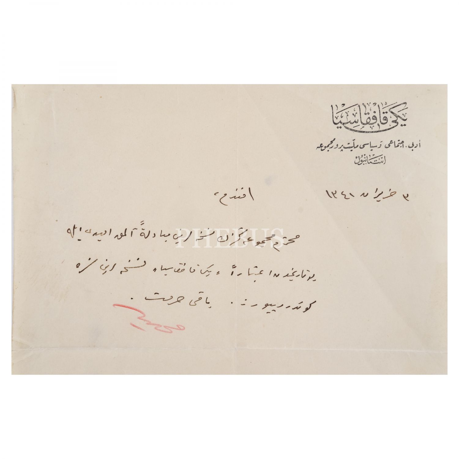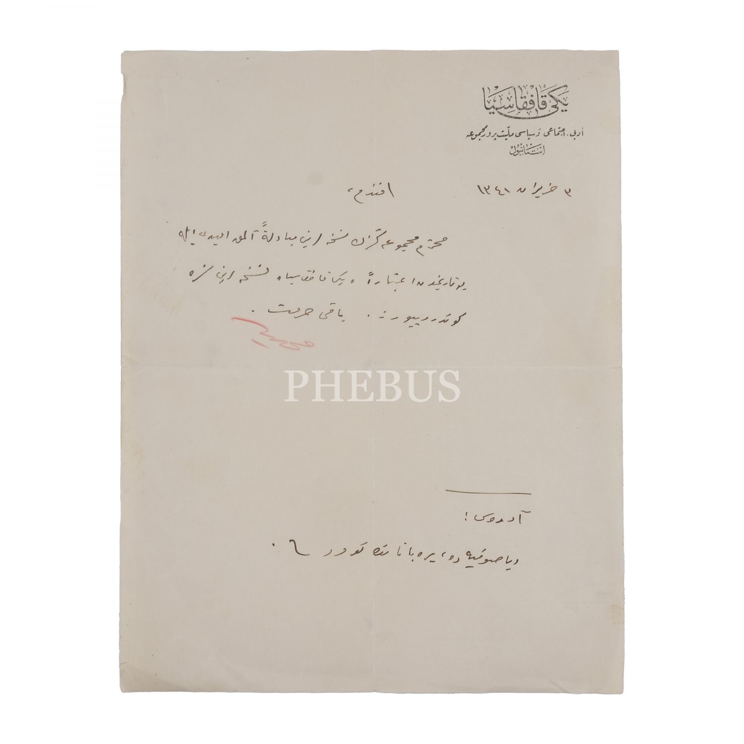 Azerbaycan istiklal hareketinin öncüsü, gazeteci ve yazar Mehmet Emin Resulzade´nin, Hilal-i Ahzar (Yeşilay) İdaresi´ne "Yeni Kafkasya" antetli kağı üzerine el yazısıyla kaleme alıp gönderdiği ıslak imzalı mektubu ve zarfı, 2 Haziran 1341, 21x28 cm...