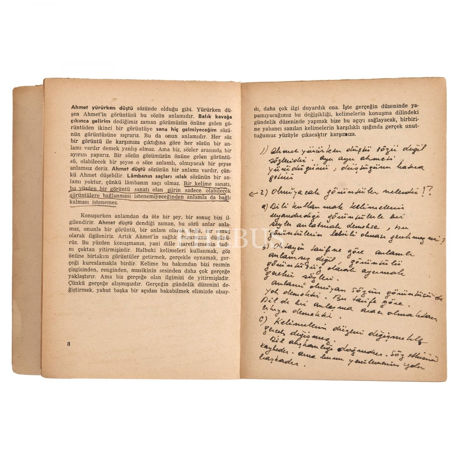 "Sevgili kardeşim Necati´ye hasretle" ithafıyla, 26 Kasım 1956 tarihinde imzalanmıştır. 9., 10. ve son sayfalarda, Necati Cumalı´nın kitabı ilgiyle okuduğunu gösteren okuma notları yer almaktadır. Oktay Rifat kitabında, bir dili kullanmanın, kelimelerin zihinde uyandırdığı görüntülerin yardımıyla bir şey anlatmak demek olduğunu iddia etmiş; "Bir sözün anlamı, çoğu zaman o sözün gözümüzün önüne getirdiği görüntüden başka bir şey değildir." ifadesi ve "Ahmet yürürken düştü sözünde olduğu gibi. Yürürken düşen Ahmet´in görüntüsü bu sözün anlamıdır." örneğiyle iddiasını pekiştirmiştir. İlgili satırların altını çizen Necati Cumalı ise kenar boşluğuna bu görüşe karşı uzun bir açıklama notu düşmüştür. Cumalı, notuna; "Ahmet yürürken düştü" örneğini düzelterek başlar: "1) "Ahmet yürürken düştü sözü değil sözleridir. Ayrı ayrı Ahmeti, yürüdüğünü, düştüğünü hatıra getirir..." Cumalı, kitabın sonuna da üç maddelik bir not kaleme almış; "Kişilik sahibi üç beş şair var bizde, bu şiirlerin yarım yamalak anlaşılması, taklidi, nereye götürür bizi? Şüphesiz taklidi hemen yayılacaktır..." maddesiyle başladığı yazısının devamında, bütünden yoksun olan "taklit" şiirlerin ne derece güzel olabileceğini sorgulamıştır. Resimler: Rasih Güran - Kapak kompozisyonu: Oktay Rifat