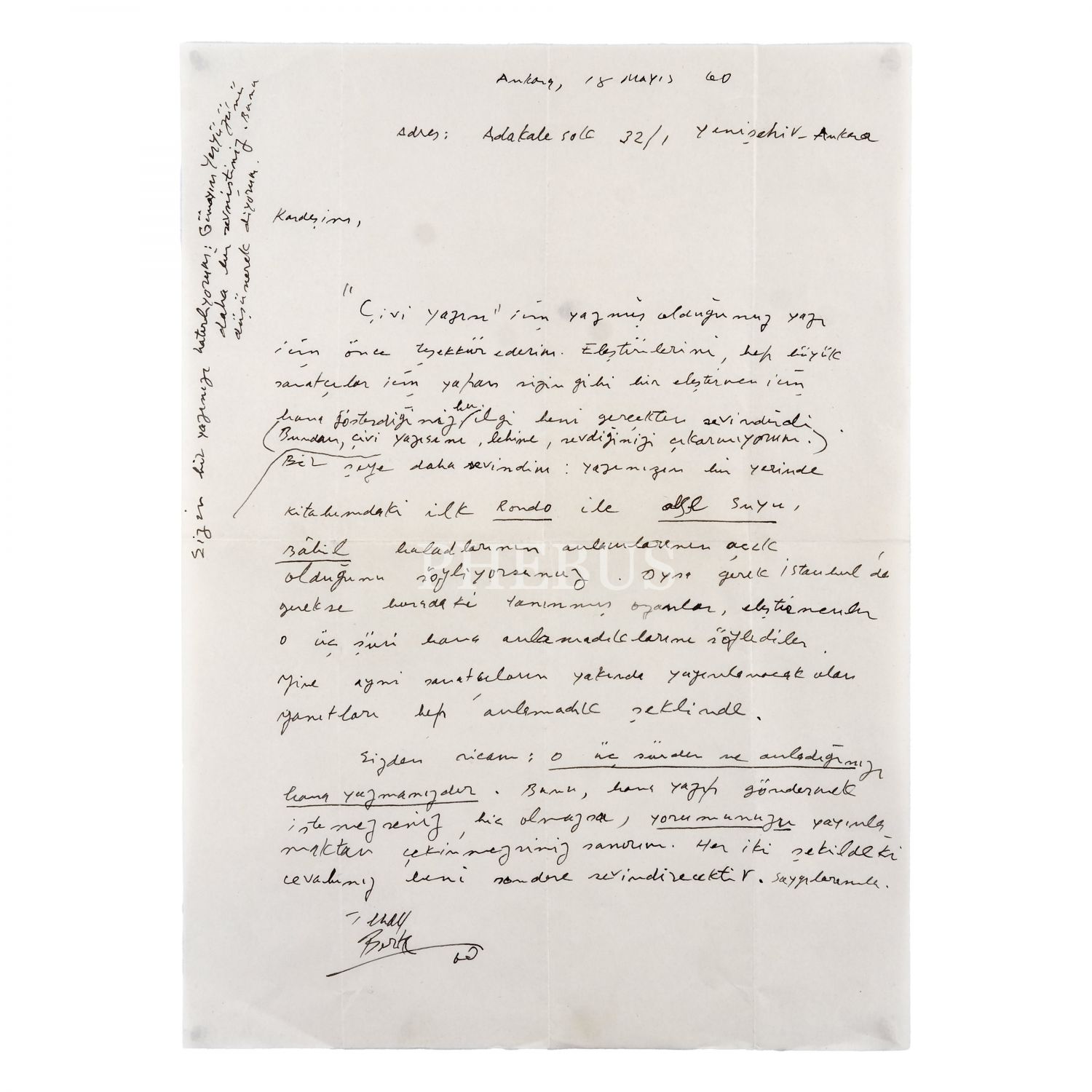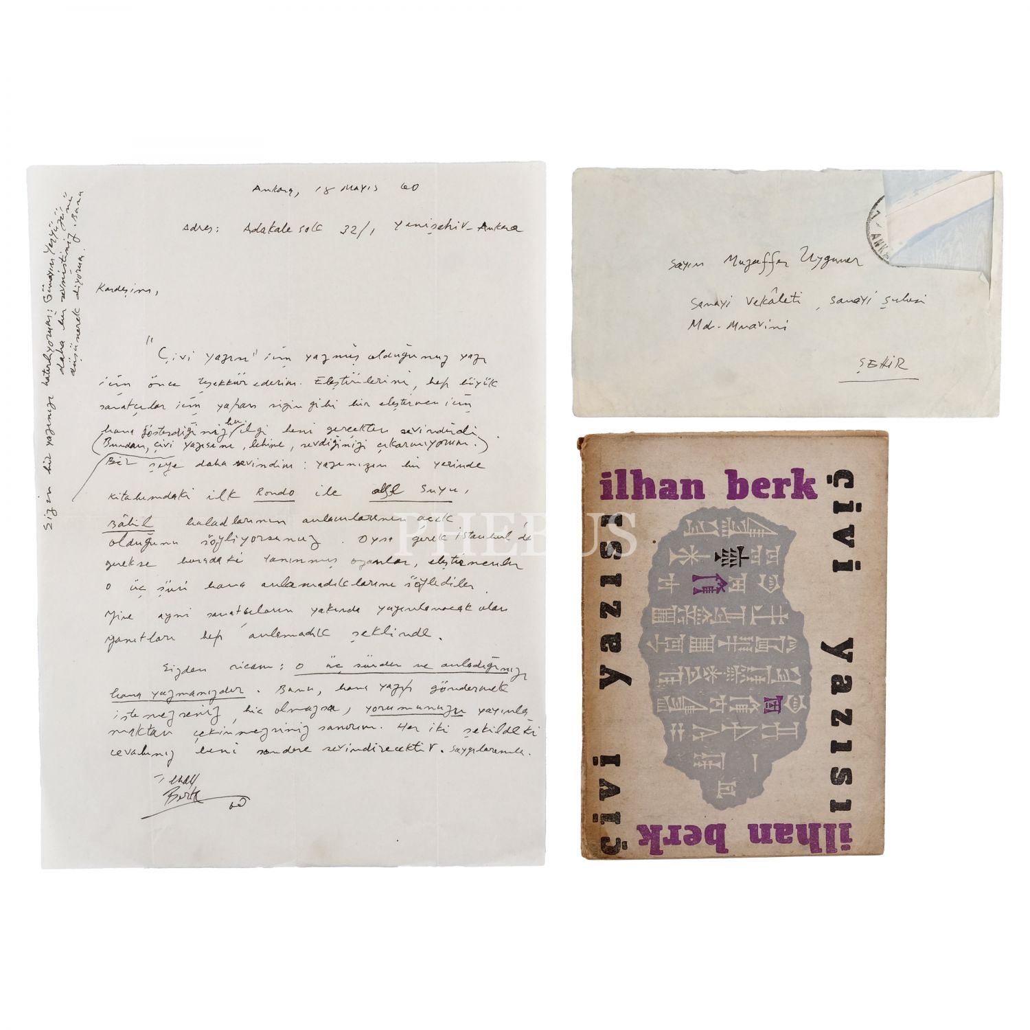 "Ankara, 18 Mayıs 60. Kardeşim, ´Çivi Yazısı´ için yazmış olduğunuz yazı için önce teşekkür ederiz. Eleştirilerini, hep büyük sanatçılar için yapan sizin gibi bir eleştirmen için bana gösterdiğiniz bu ilgi beni gerçekten sevindirdi. (Bundan, Çivi Yazısını, lehine, sevdiğinizi çıkarmıyorum. Sizin bir yazınızı hatırlıyorum; Günaydın Yeryüzü´nü daha bir sevmiştiniz. Bunu düşünerek diyorum.) Bir şeye daha sevindim: Yazınızın bir yerinde kitabımdaki ilk Rondo ile Alfe Suyu, Bâbil baladlarımın anlamlarının açık olduğunu söylüyorsunuz. Oysa gerek İstanbul´da gerekse buradaki tanınmış ozanlar, eleştirmenler o üç şiiri bana anlamadıklarını söylediler. Yine aynı sanatçıların yakında yayınlanacak olan yanıtları hep anlamadık şeklinde. Sizden ricam; o üç şiirden ne anladığınızı bana yazmanızdır. Bunu, bana yazıp göndermek istemezseniz, hiç olmazsa, yorumunuzu yayınlamaktan çekinmezsiniz sanırım. Her iki şekildeki cevabınız beni son derece sevindirecektir. Saygılarımla, İlhan Berk"