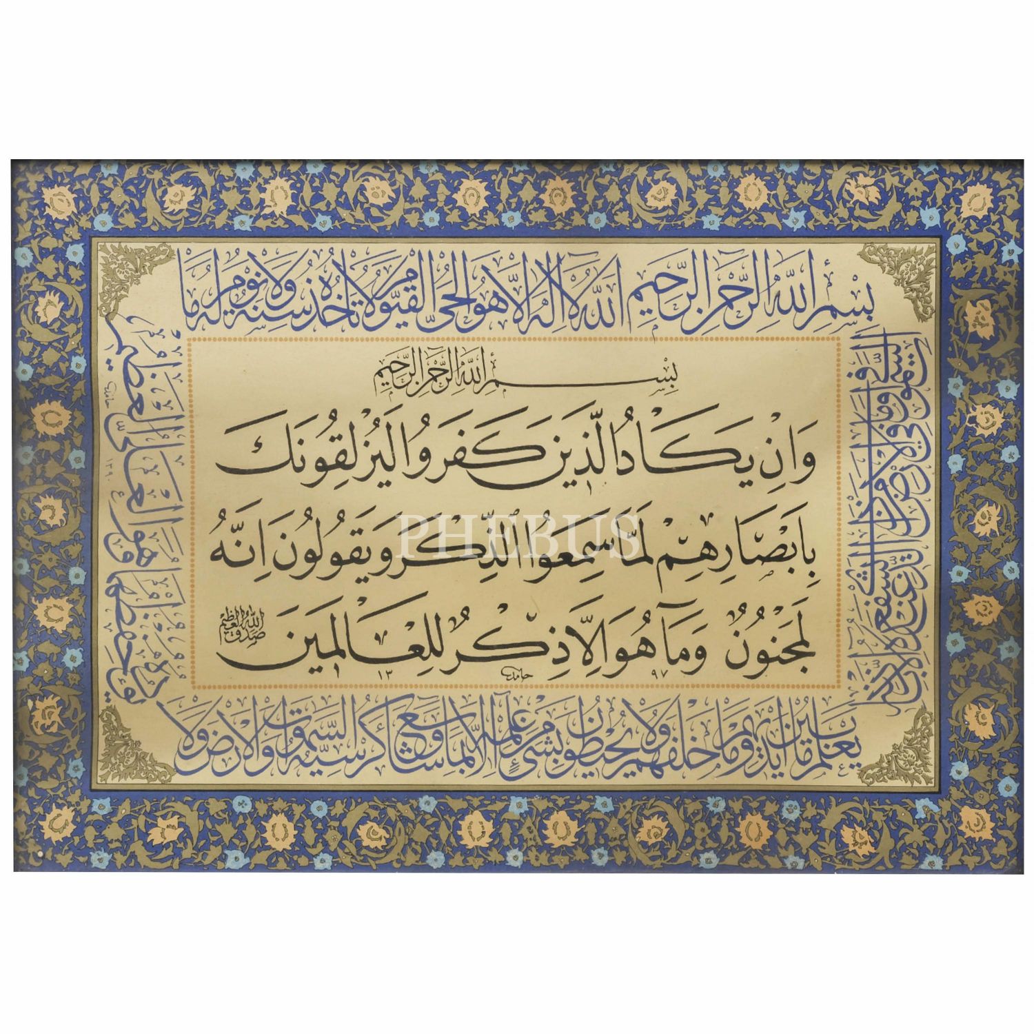 Hâmid Aytaç hattından sülüs-nesih baskı Âyetelkürsî ve Nazar âyeti.