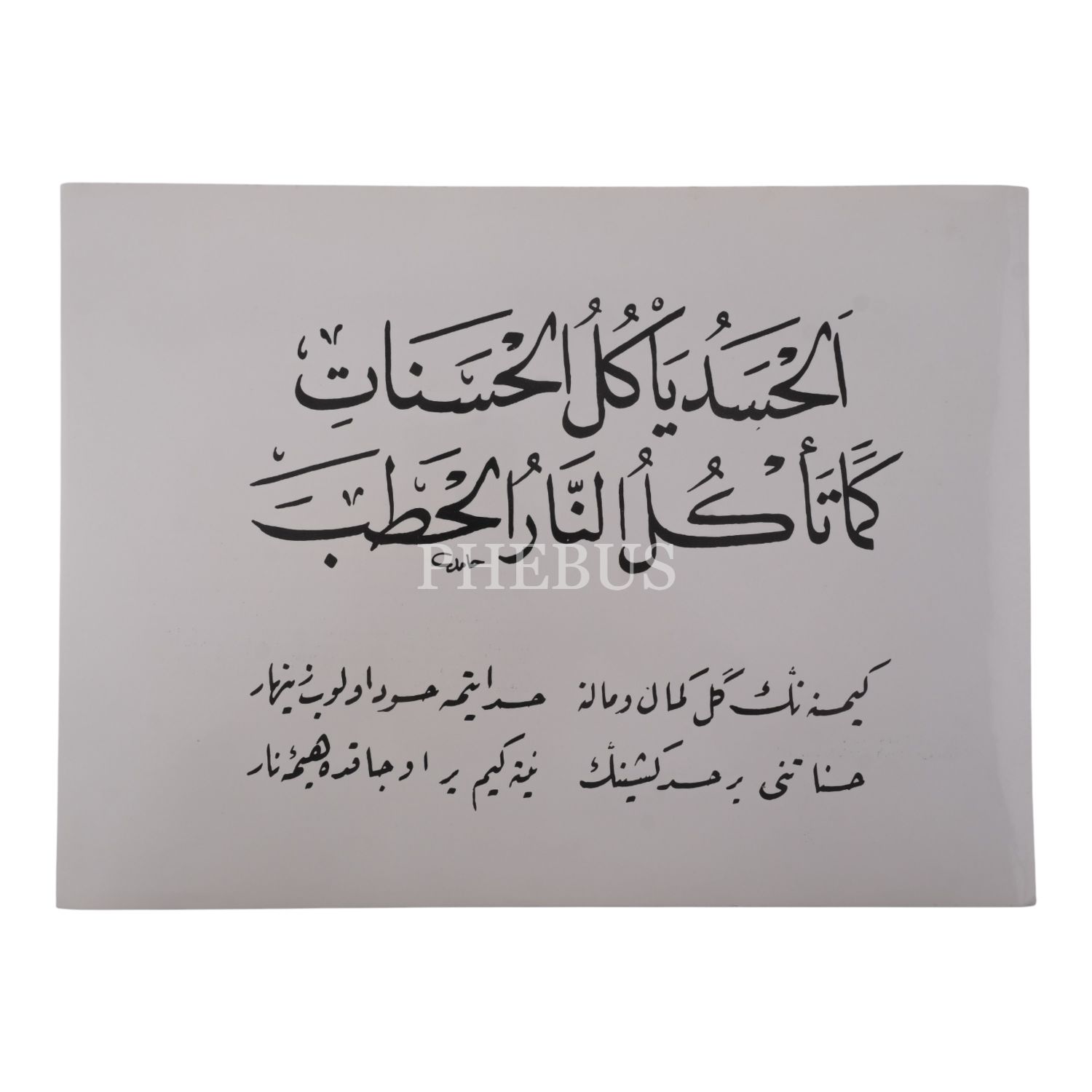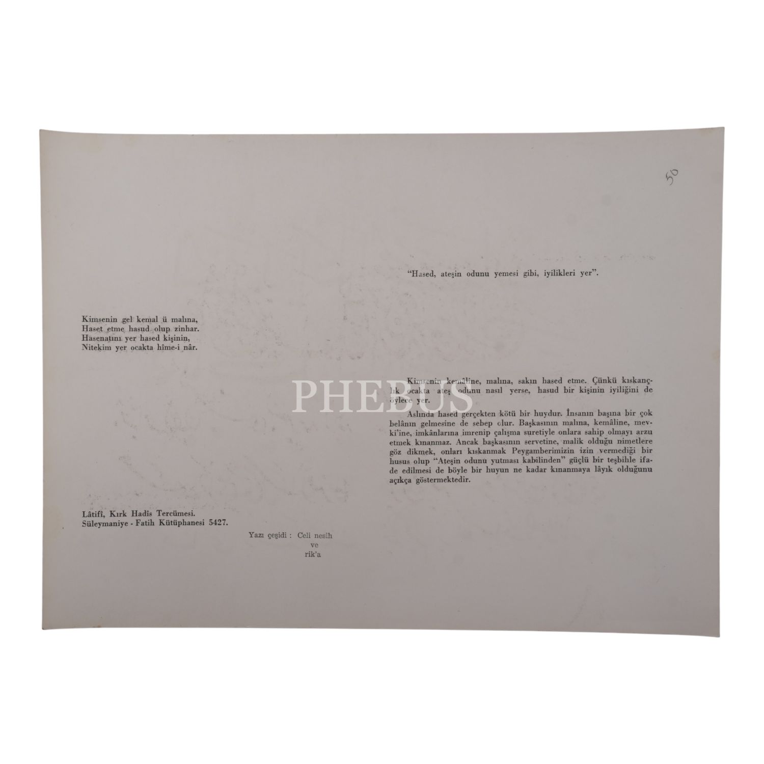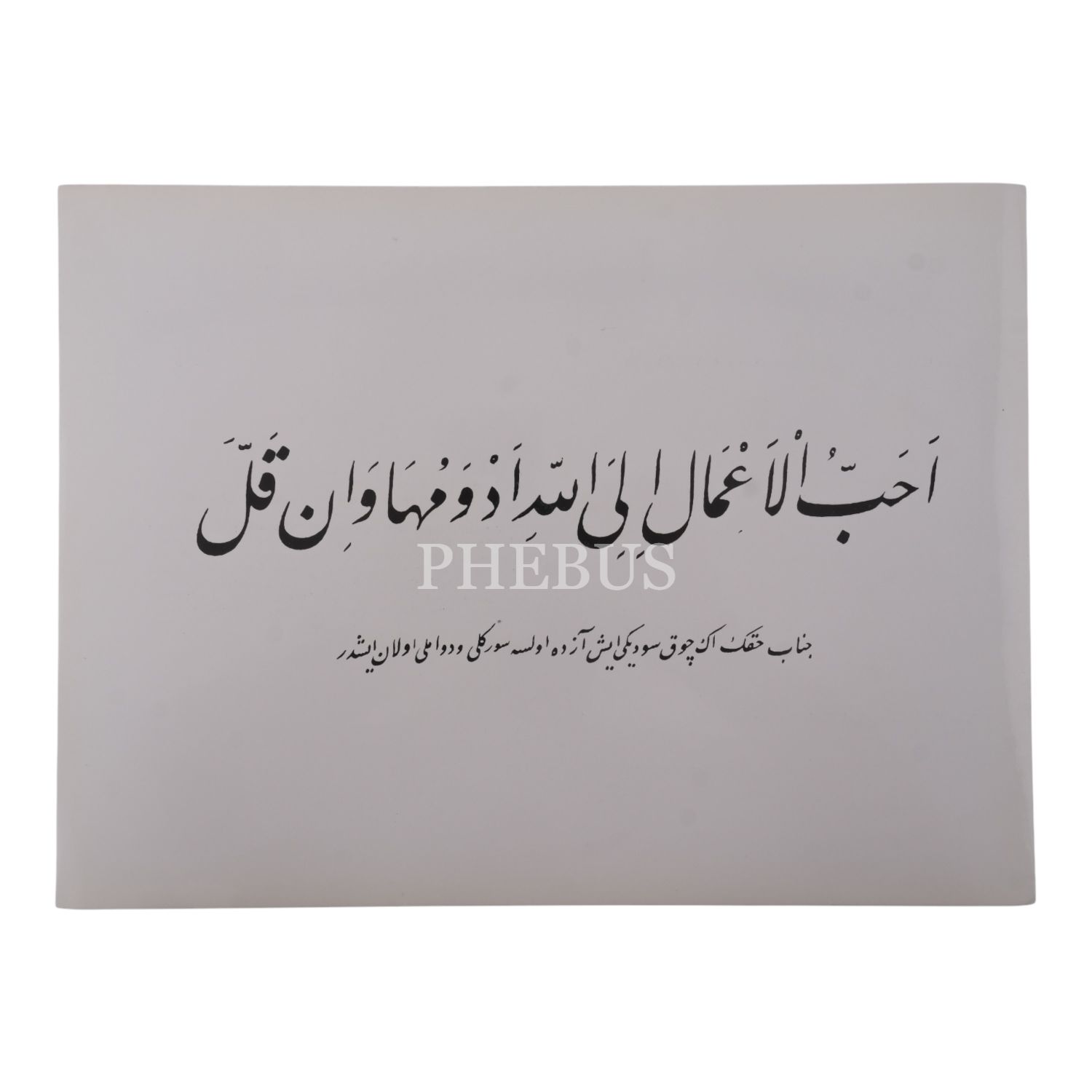 Arka yüzlerinde yazıların latin alfabesiyle okunuşu ve anlamlarının yazdığı sülüs, talik, rika ve divânî hüsnihat yazıları.