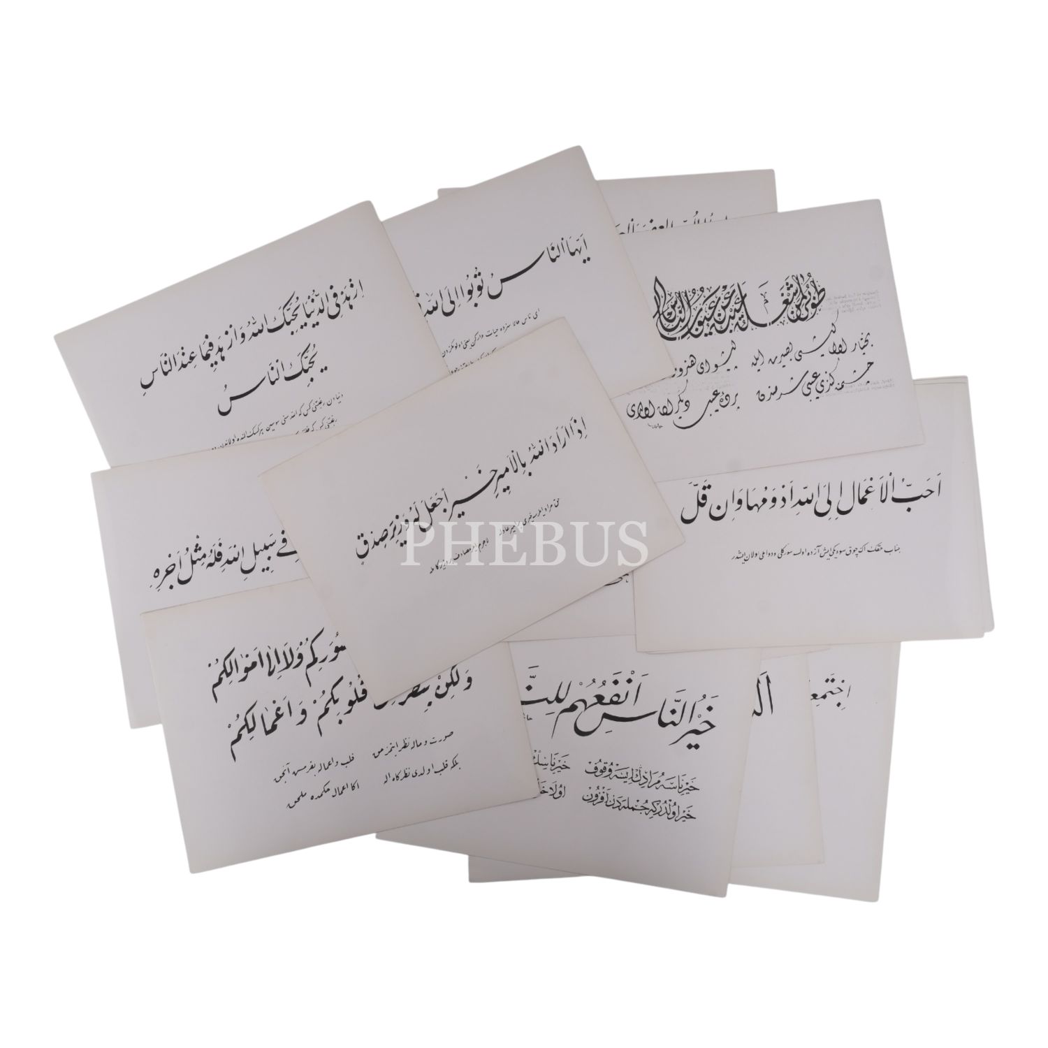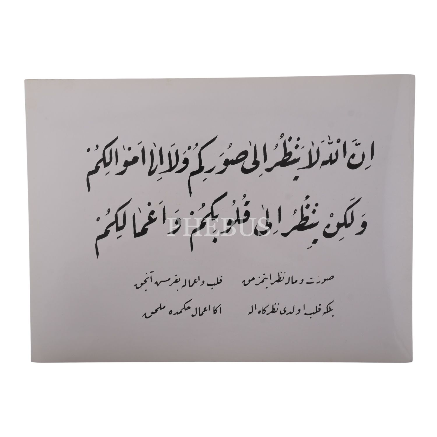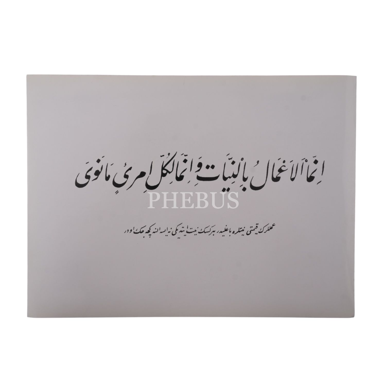 Arka yüzlerinde yazıların latin alfabesiyle okunuşu ve anlamlarının yazdığı sülüs, talik, rika ve divânî hüsnihat yazıları.