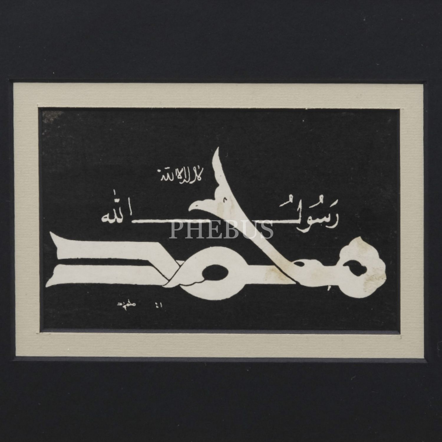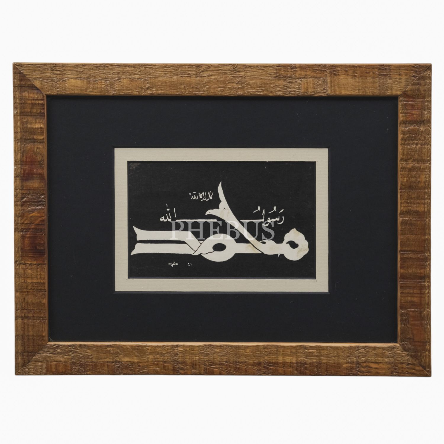 Mahmud ketebeli baskı kûfî kelime-i tevhid, yazı ölçü: 13x8 cm, çerçeve içi ölçü: 24x17 cm...